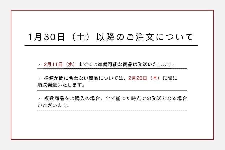 ご準備が間に合わない商品については、2月26日(木)以降に順次発送いたします。