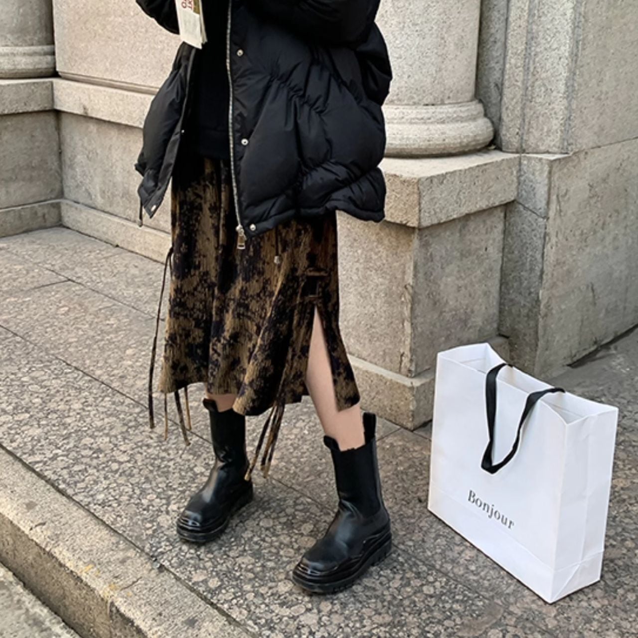 フロントのスリットが抜け感をプラスし、歩くたびに軽やかな印象を与えます。