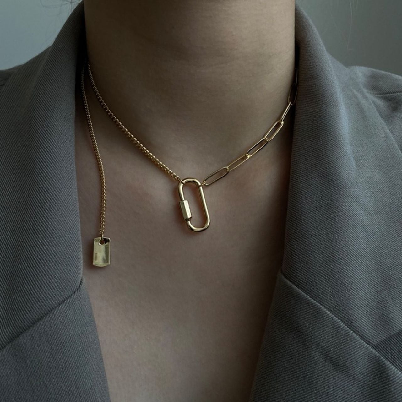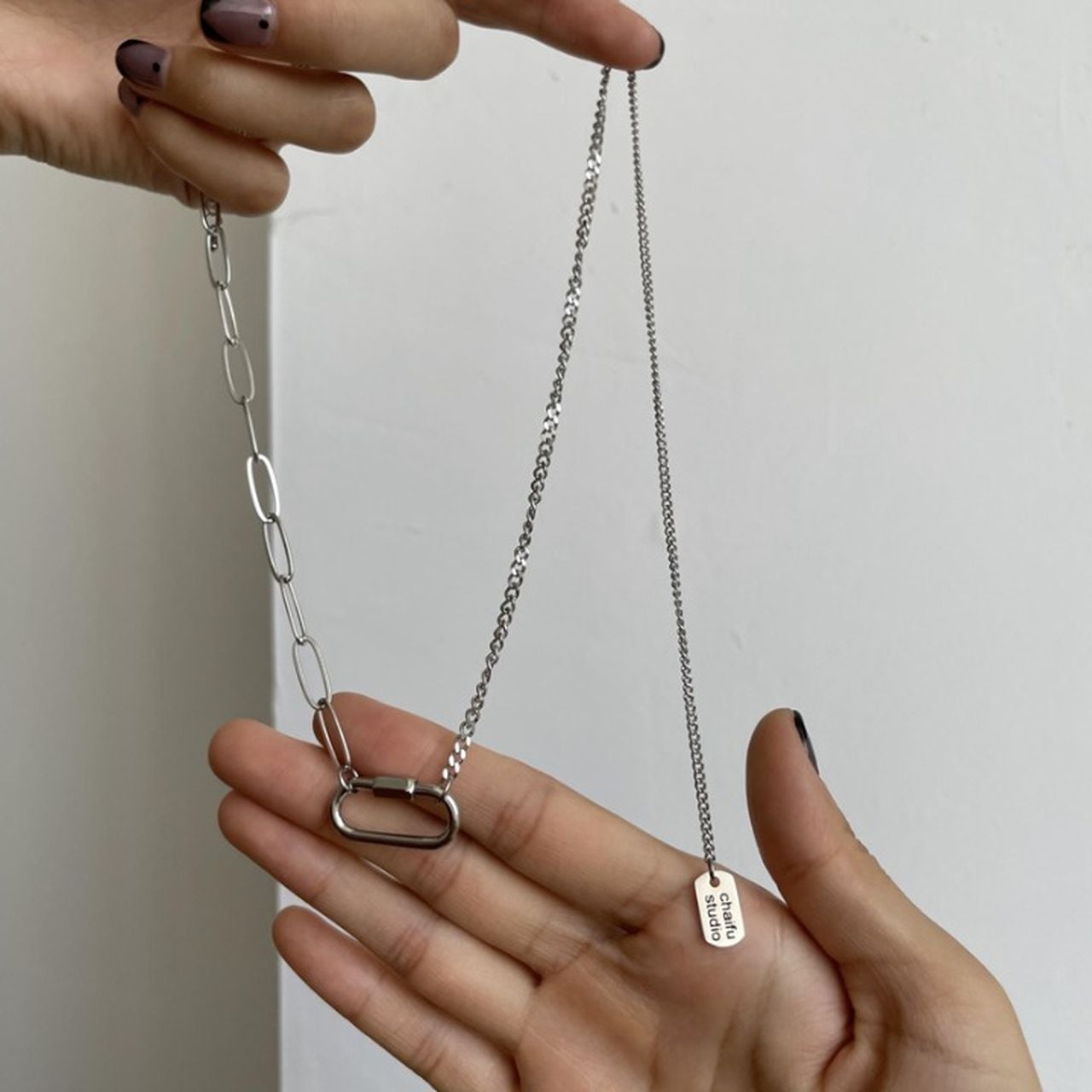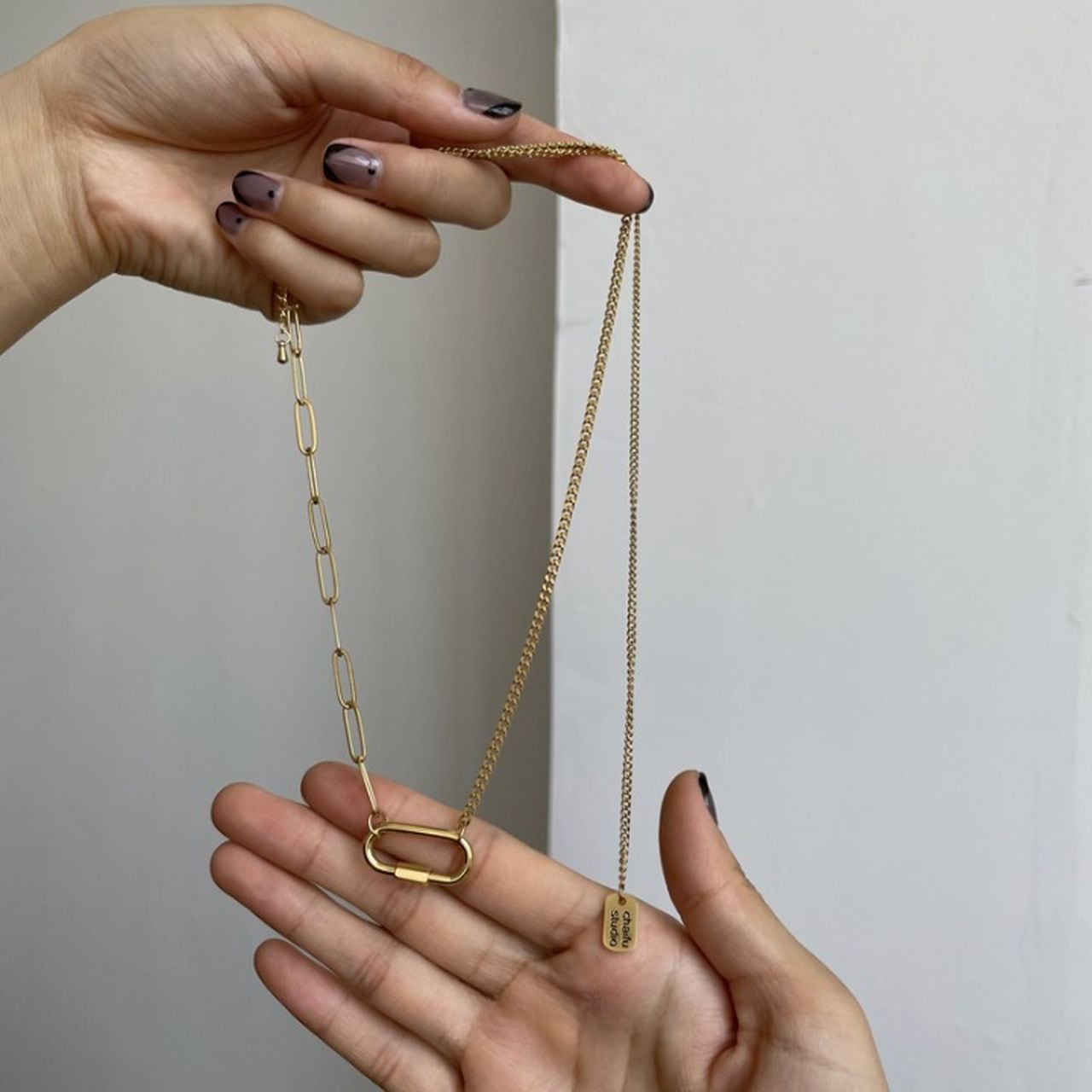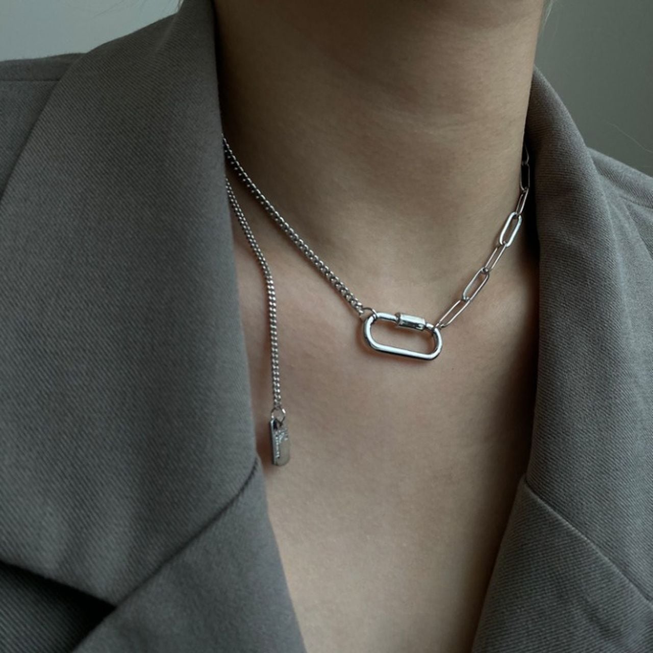 シンプルなチェーンと存在感のあるチャームを組み合わせたモードなデザインネックレス。