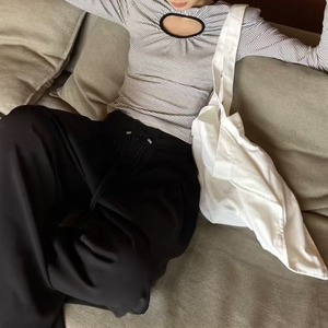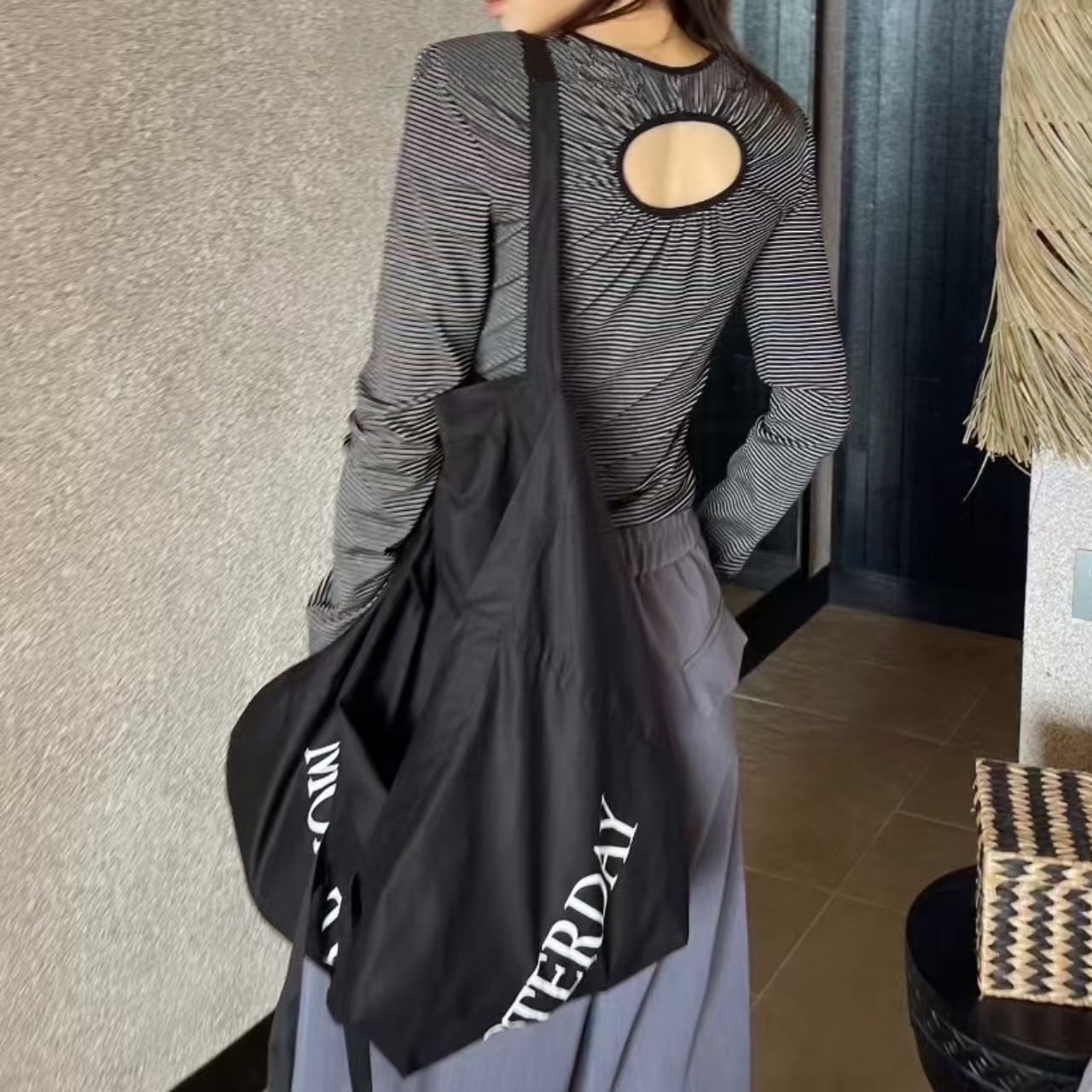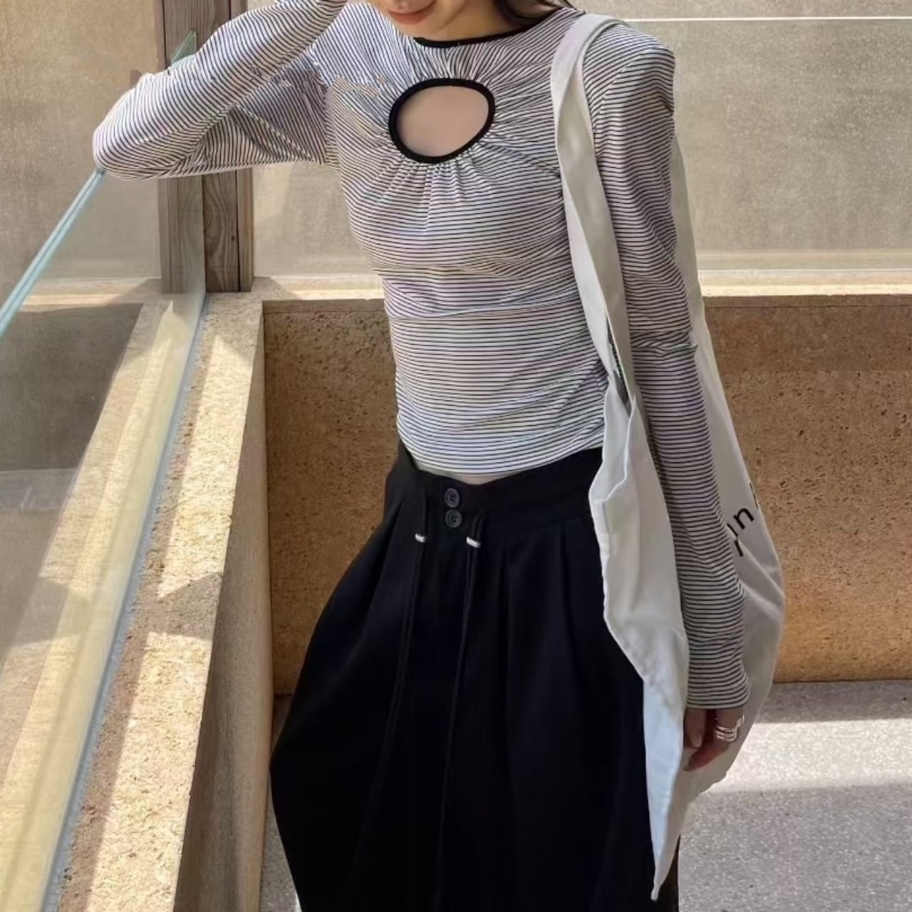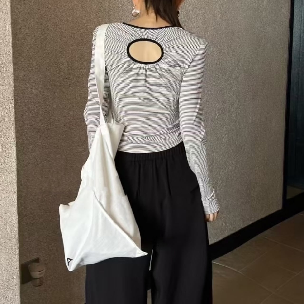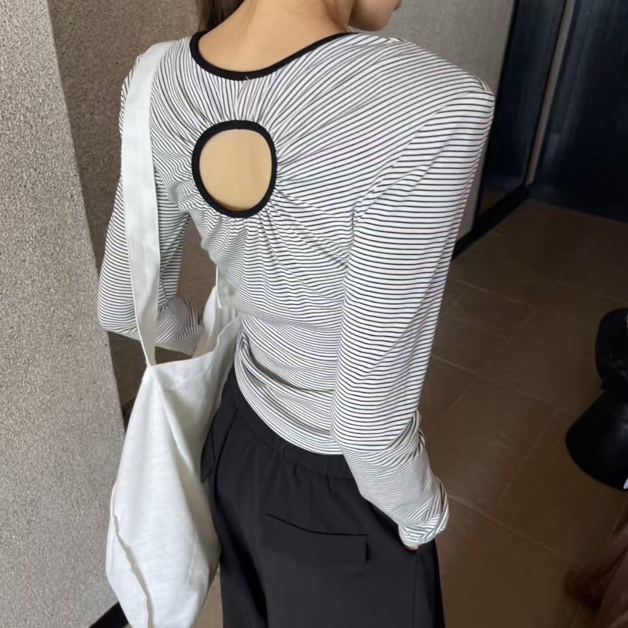 すっきりとした縦ストライプ柄と、首元の繊細なキーホールデザインが、洗練された印象を与えます。