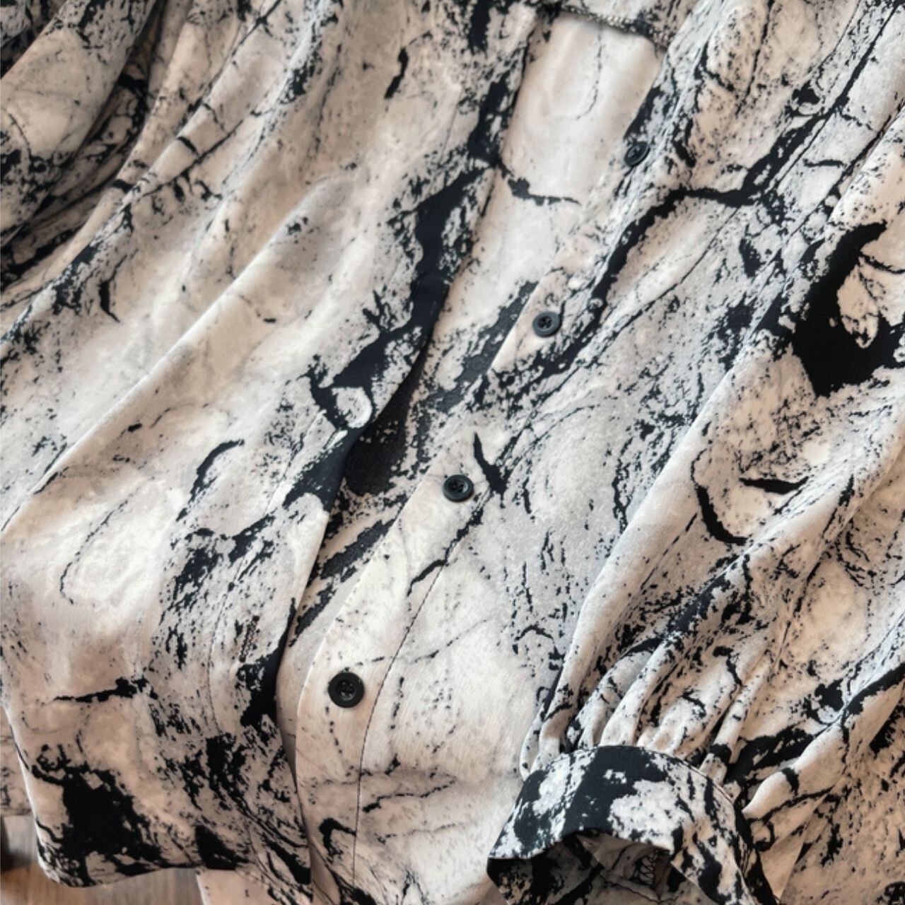 抽象的なパターンが目を引くデザイン。ゆったりとしたシルエットでリラックスした着心地を実現しつつ、スタイリッシュな印象も与えます。
