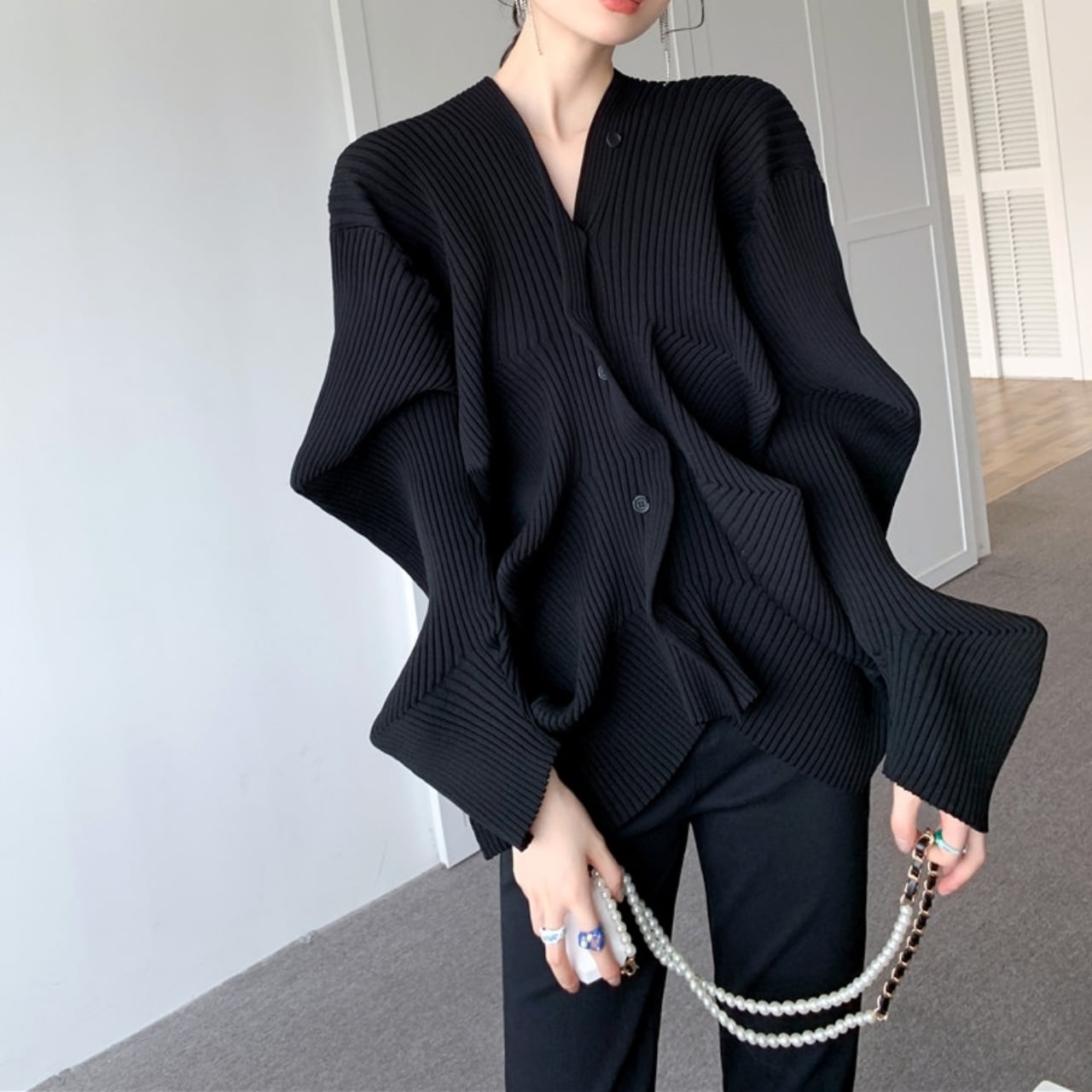 Vネックとバルーンスリーブが特徴的なニットカーディガン。上品で個性的なシルエットです。