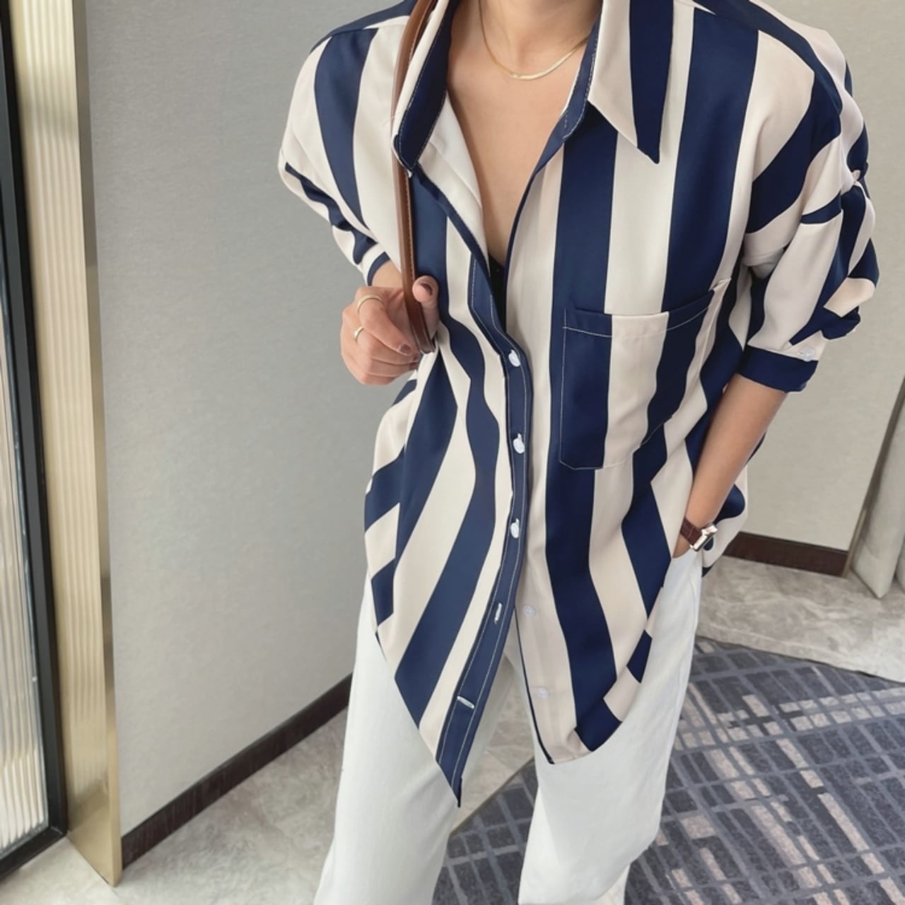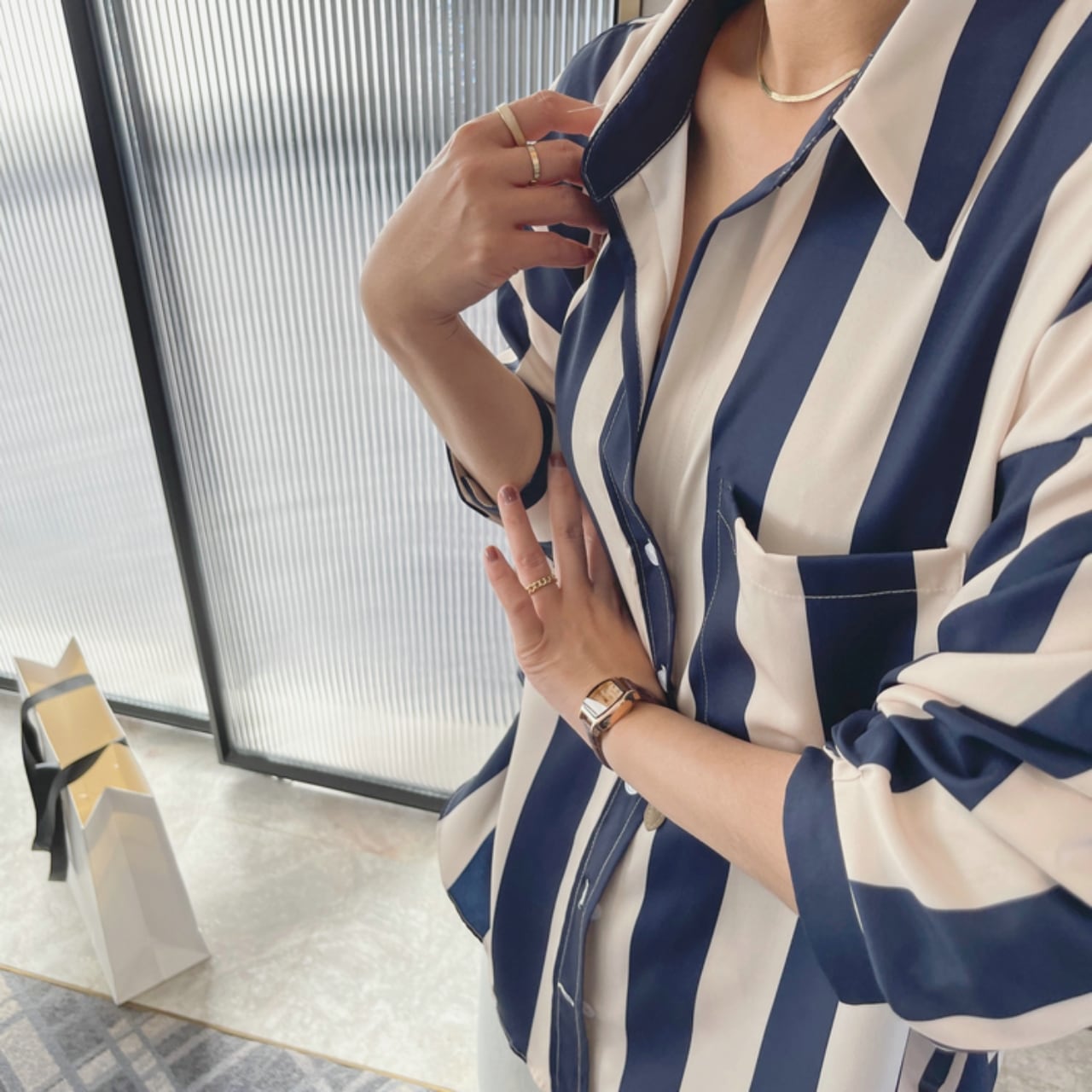 ゆったりとしたシルエットのストライプシャツ。