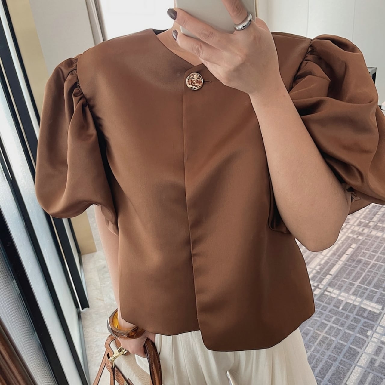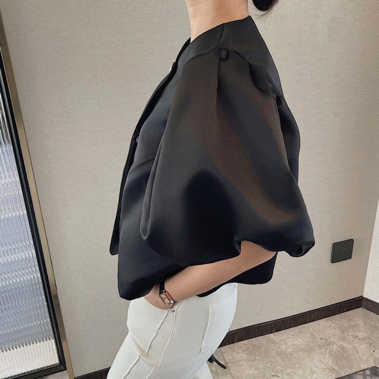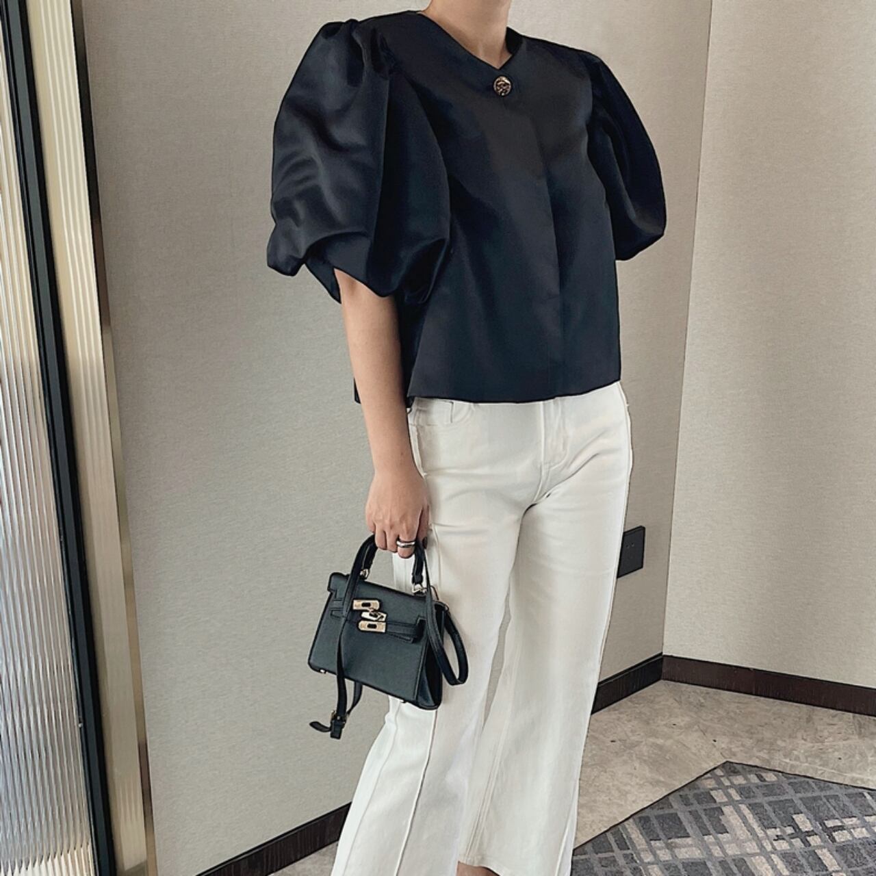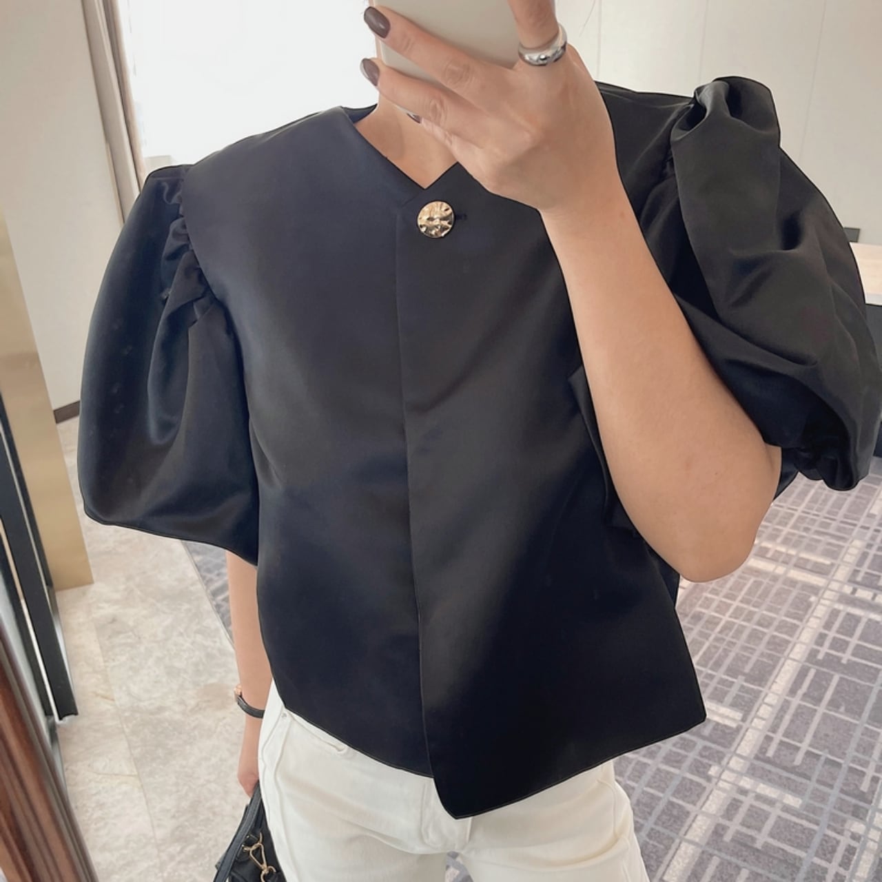 バルーンスリーブが目を惹くクロップド丈ブラウス。