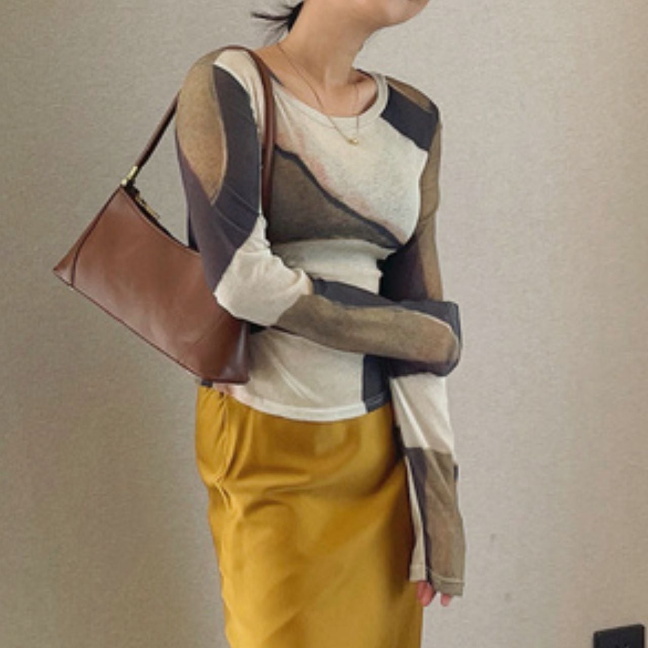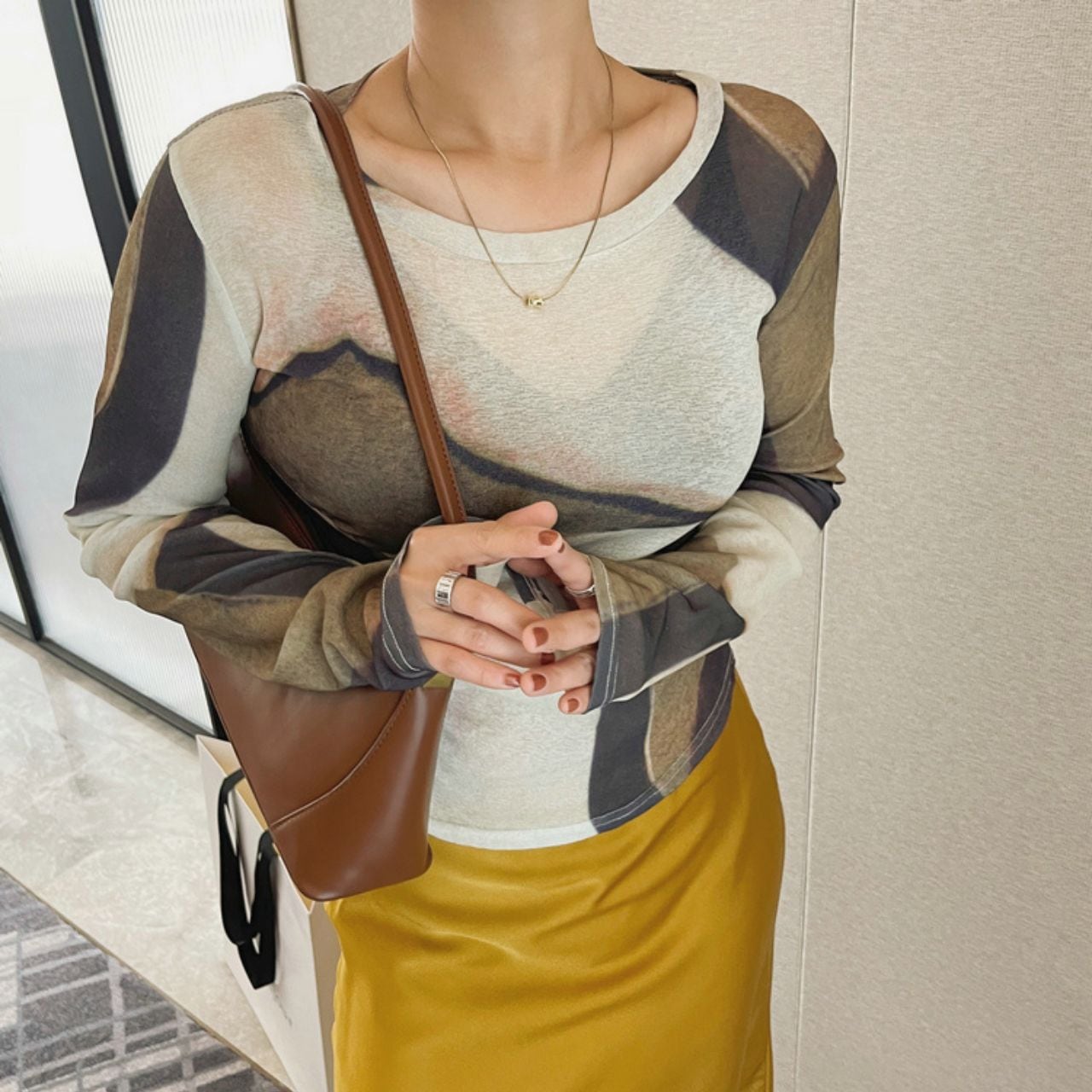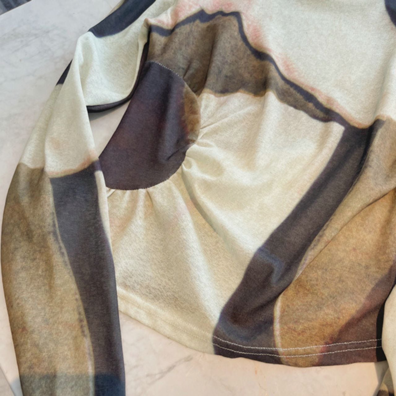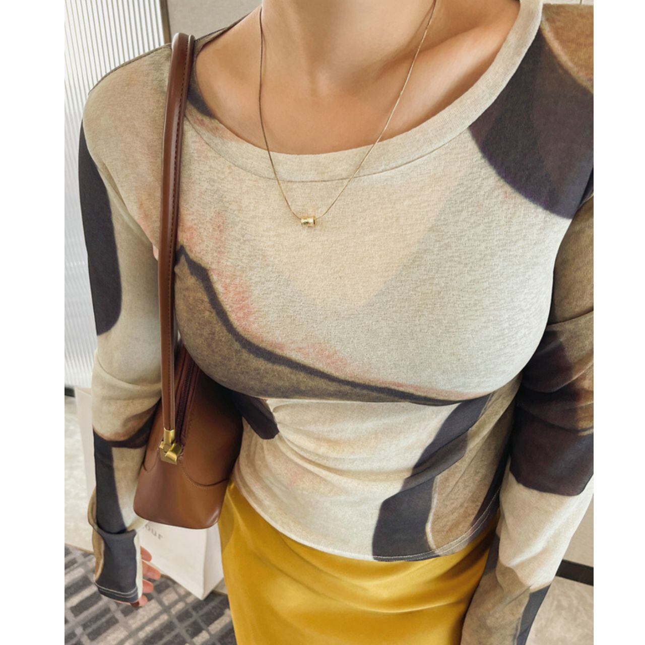 抽象柄が目を惹くタイトシルエットのロングスリーブクルーネックカットソーです。