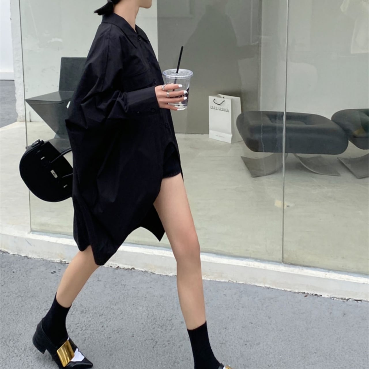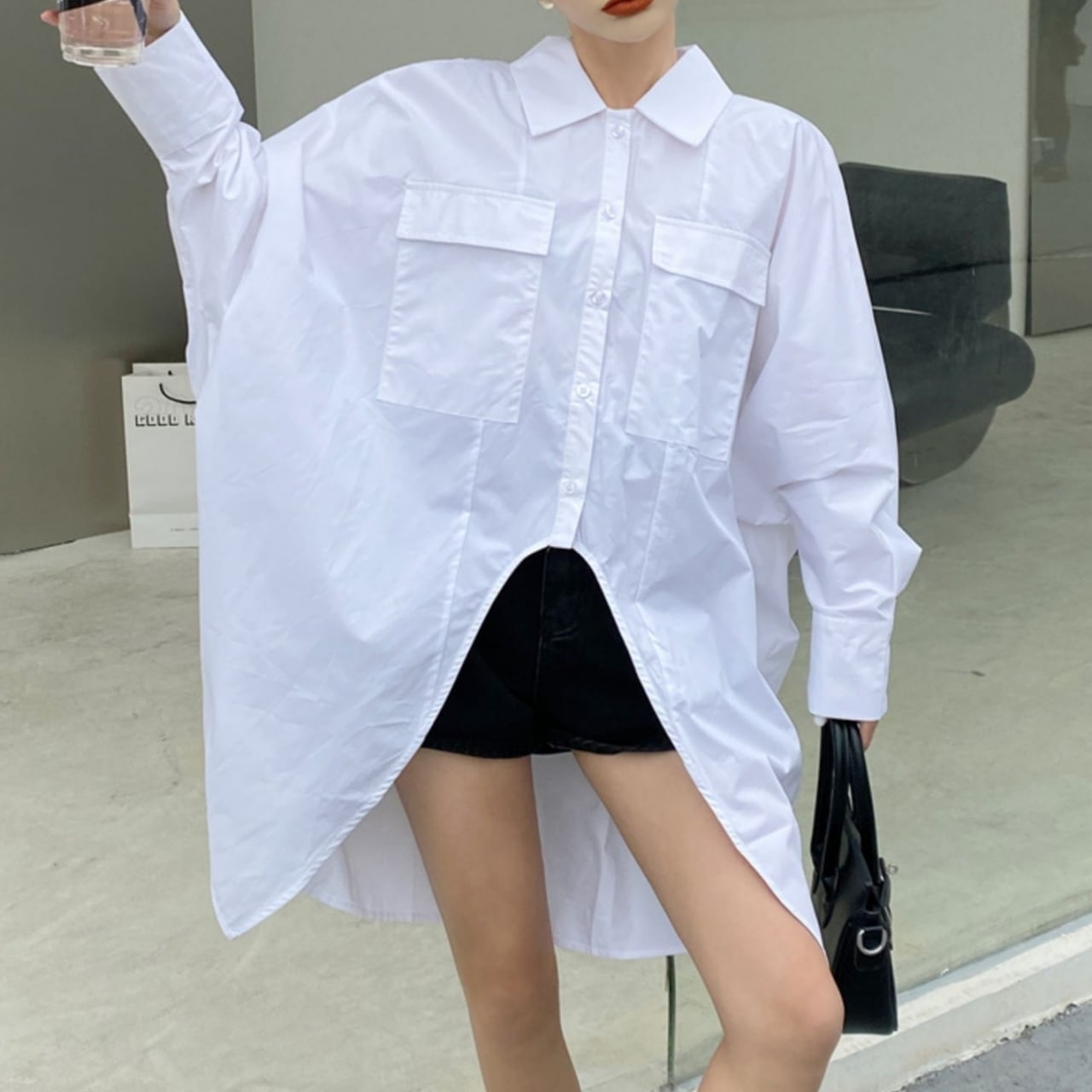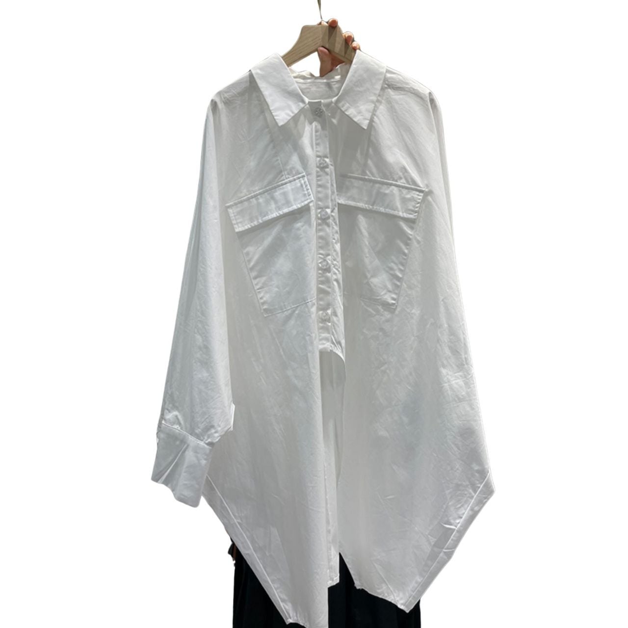 アシンメトリーなヘムラインが、シンプルながらも洗練された印象を与えます。