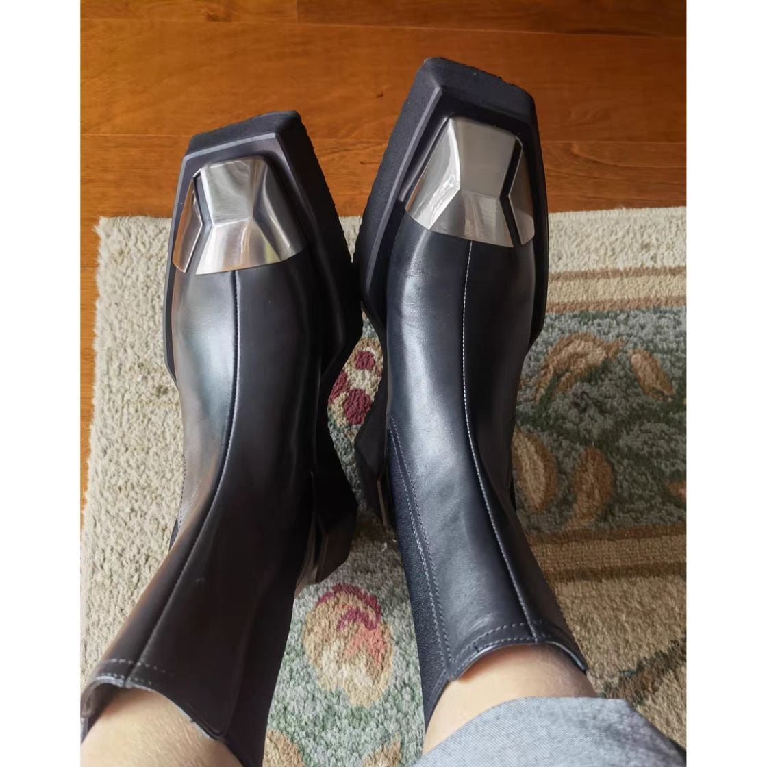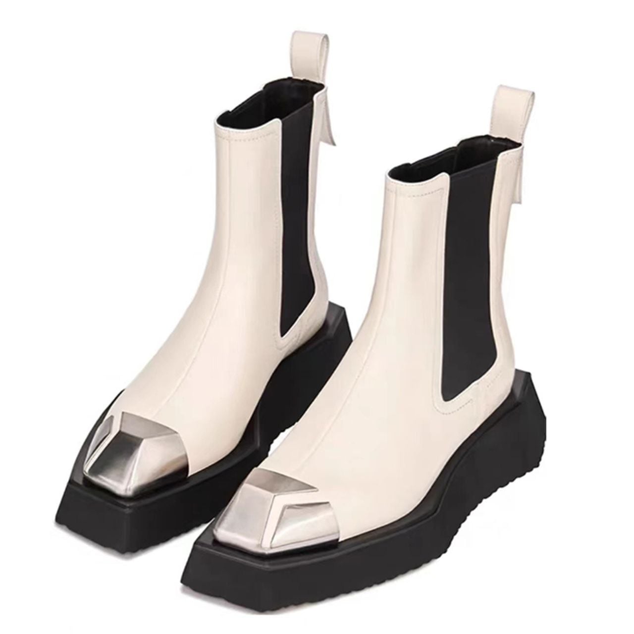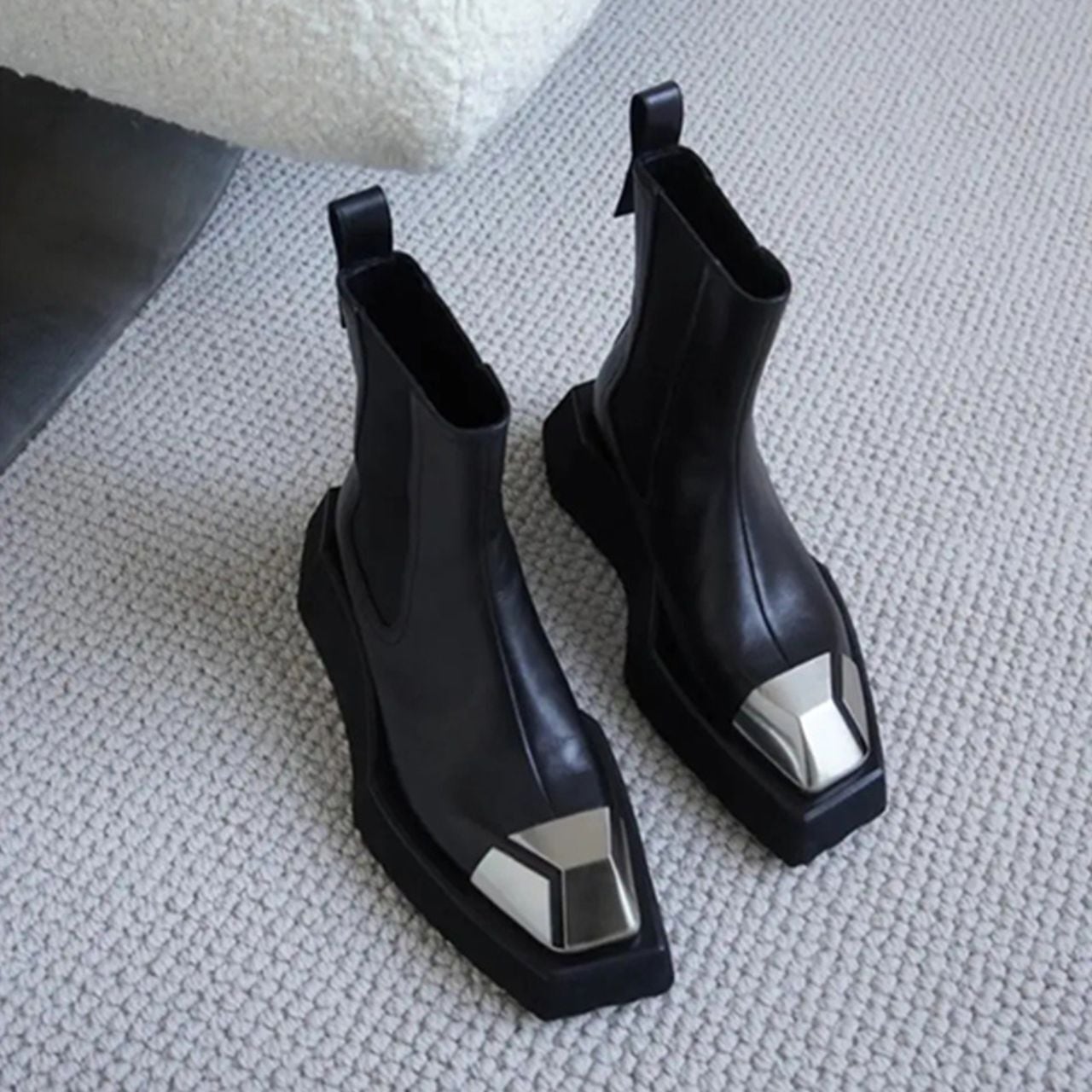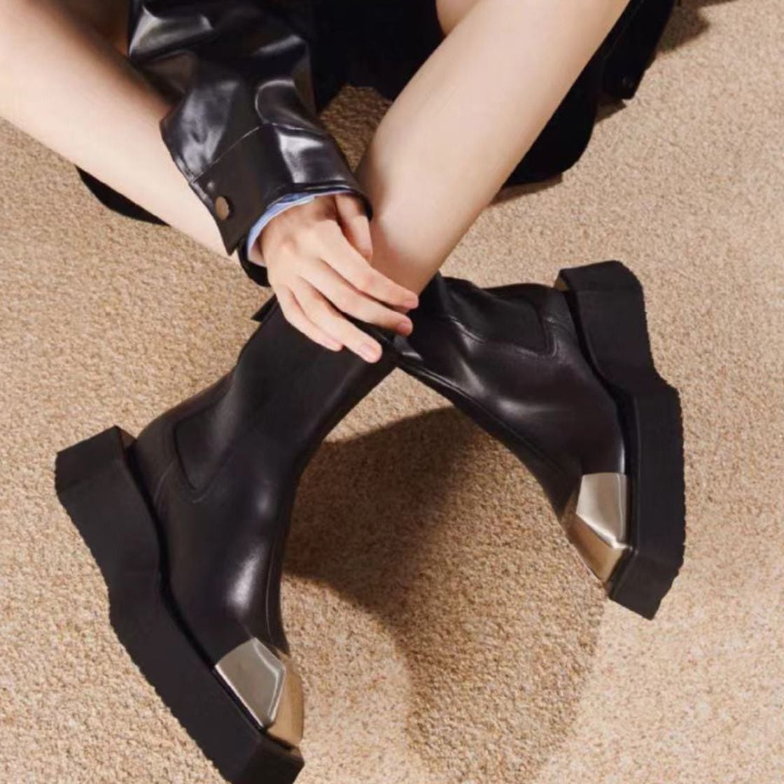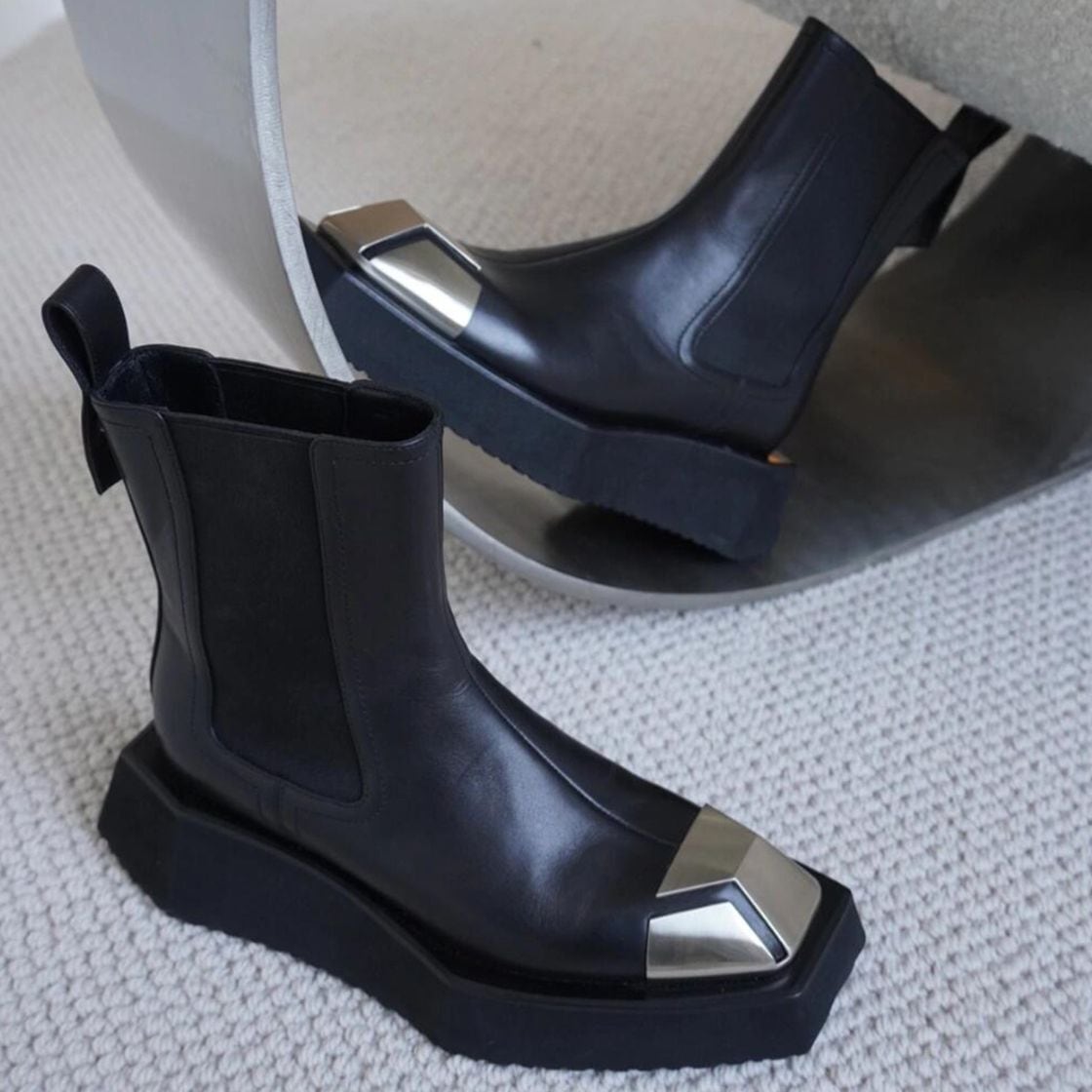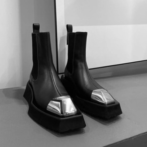 厚底ソールにメタルのトゥを効かせたチェルシーブーツ。
