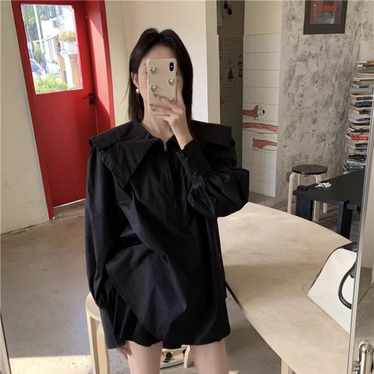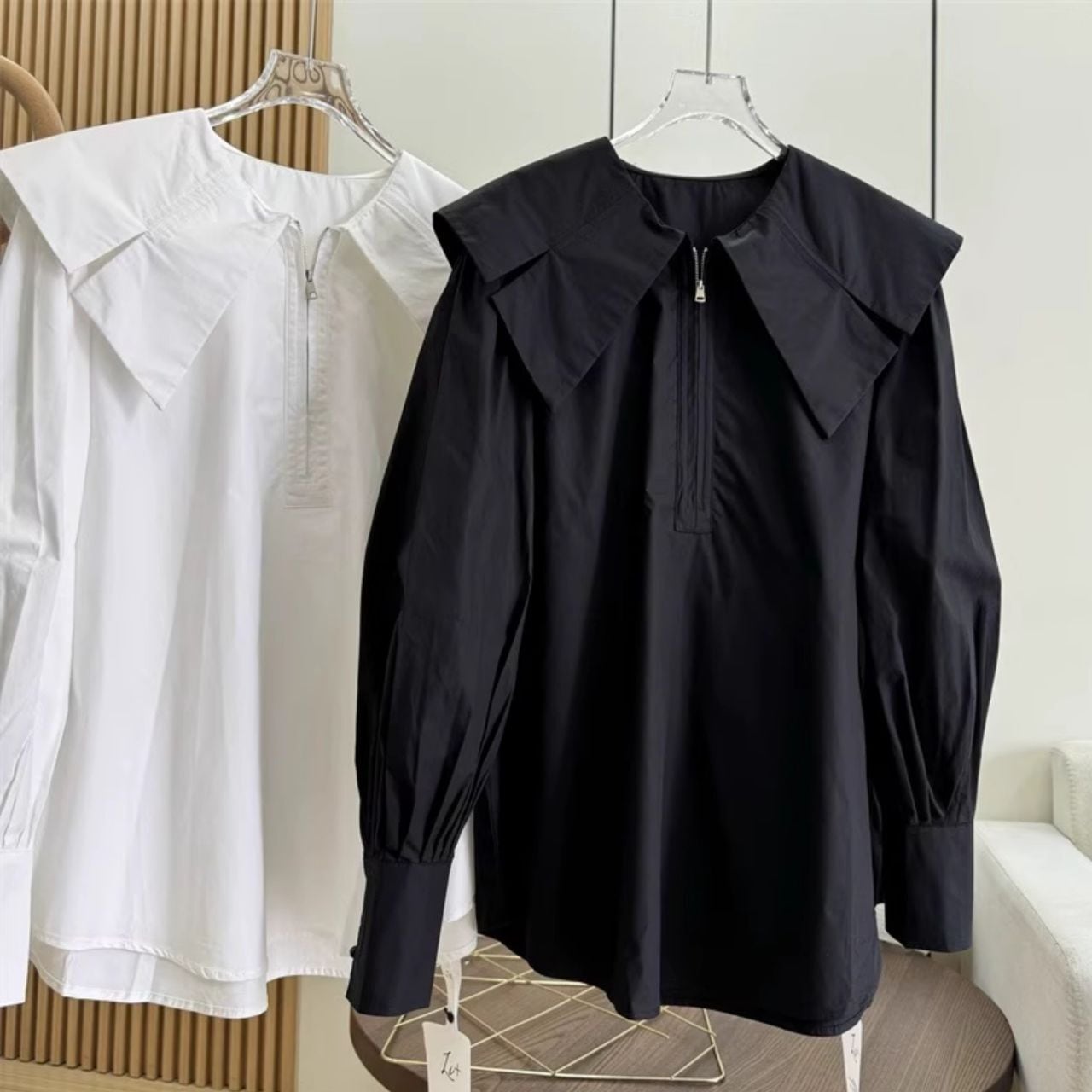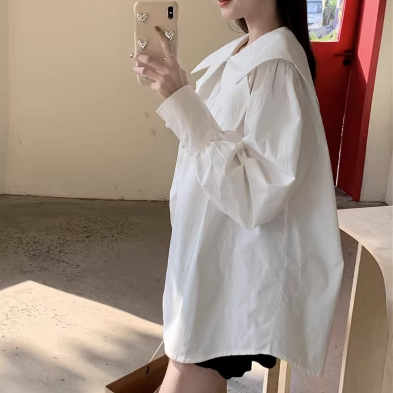 大きめの丸襟とランタン袖が印象的なシャツ。