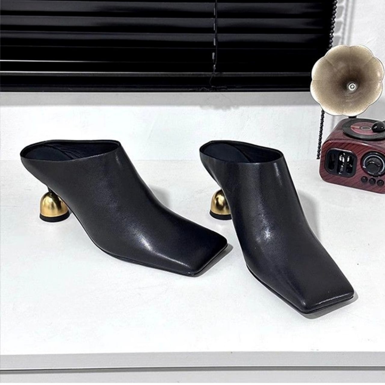 ヴィンテージライクなスクエアトゥとカップヒールが目を引くミュールサンダル。