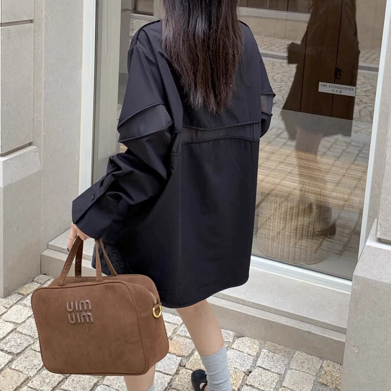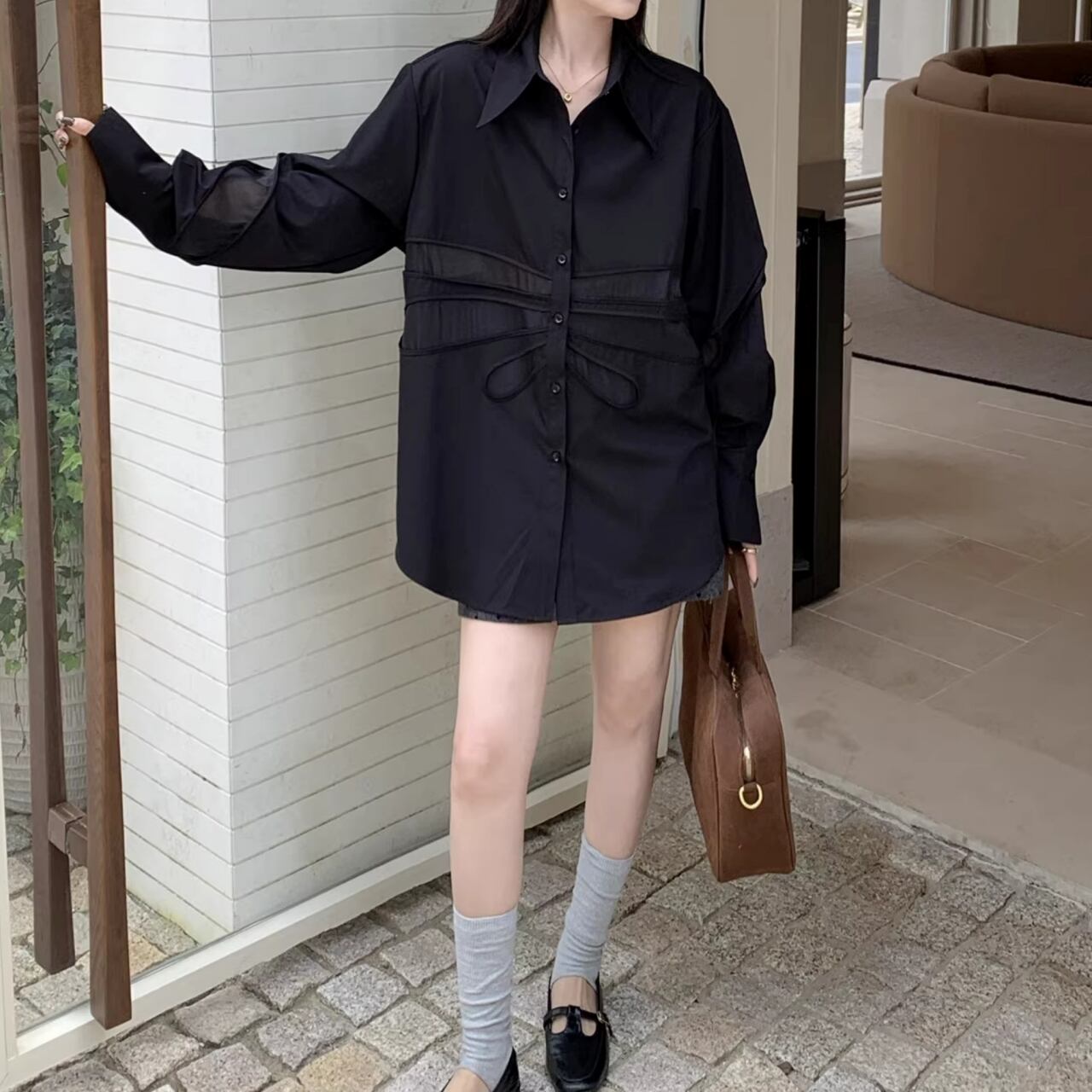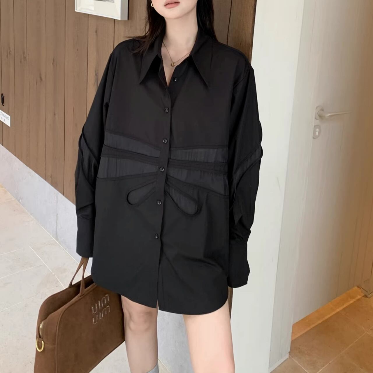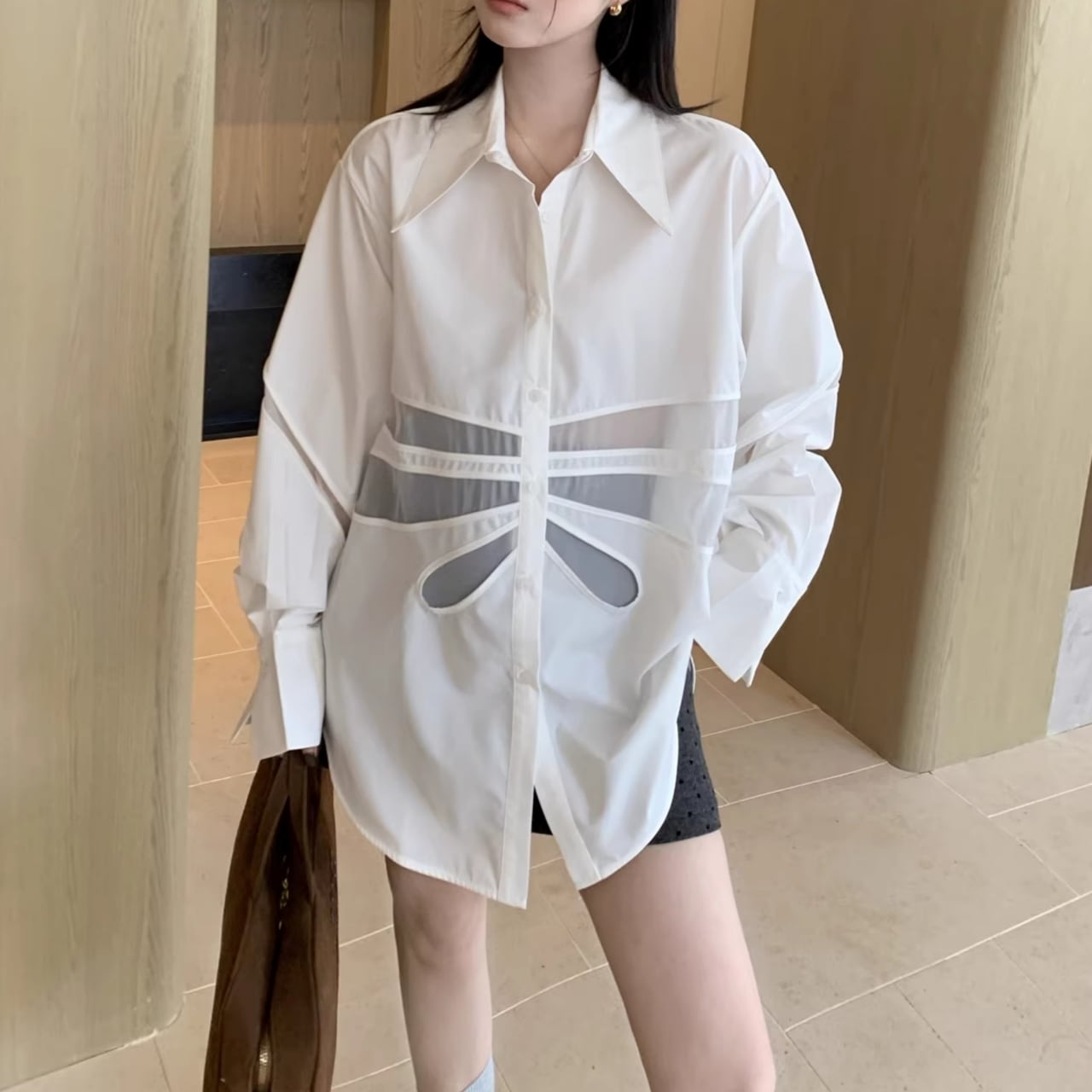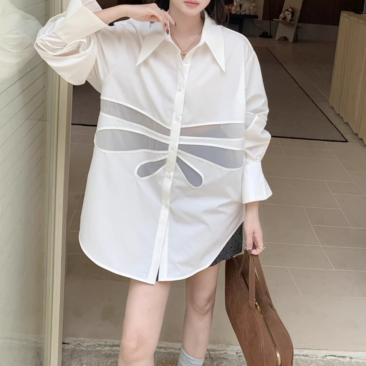 背面に透け感のあるメッシュ素材を組み合わせ、蝶の羽を思わせるディテールを施したデザインシャツ。