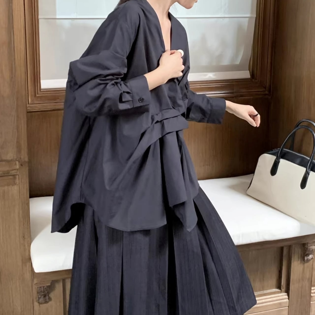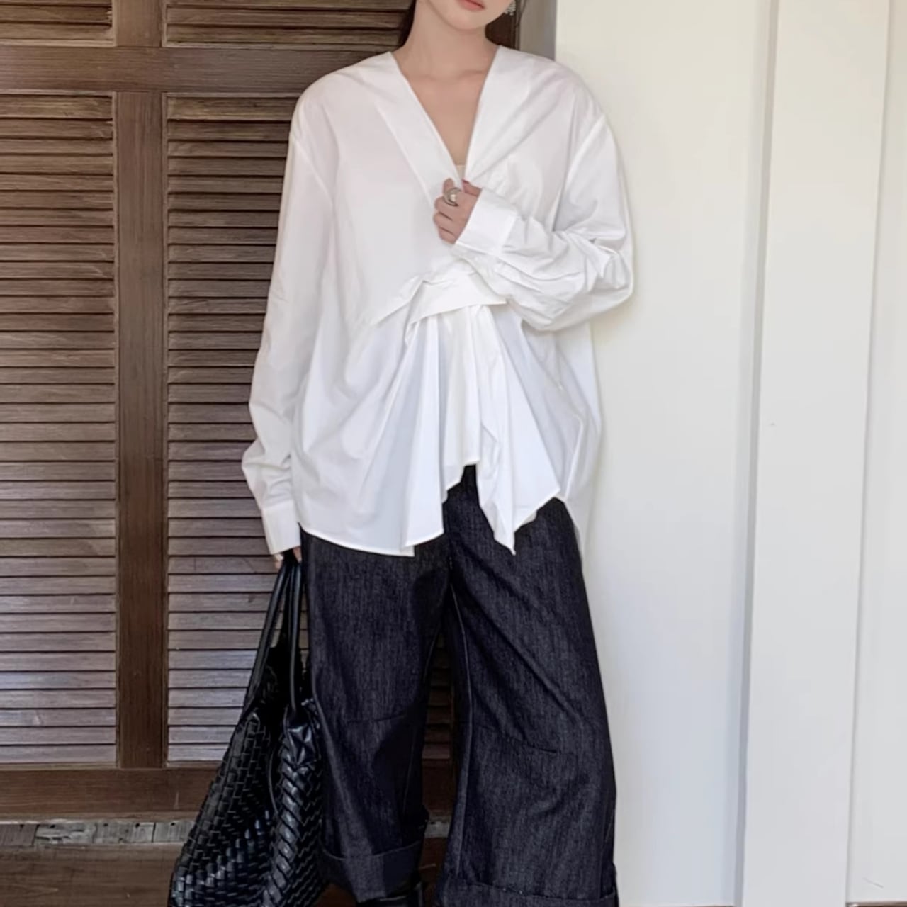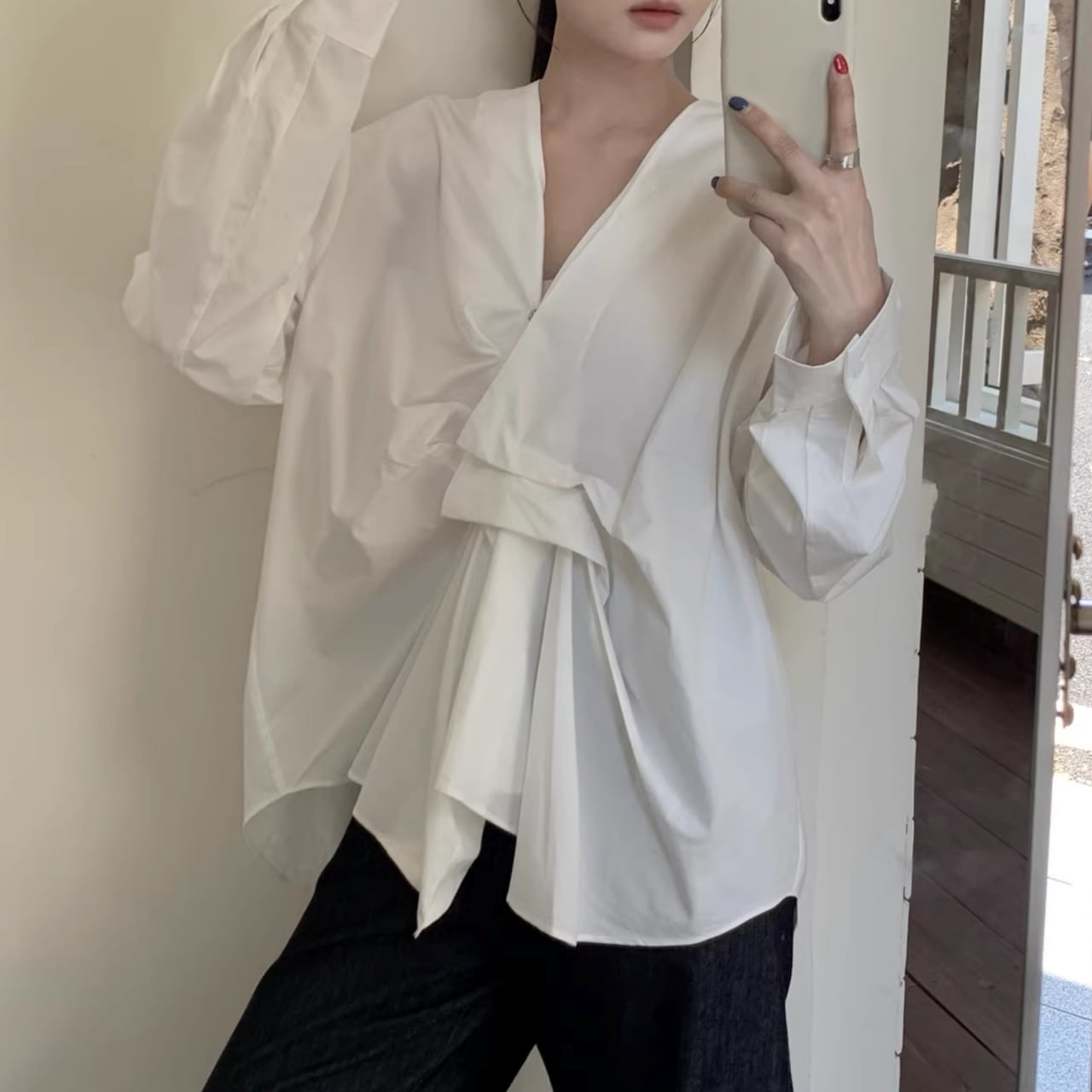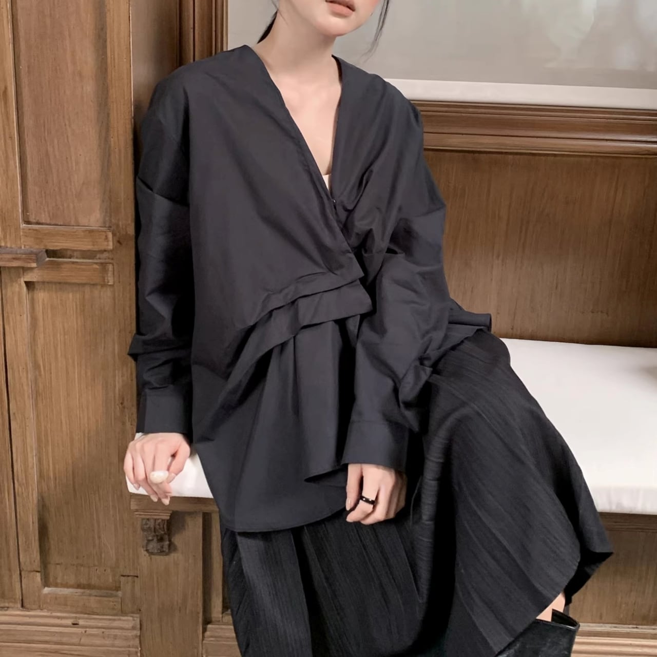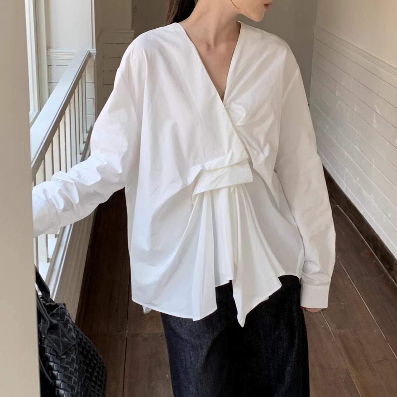 Vネックにプリーツを施したフレンチライクなシャツ。