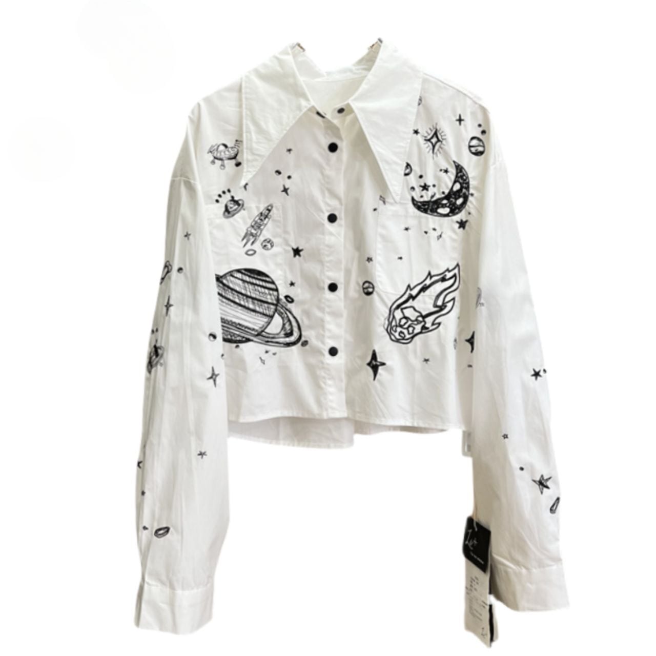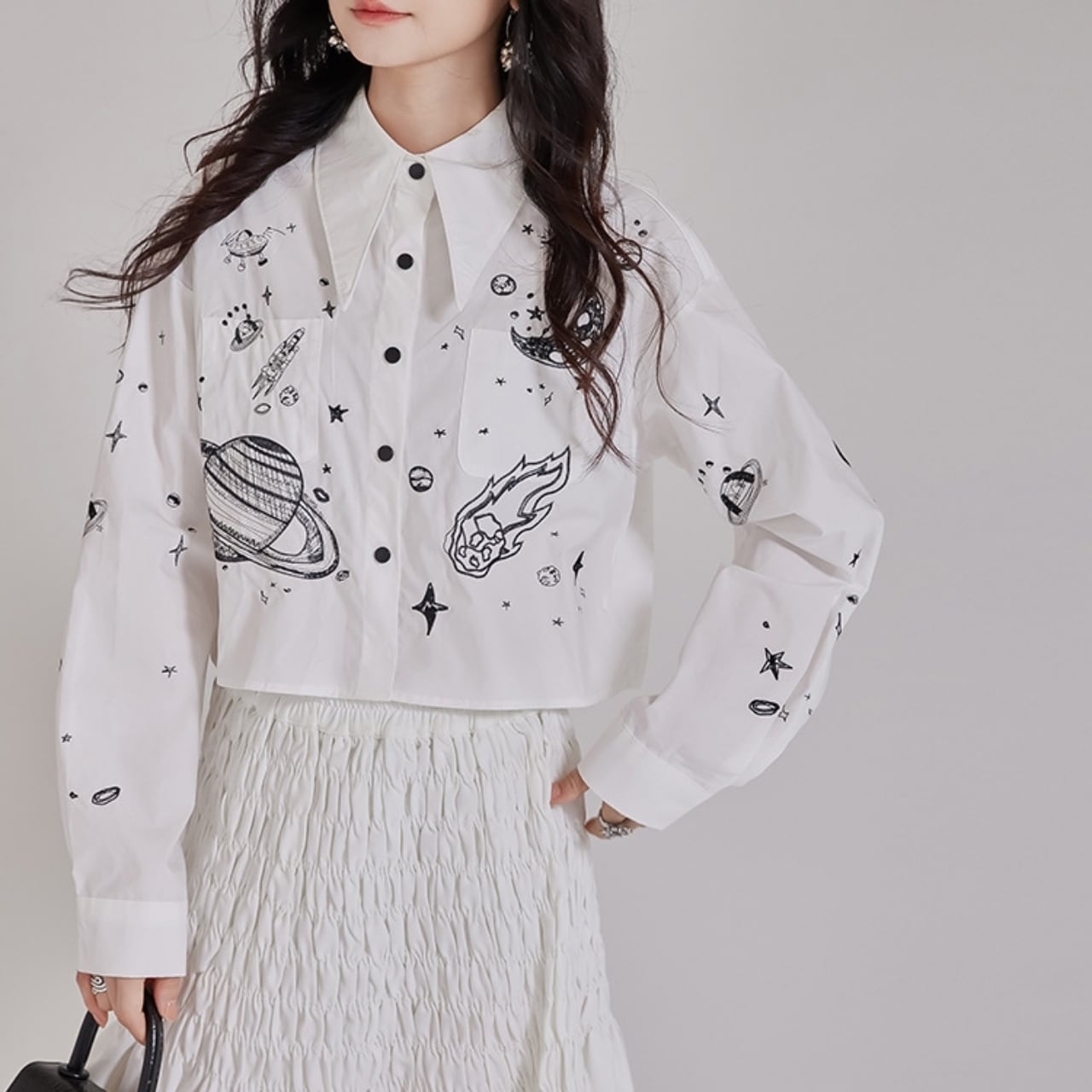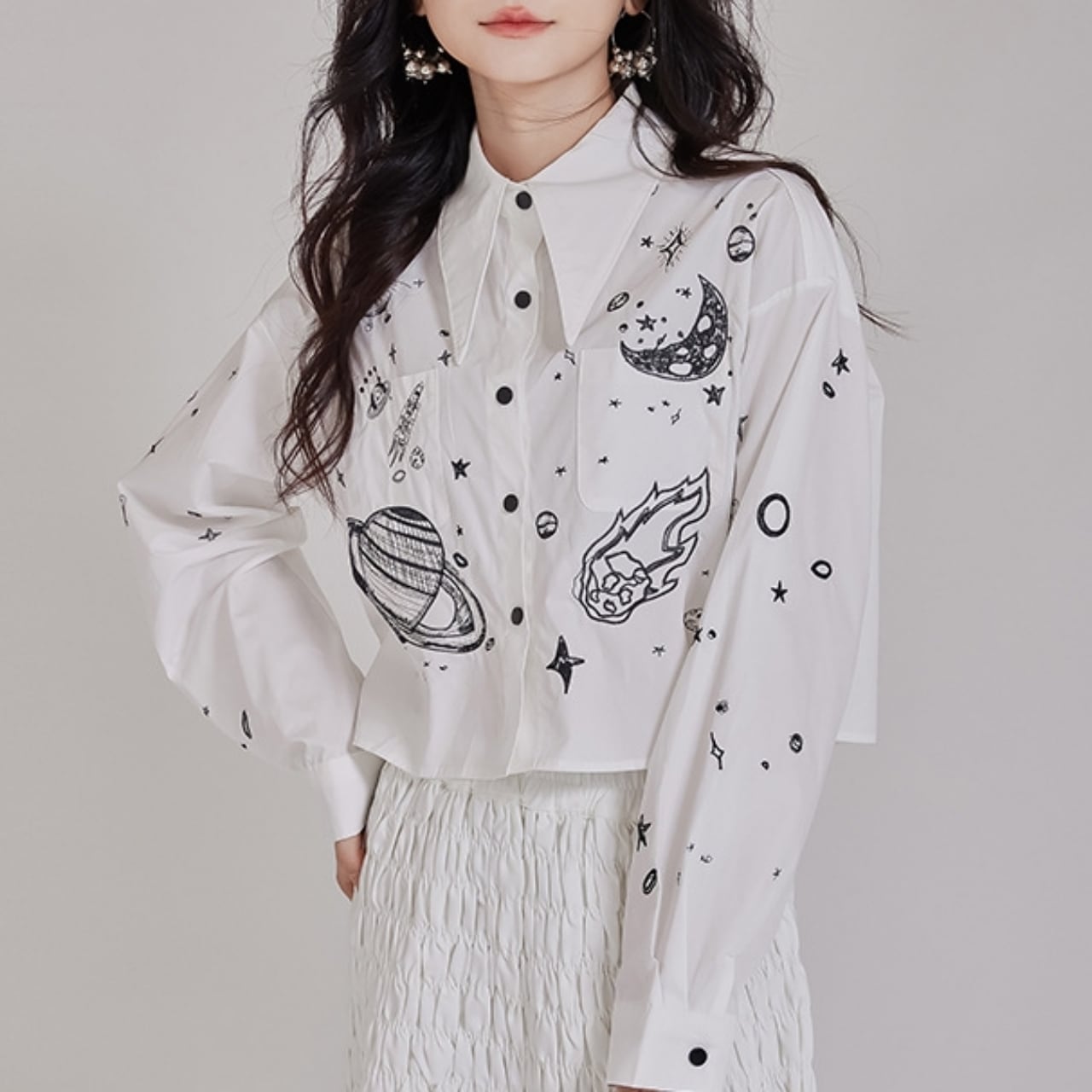 惑星モチーフのプリントが目を引くショート丈シャツ。