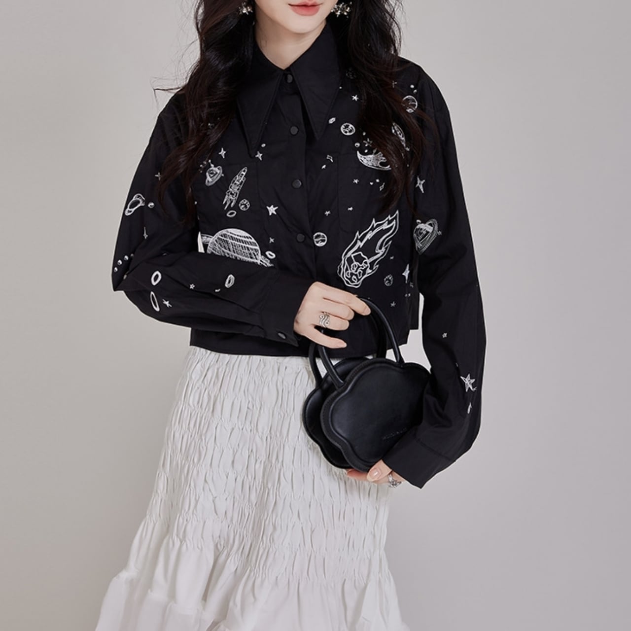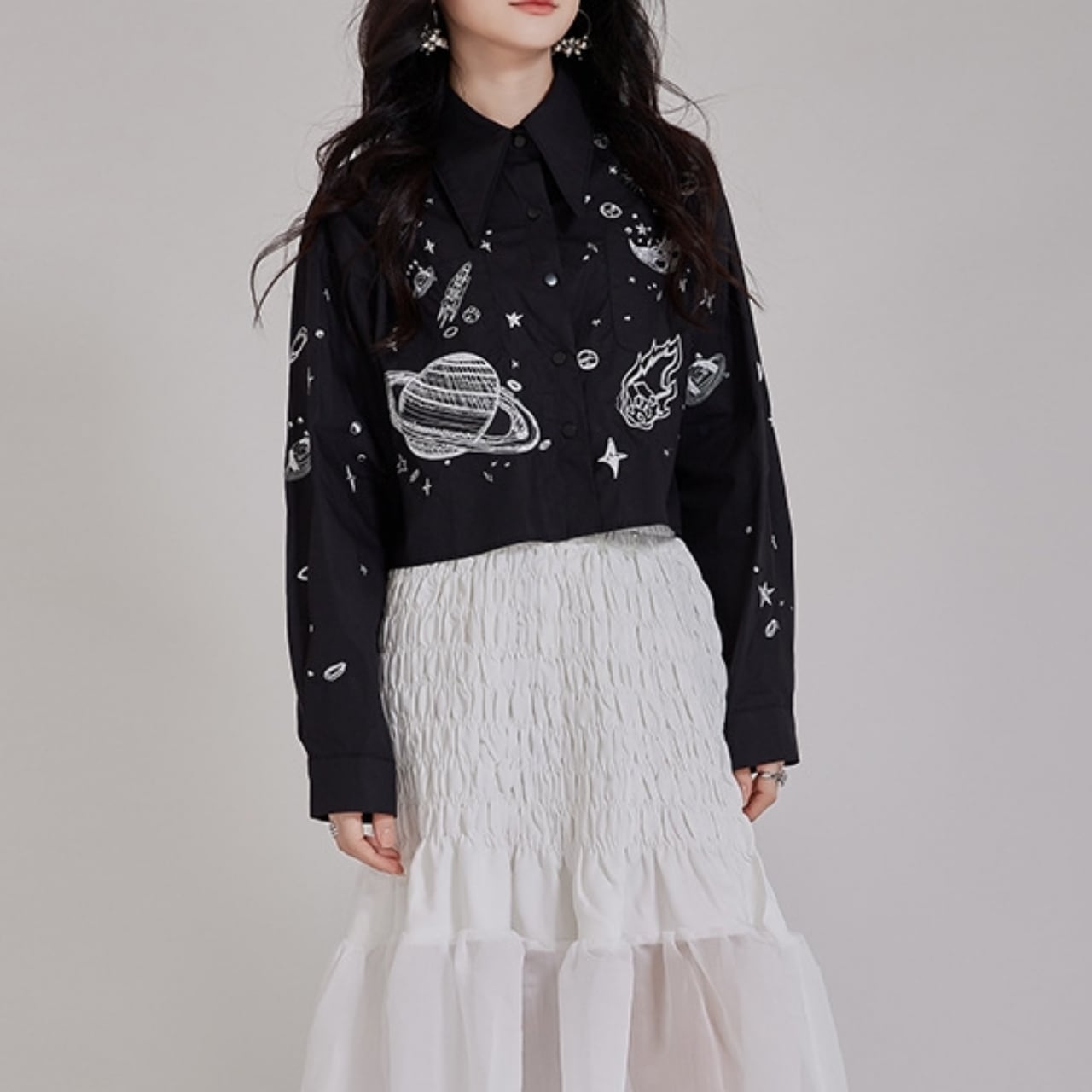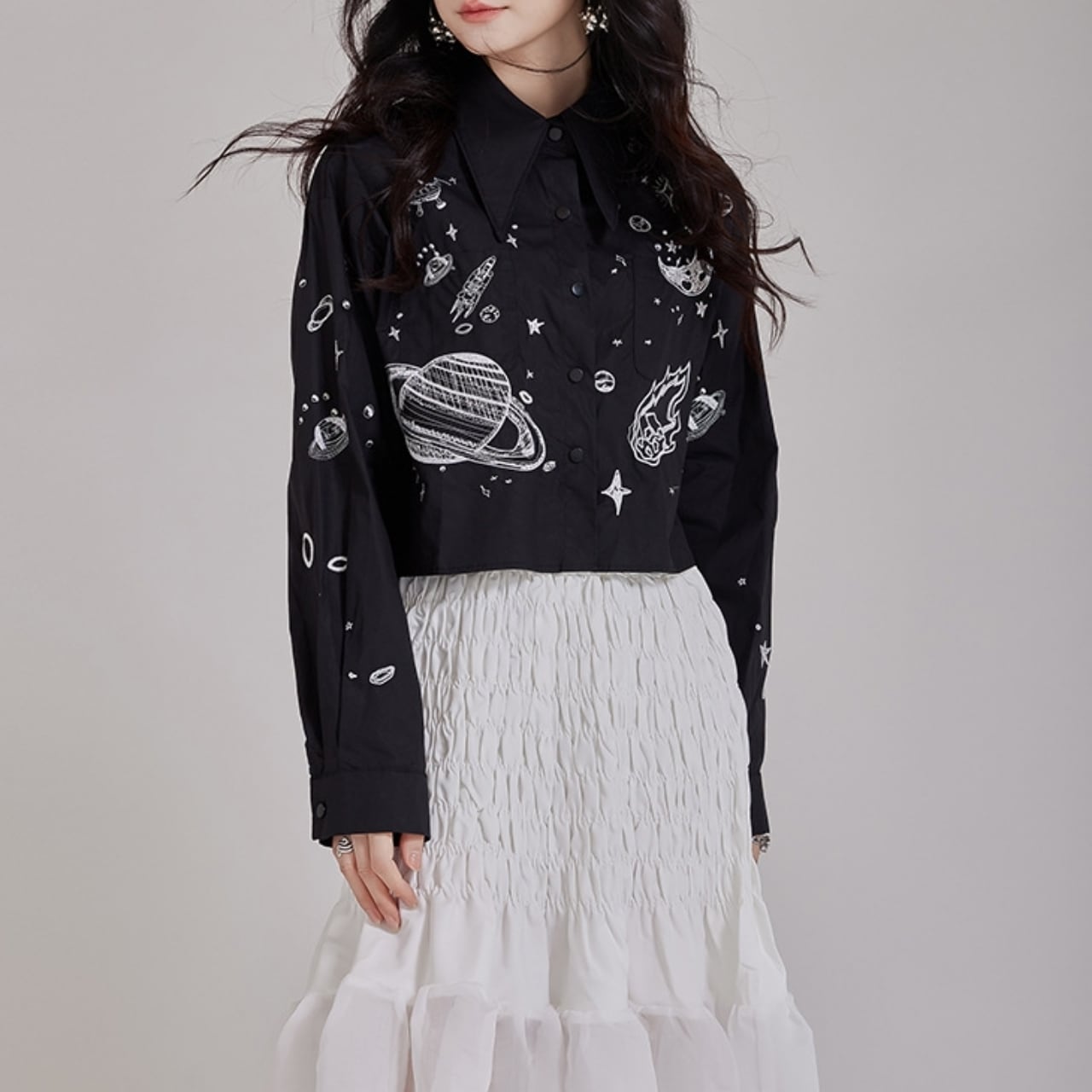 惑星モチーフのプリントが目を引くショート丈シャツ。