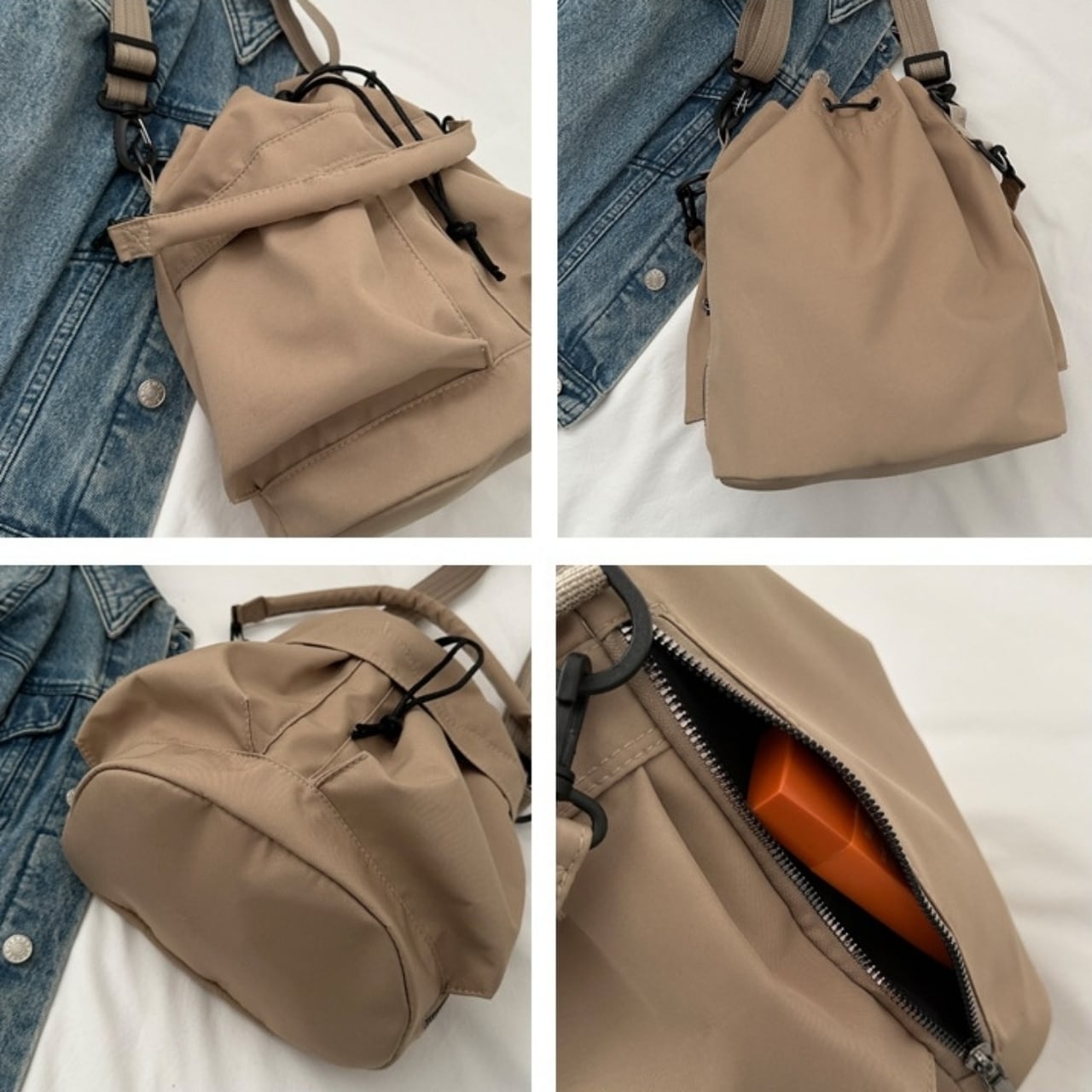 ドローストリング仕様で荷物をしっかり収納でき、ハンド・ショルダー・斜め掛けの3WAYで使用可能。日常使いに便利なアイテムです。