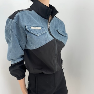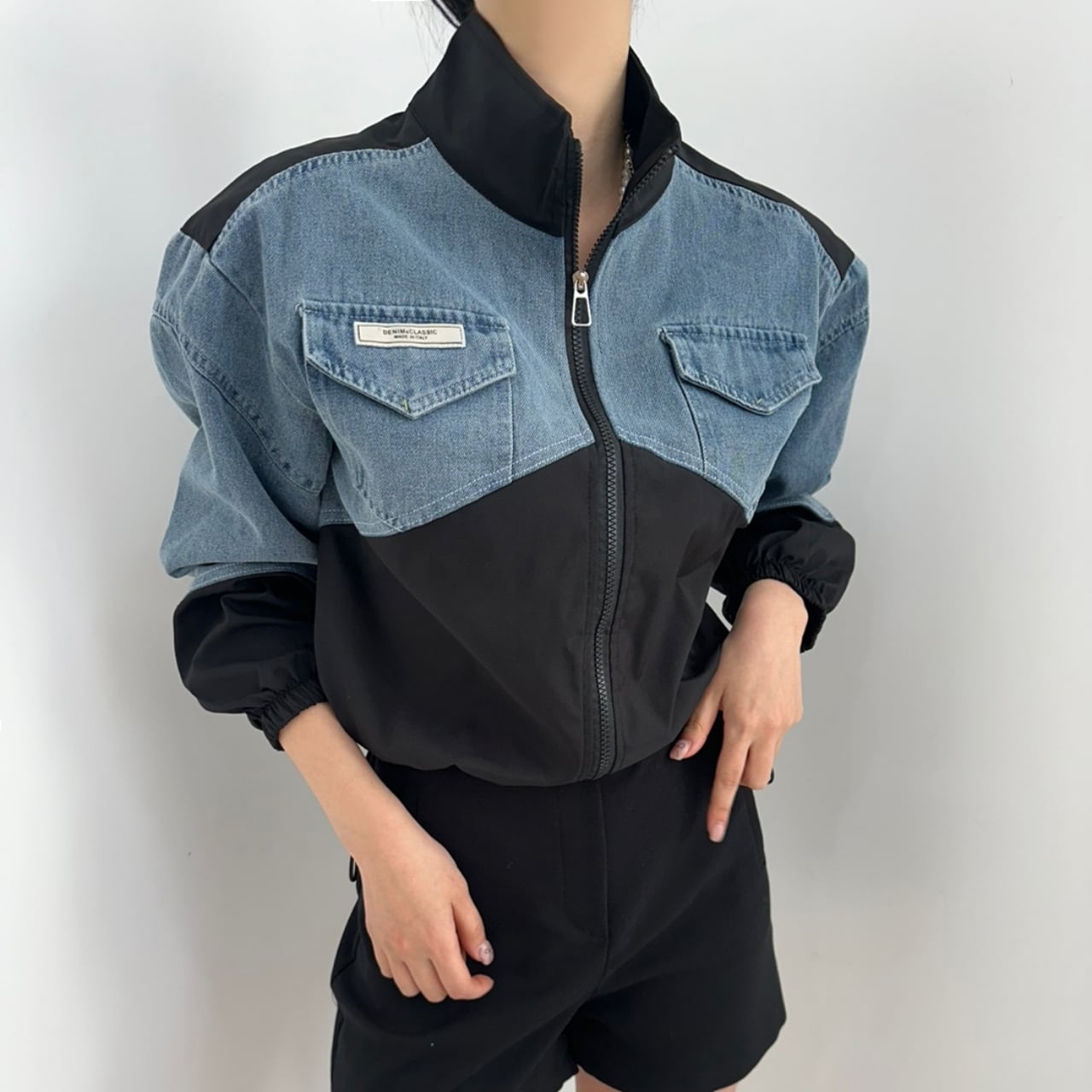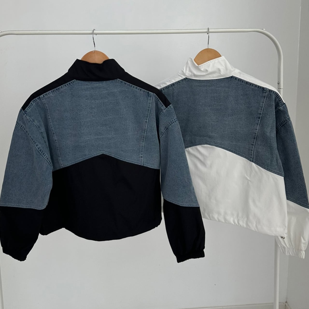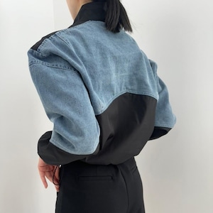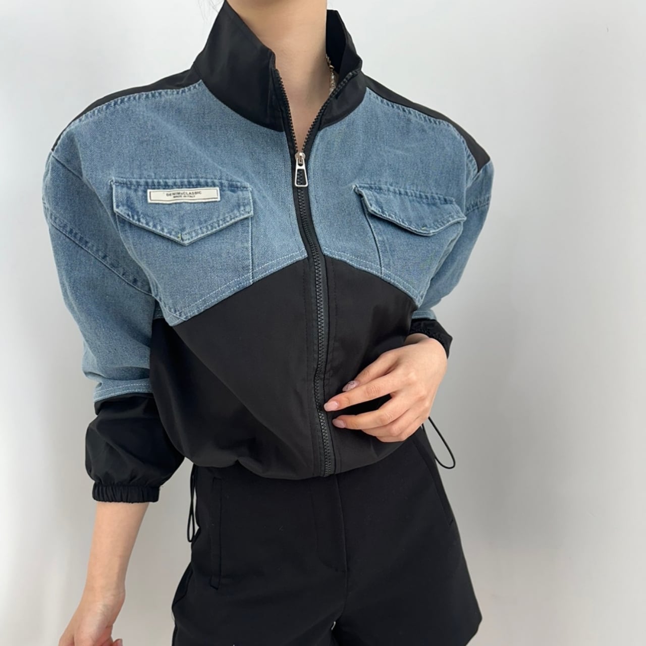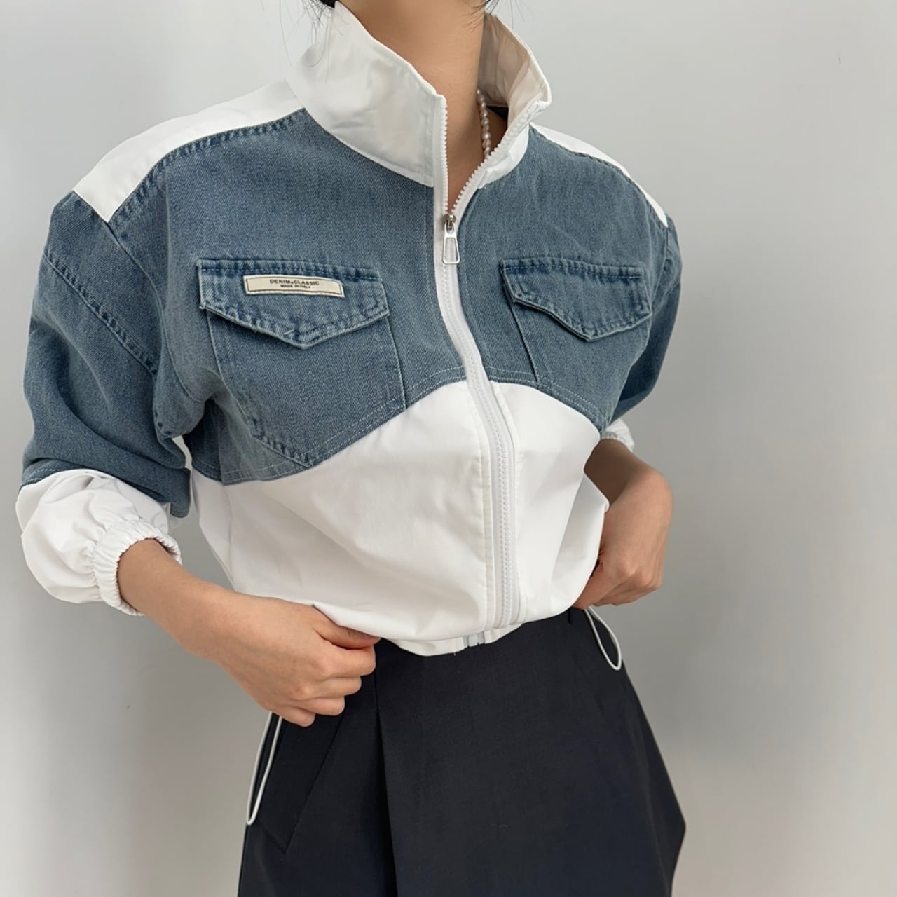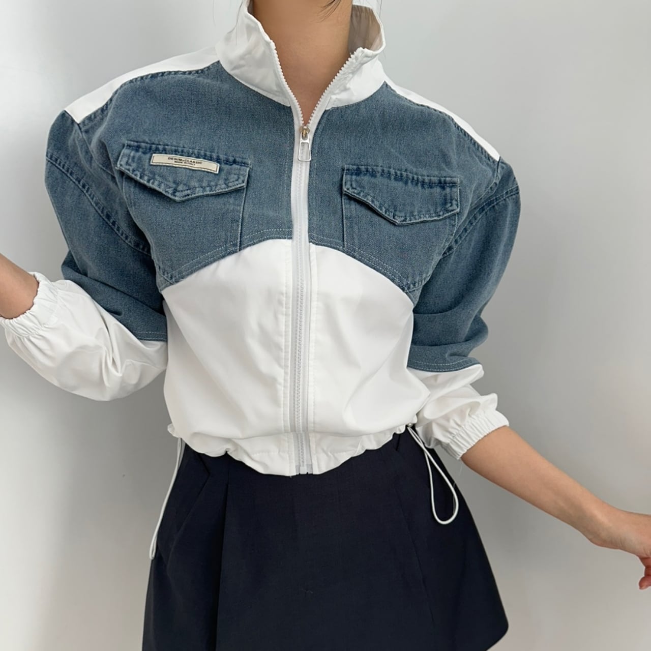 スタンドカラーとドローストリング仕様が特徴のショート丈デニムジャケット。