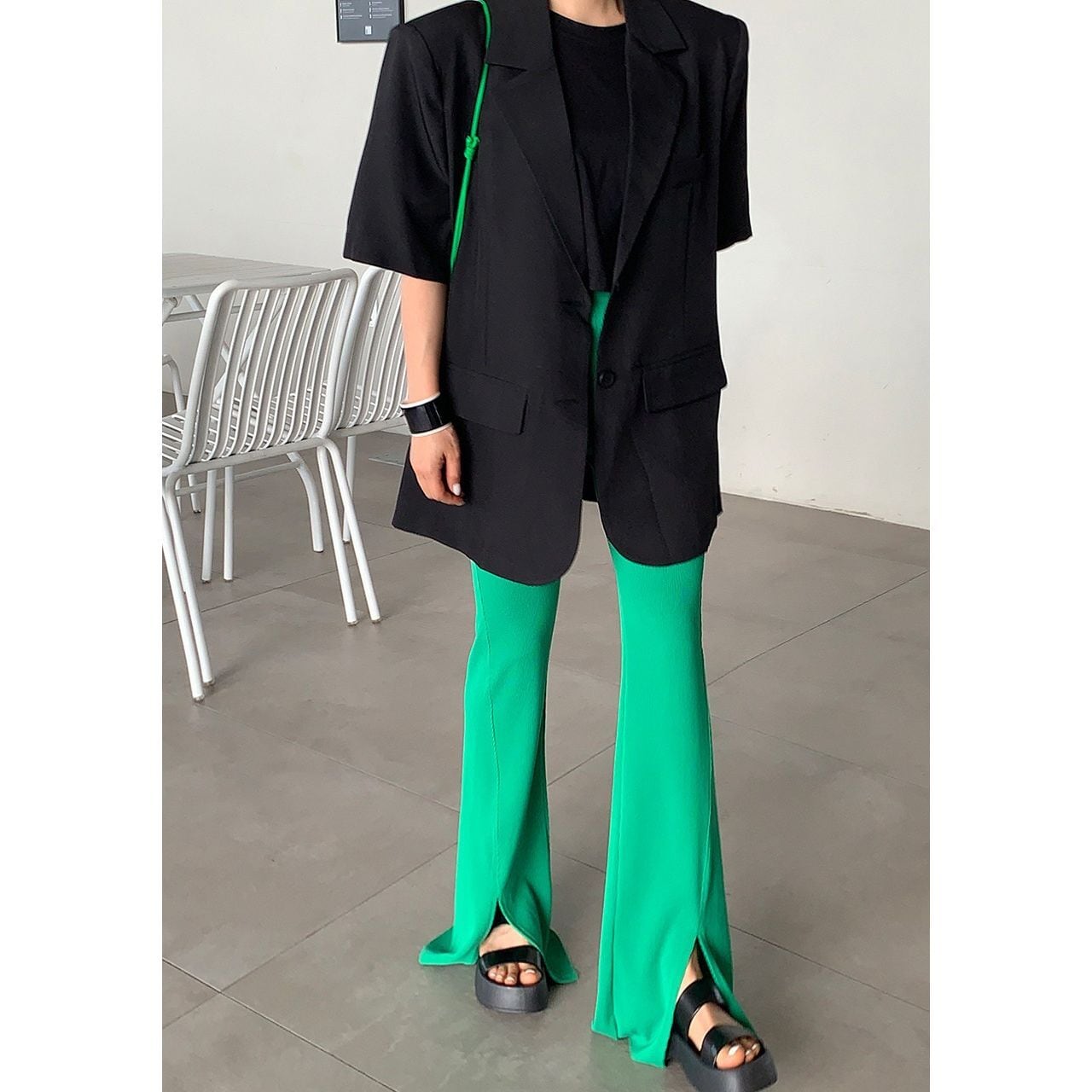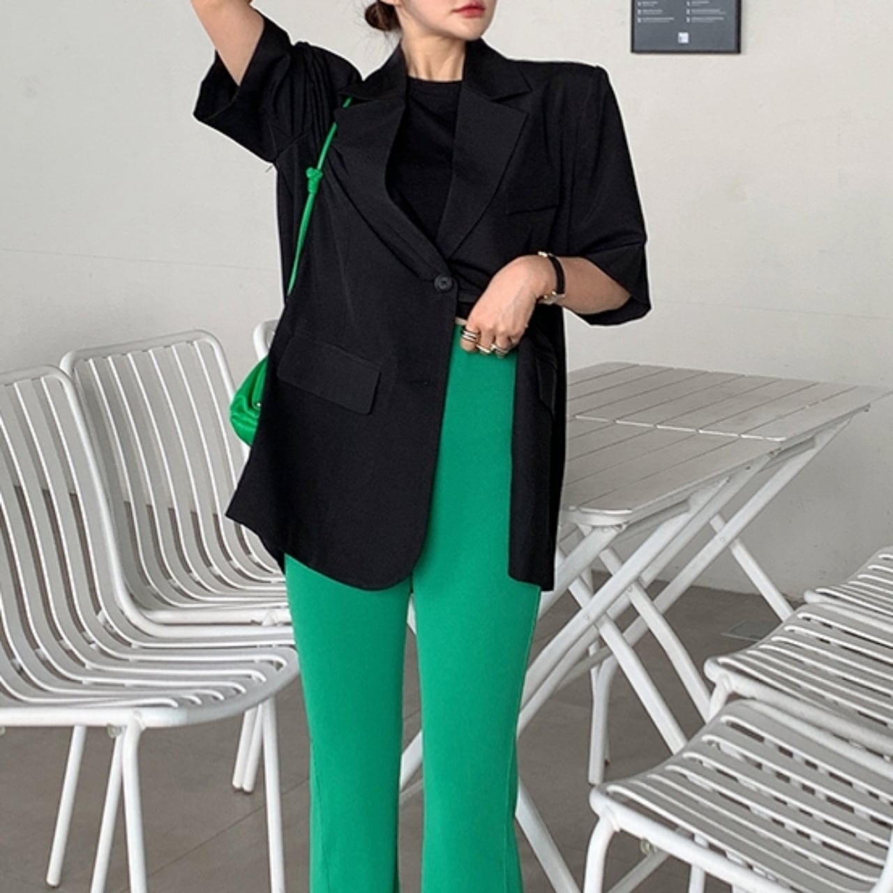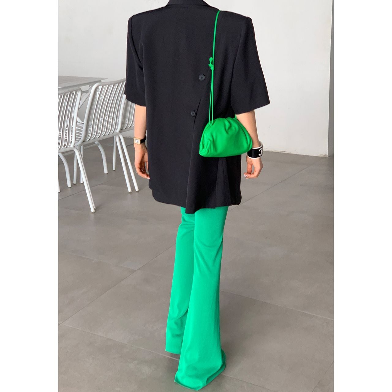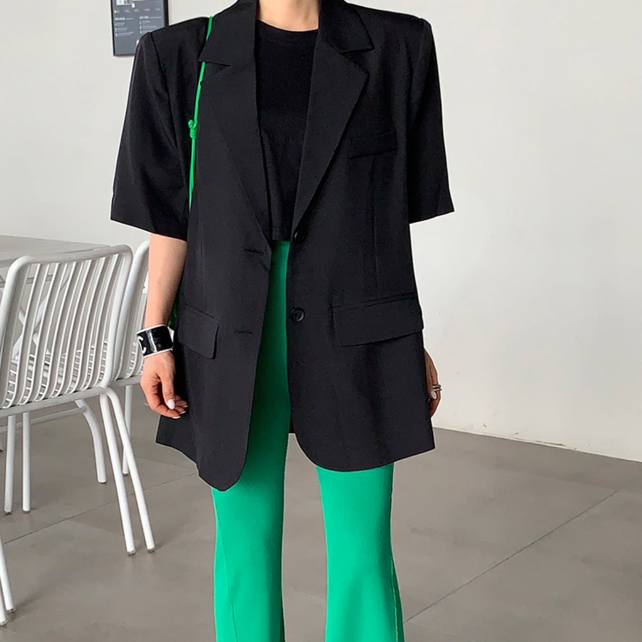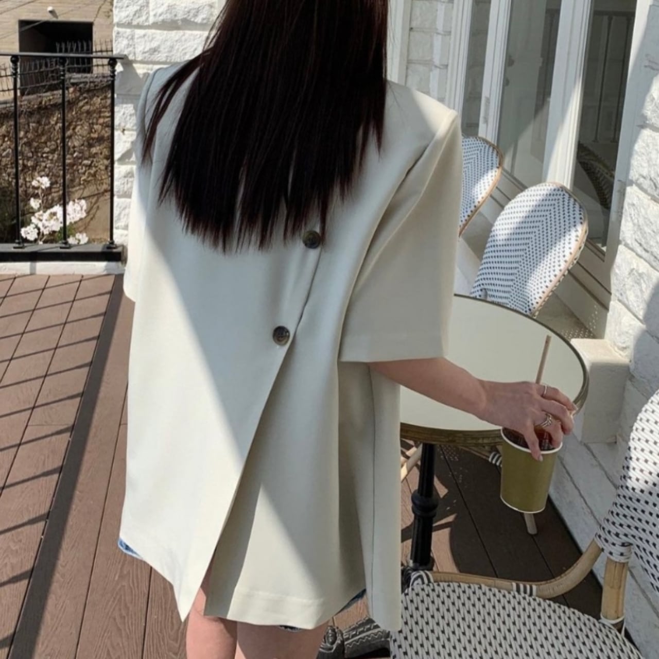 後ろのスリット入りで動きやすく、ラフに羽織れるシルエットながら洗練された雰囲気を演出します。