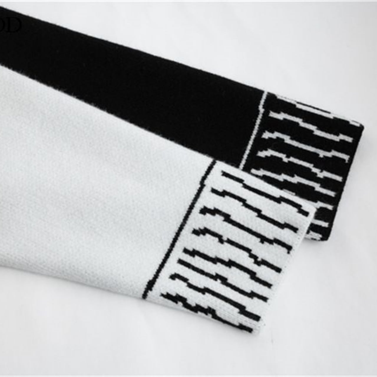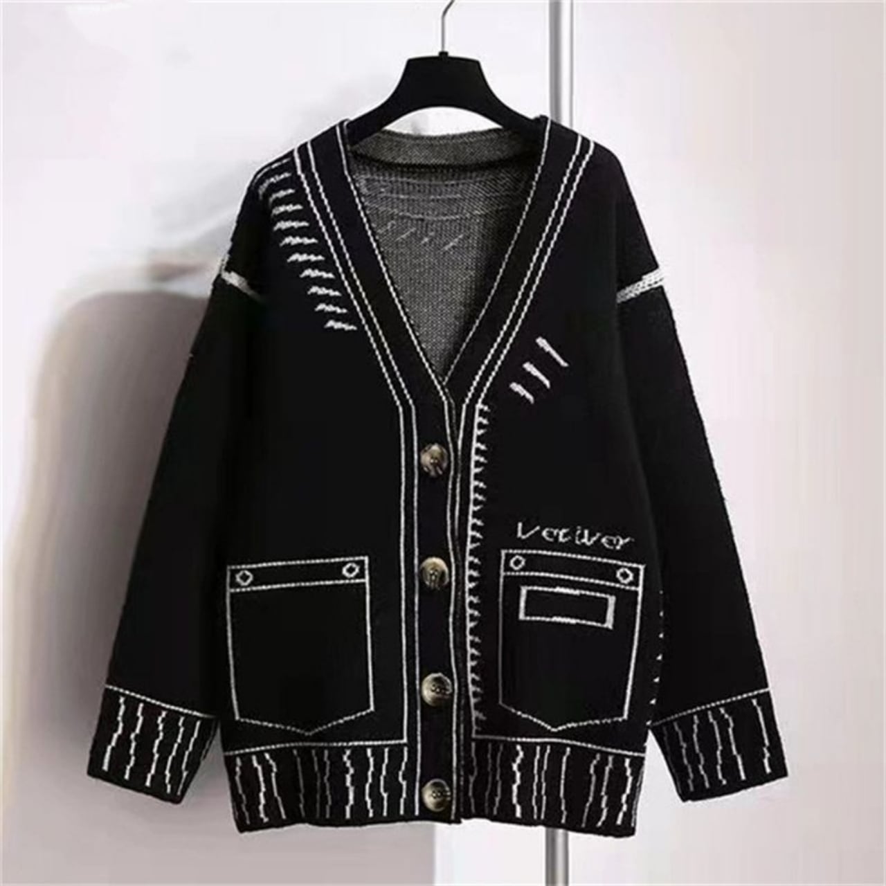 大胆なラインアート調のデザインが目を引く、ユニークなニットカーディガン。