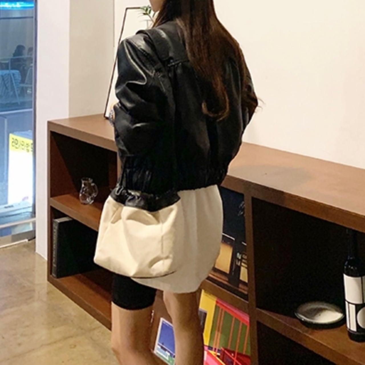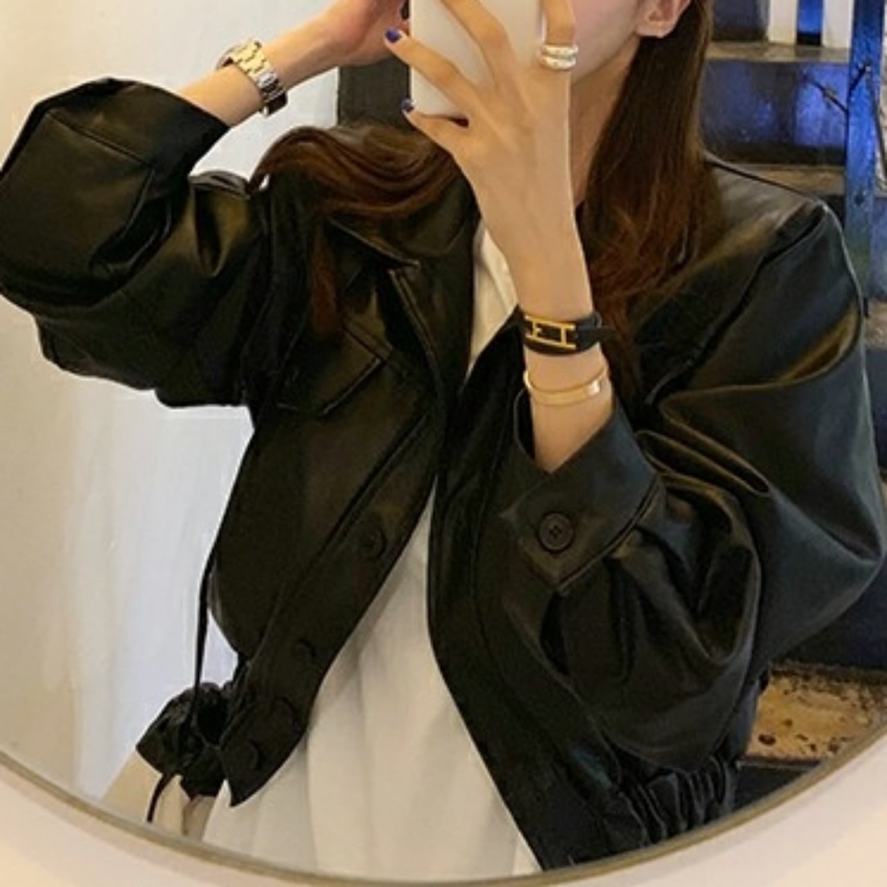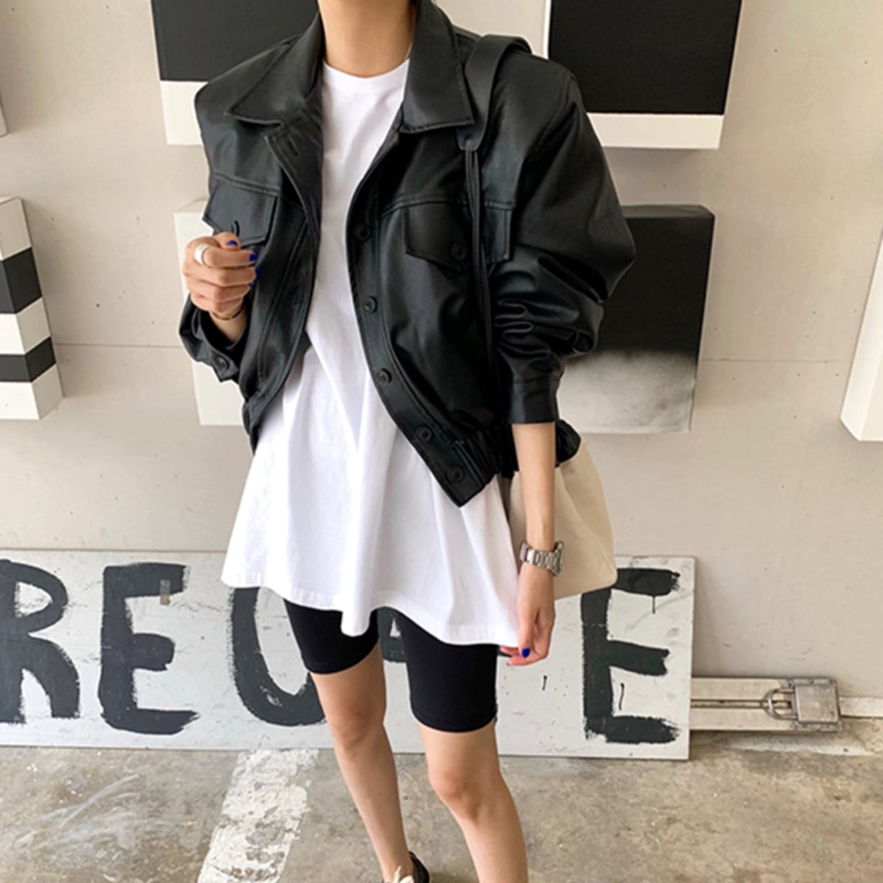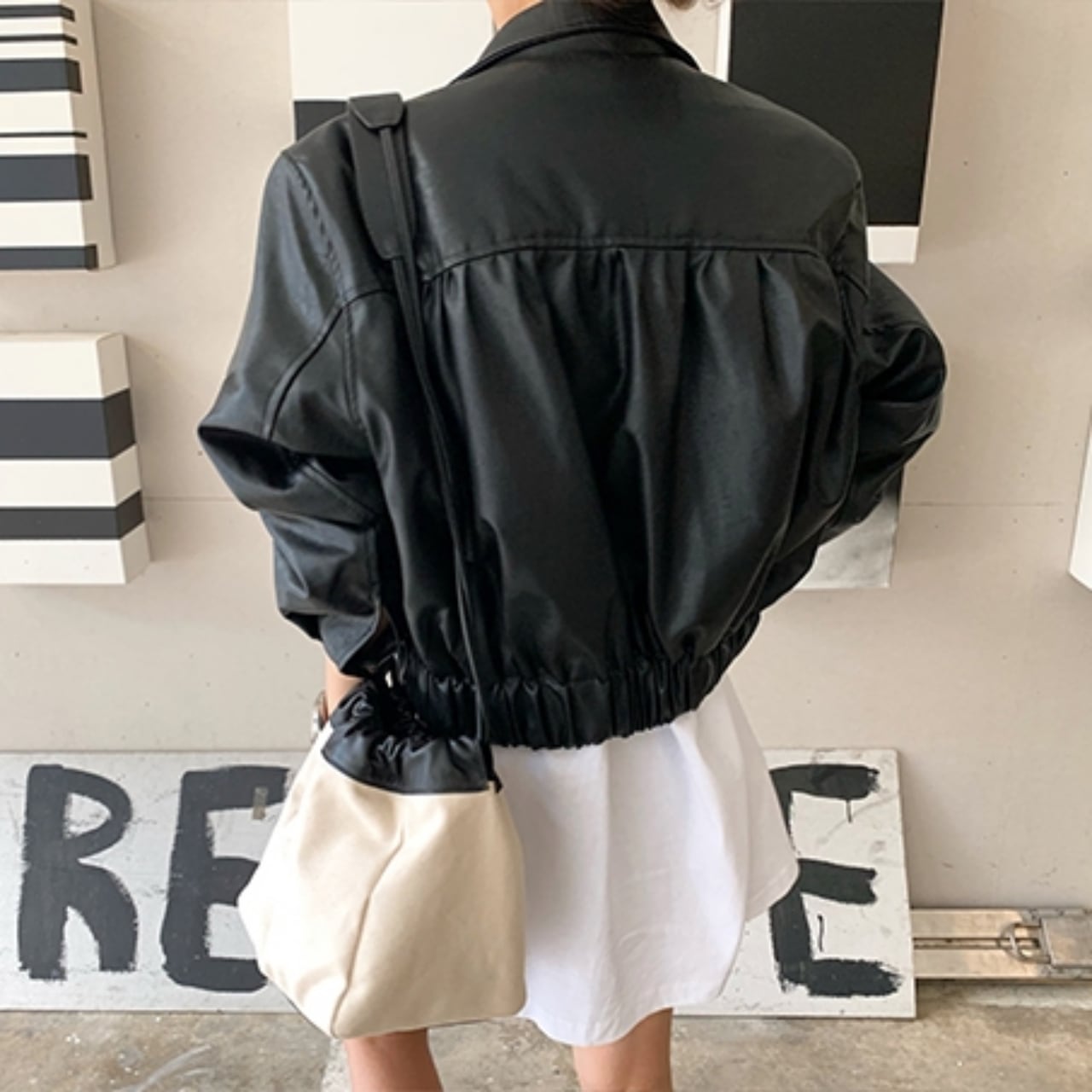ショート丈のフェイクレザージャケット。