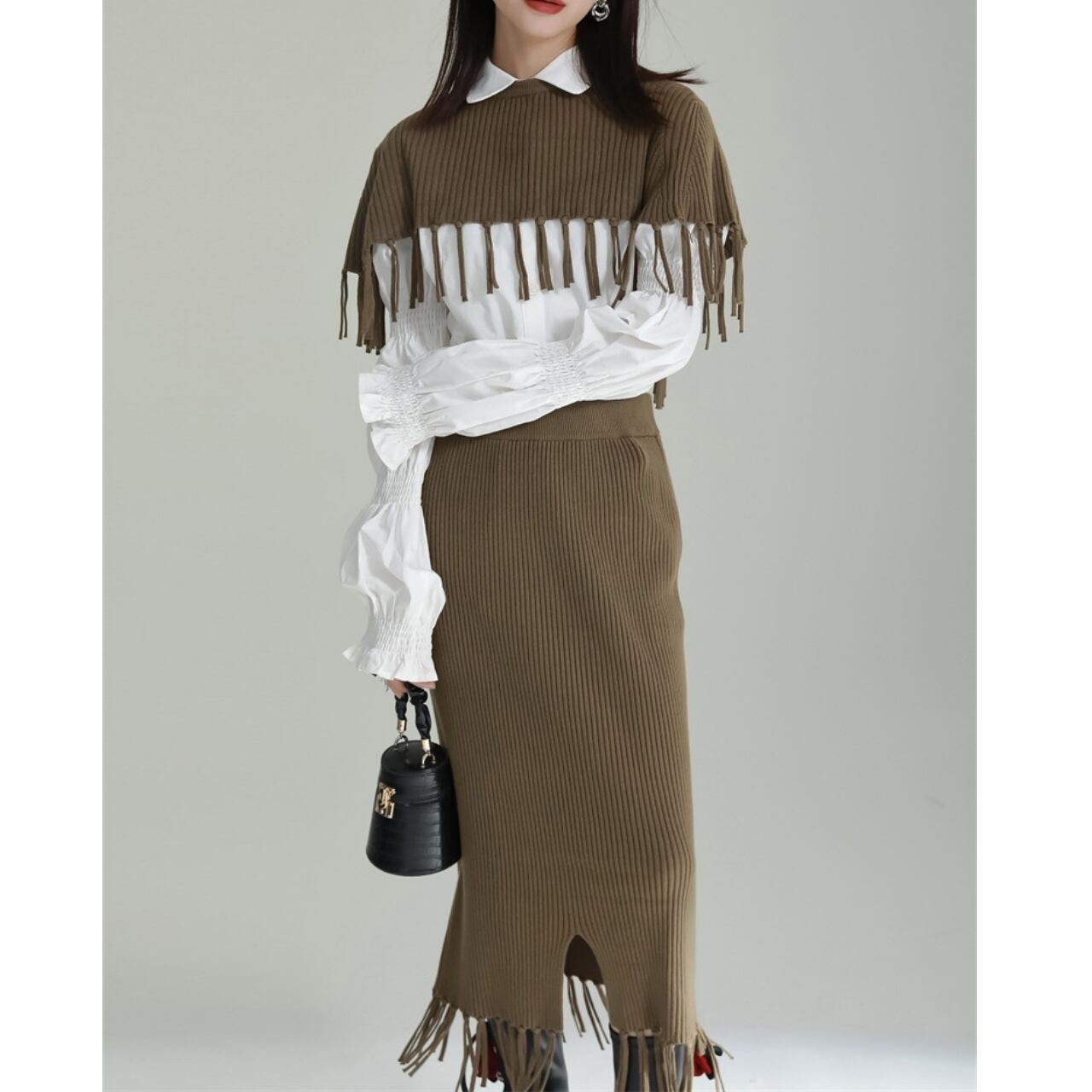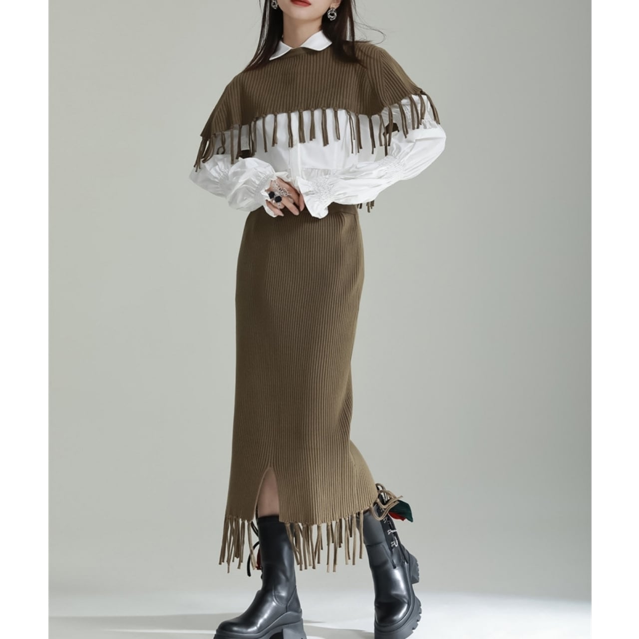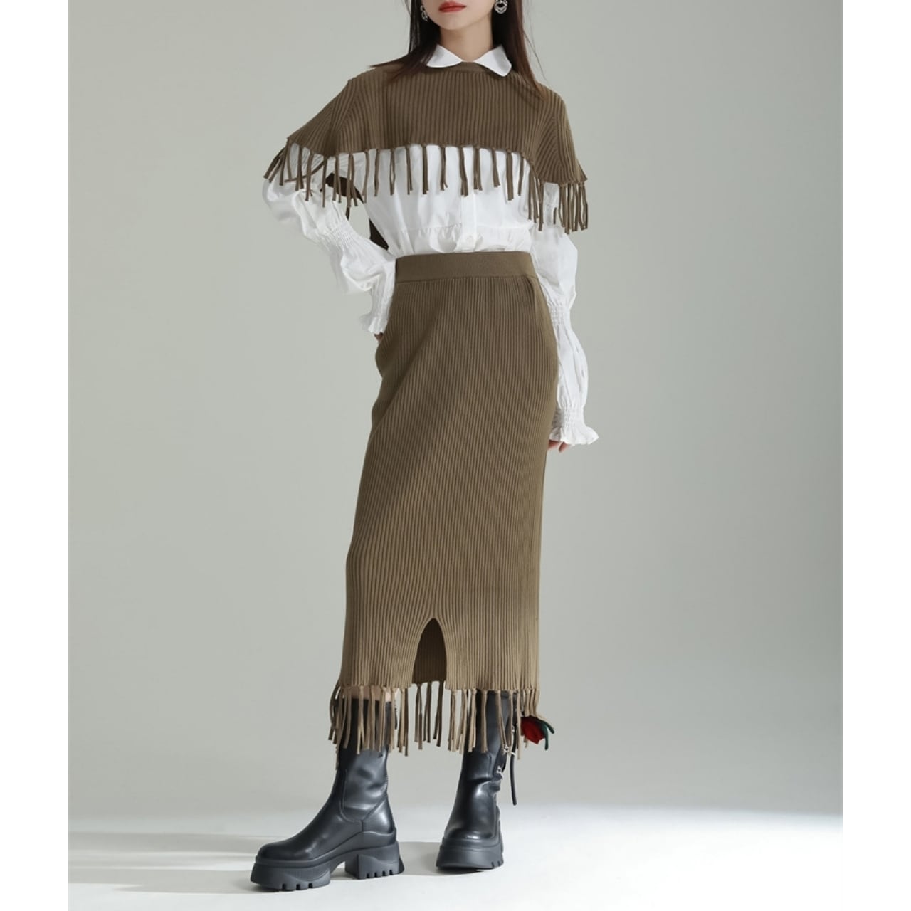 フリンジがポイントのロングスカートと、ケープデザインのトップスのセット。