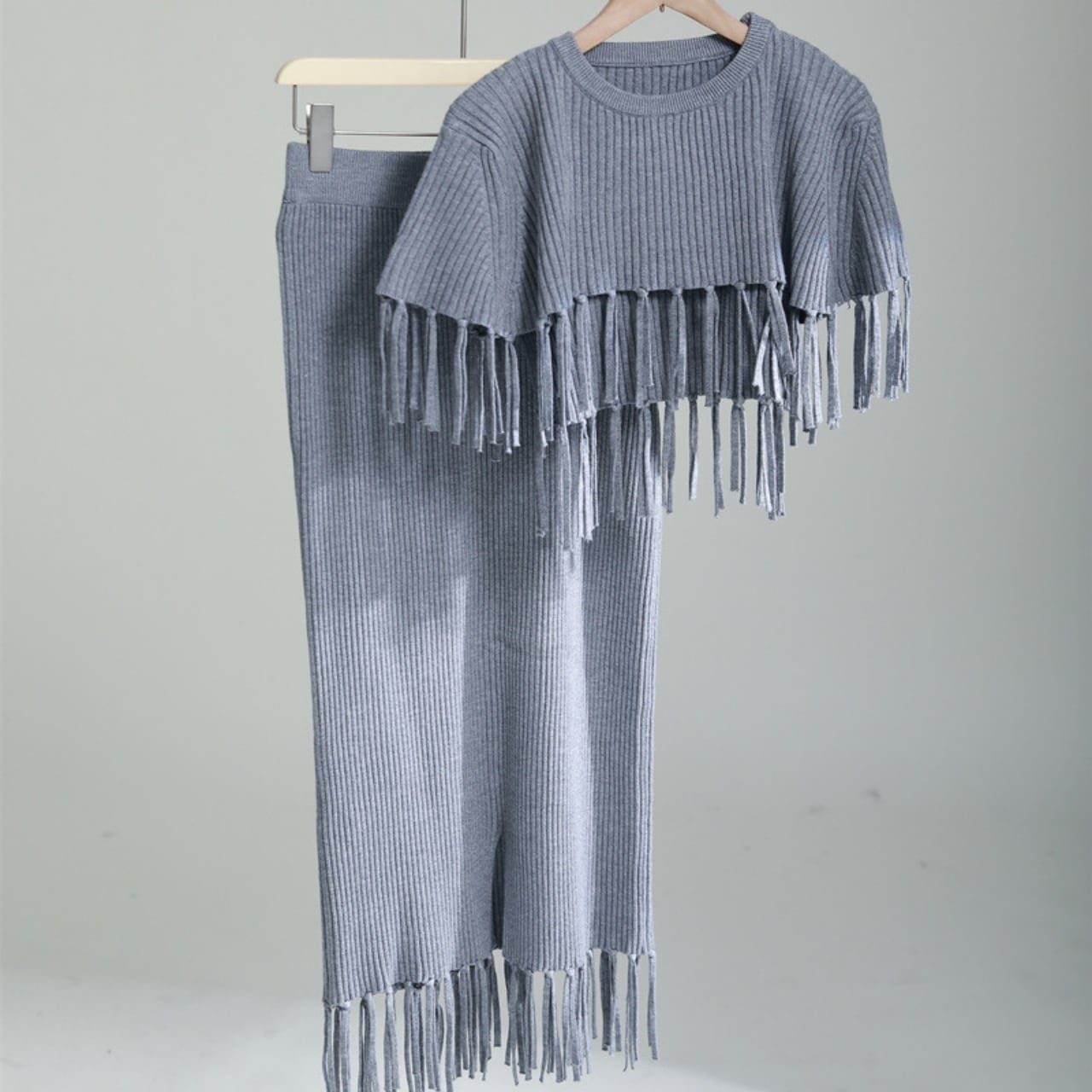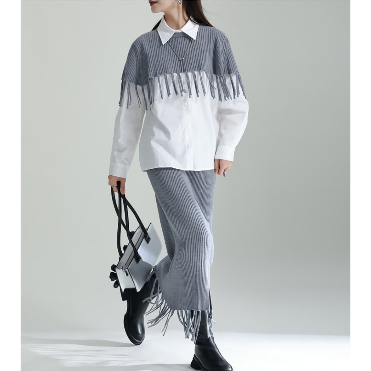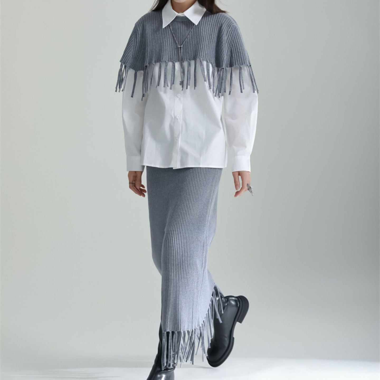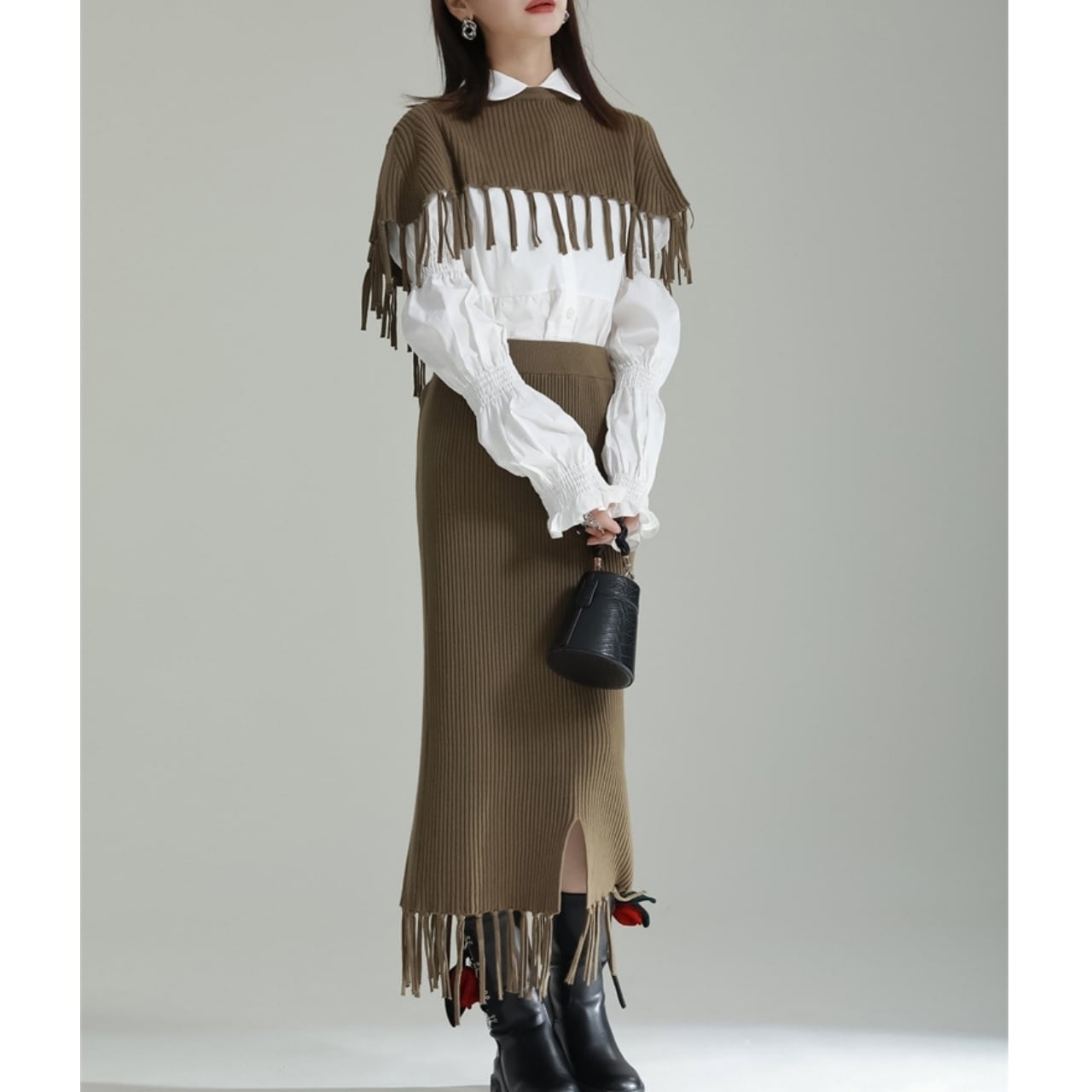 フリンジがポイントのロングスカートと、ケープデザインのトップスのセット。