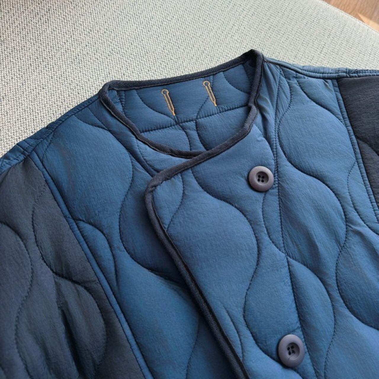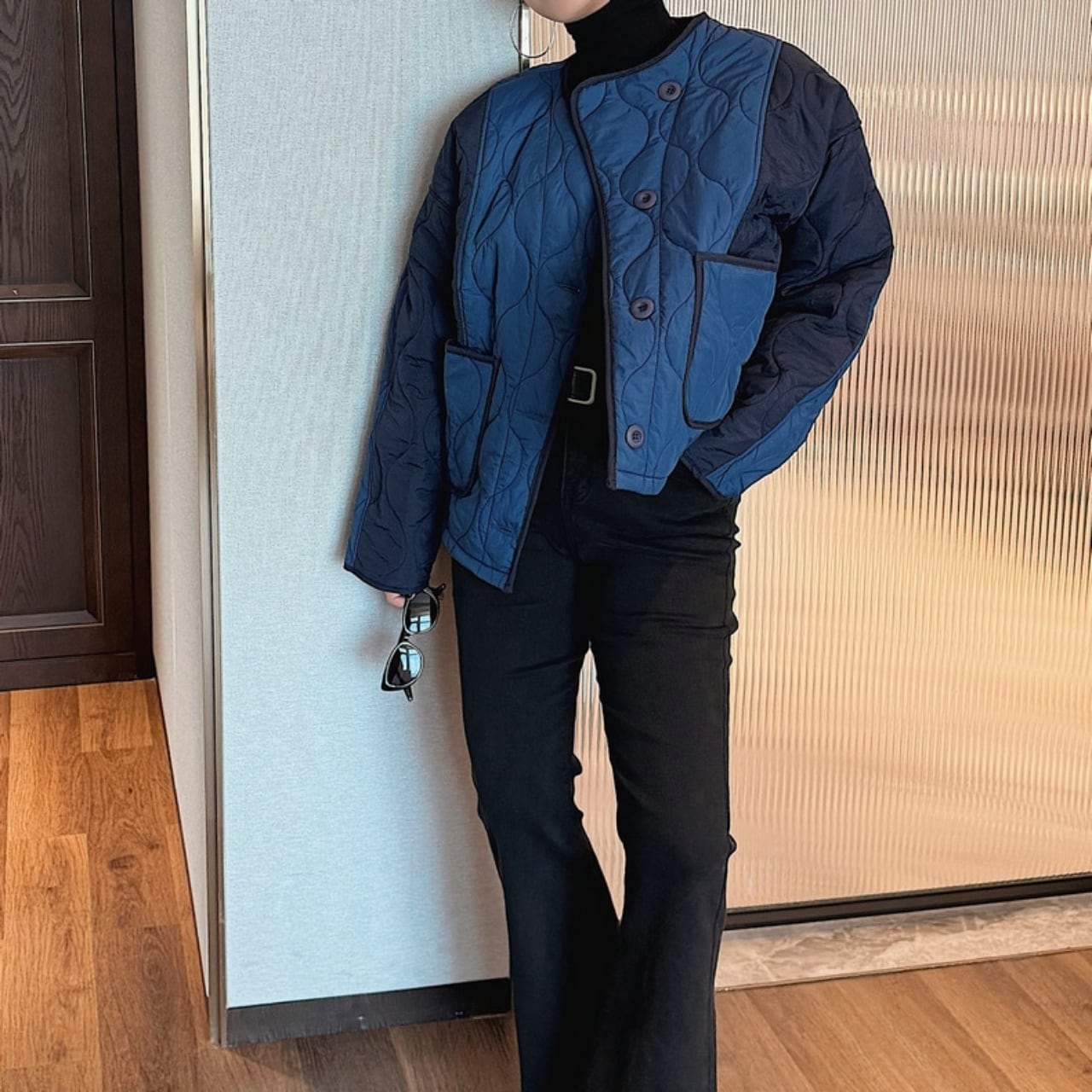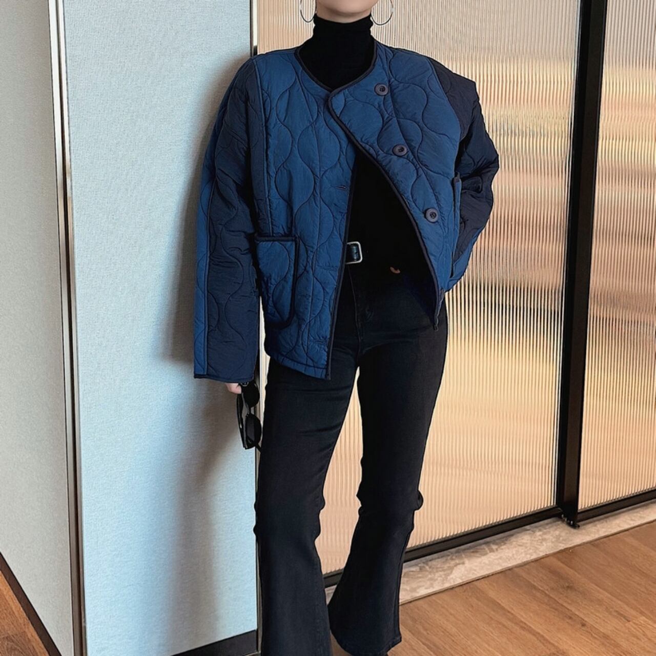 目を引くキルティングデザインとノーカラーのすっきりしたシルエット。
