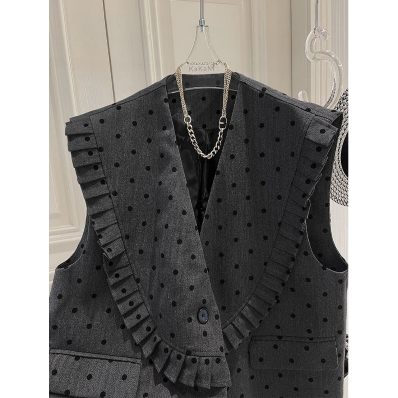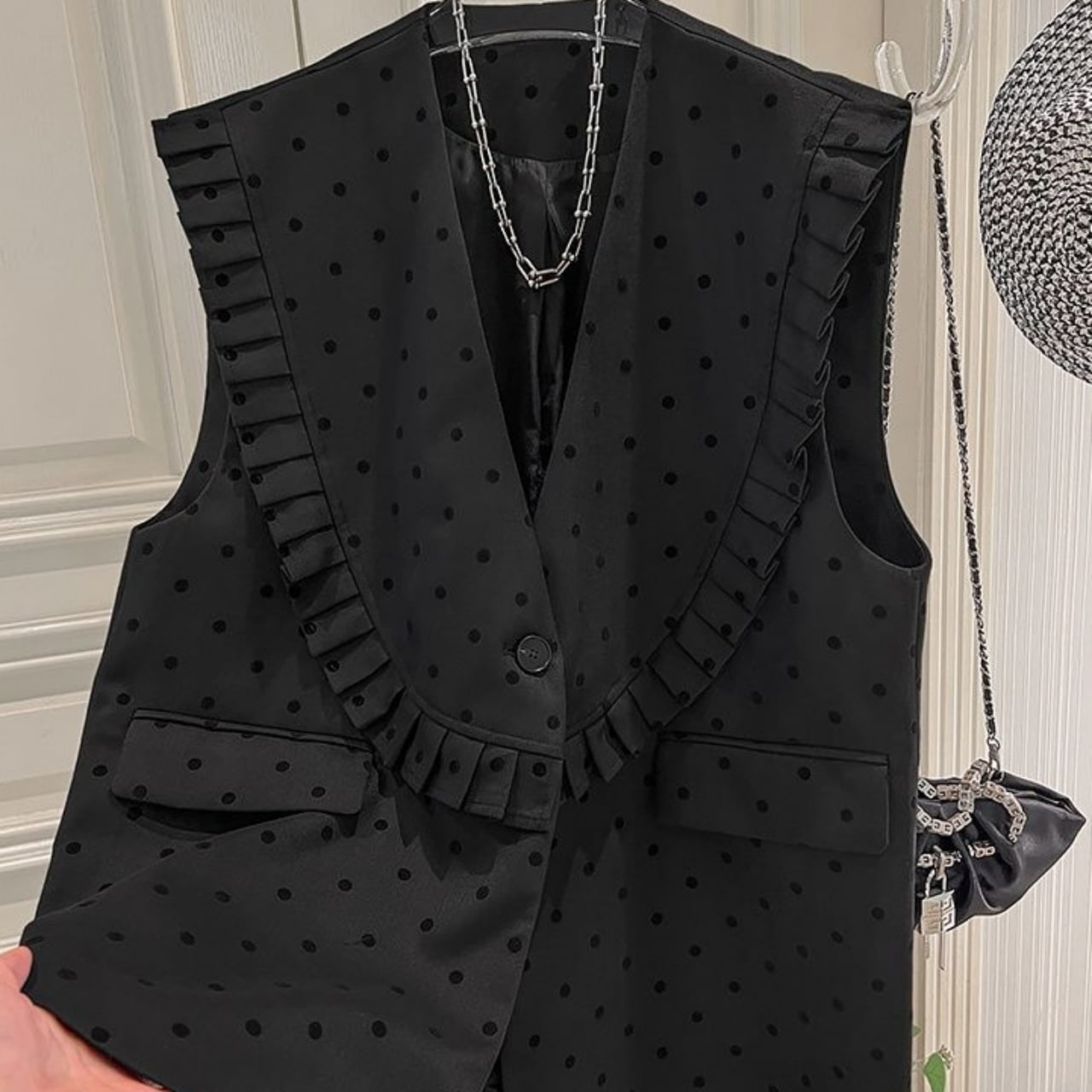 フリルをあしらったオープンカラーが目を惹くベスト。
