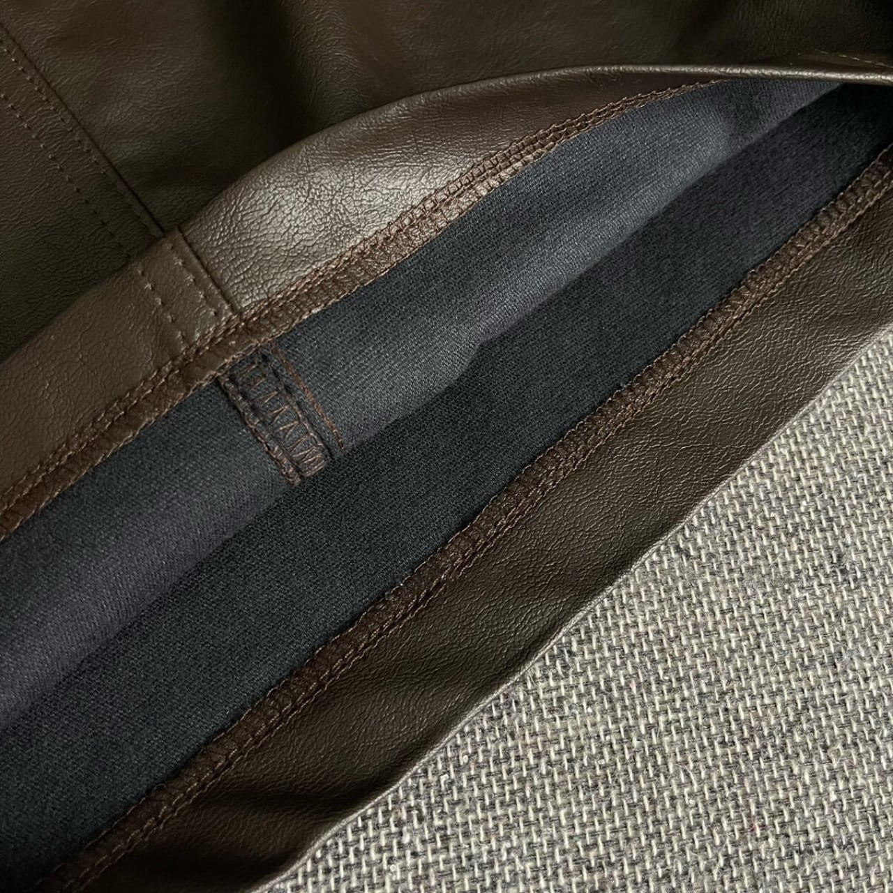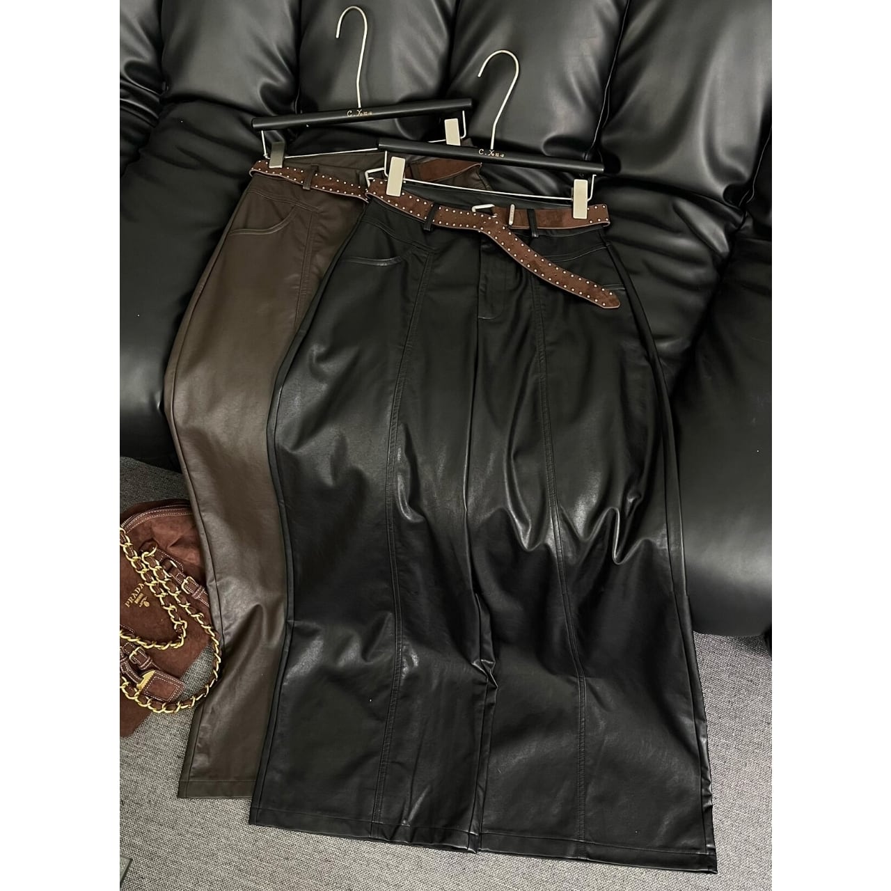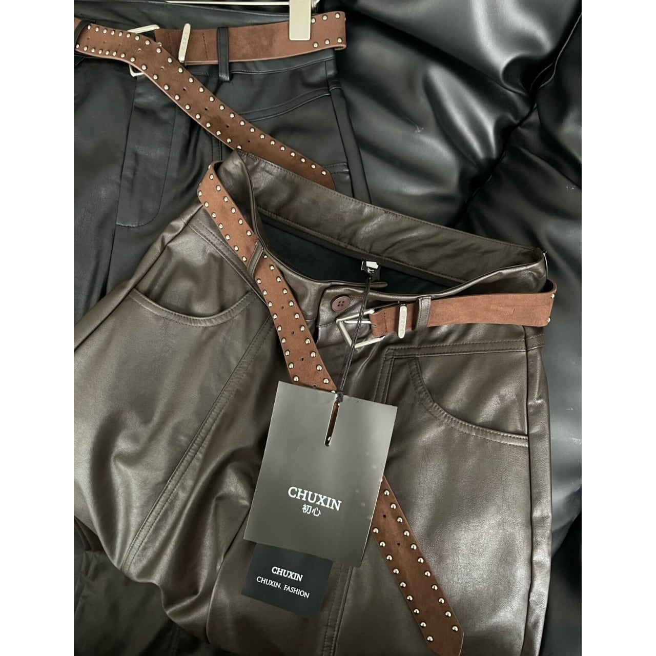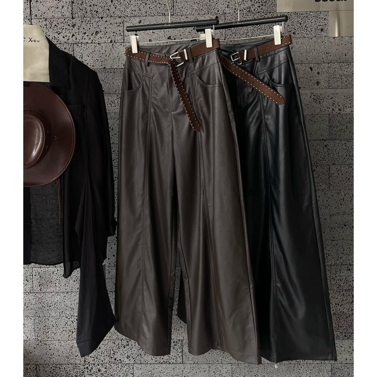 スタイリッシュな着こなしを叶えるベルト付きフェイクレザーパンツ。
