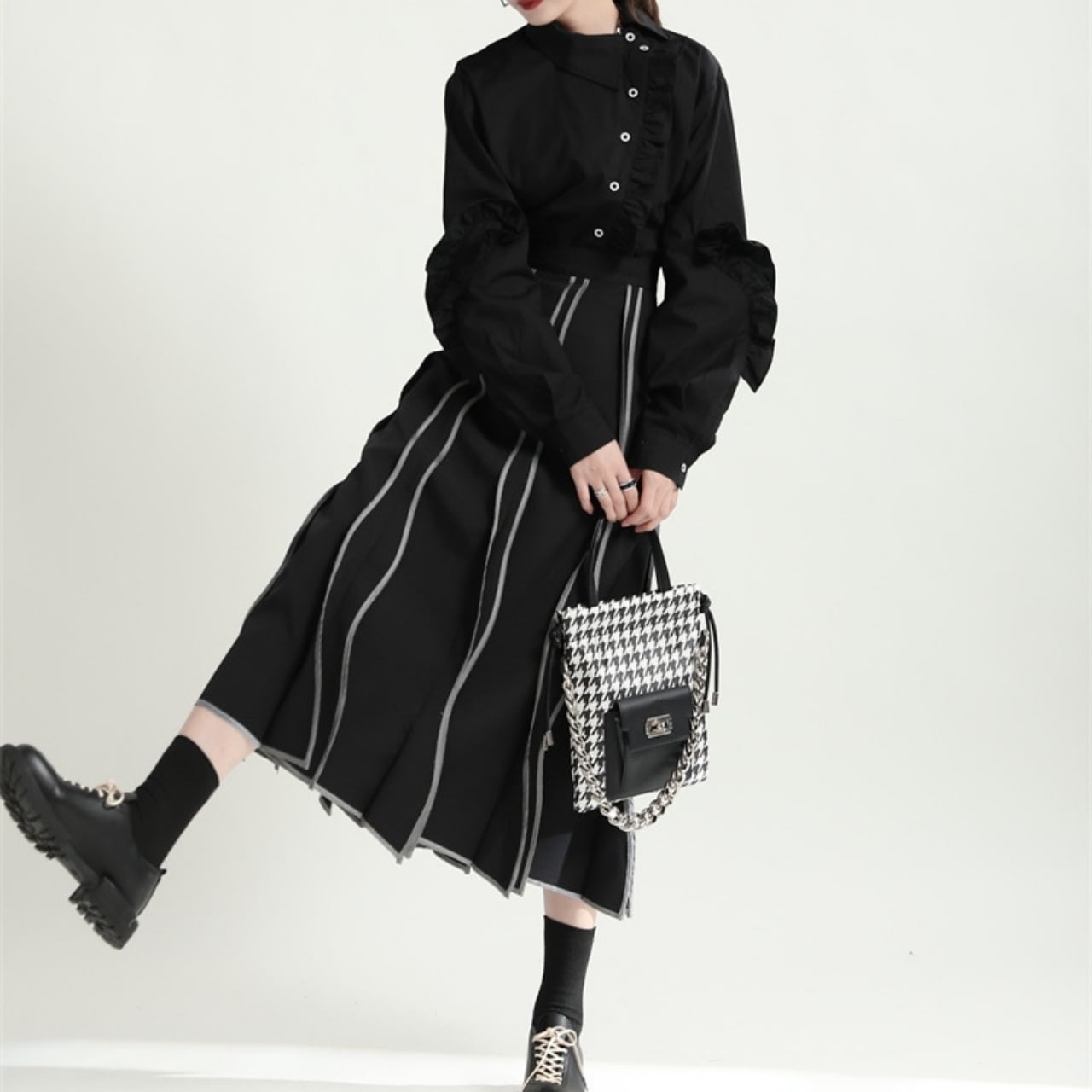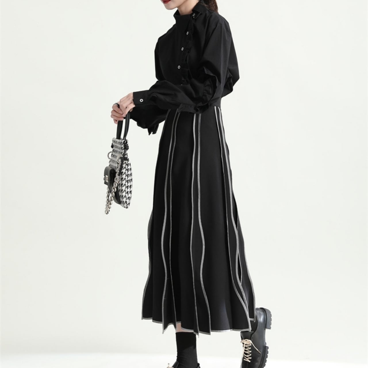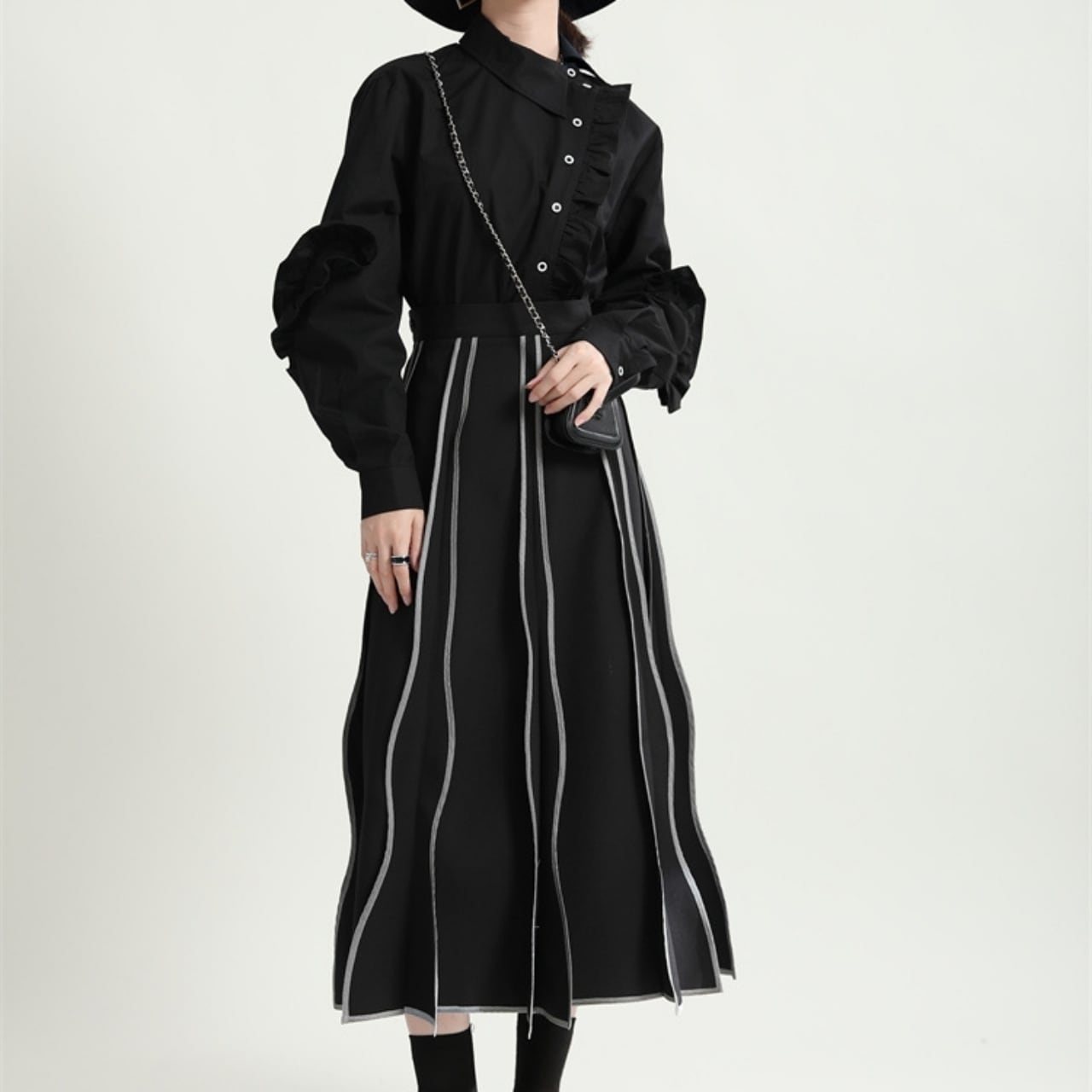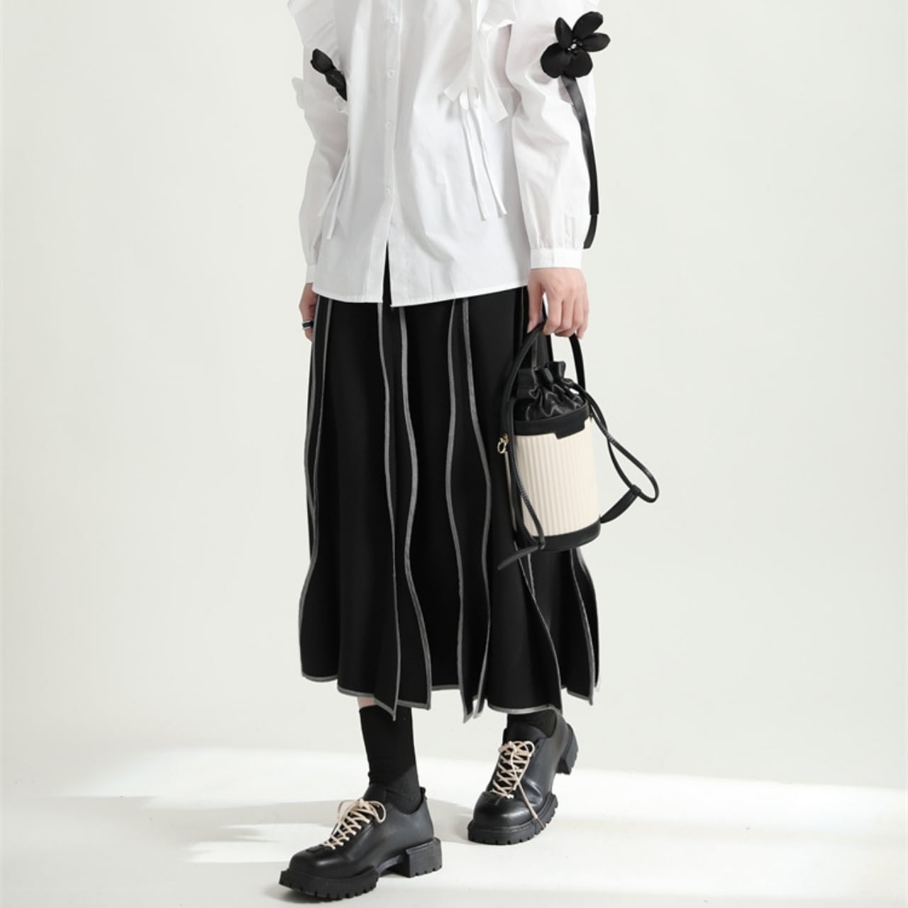 ミディ丈で上品さを演出しつつ、裾にかけて広がるフレアが女性らしさを引き立てます。