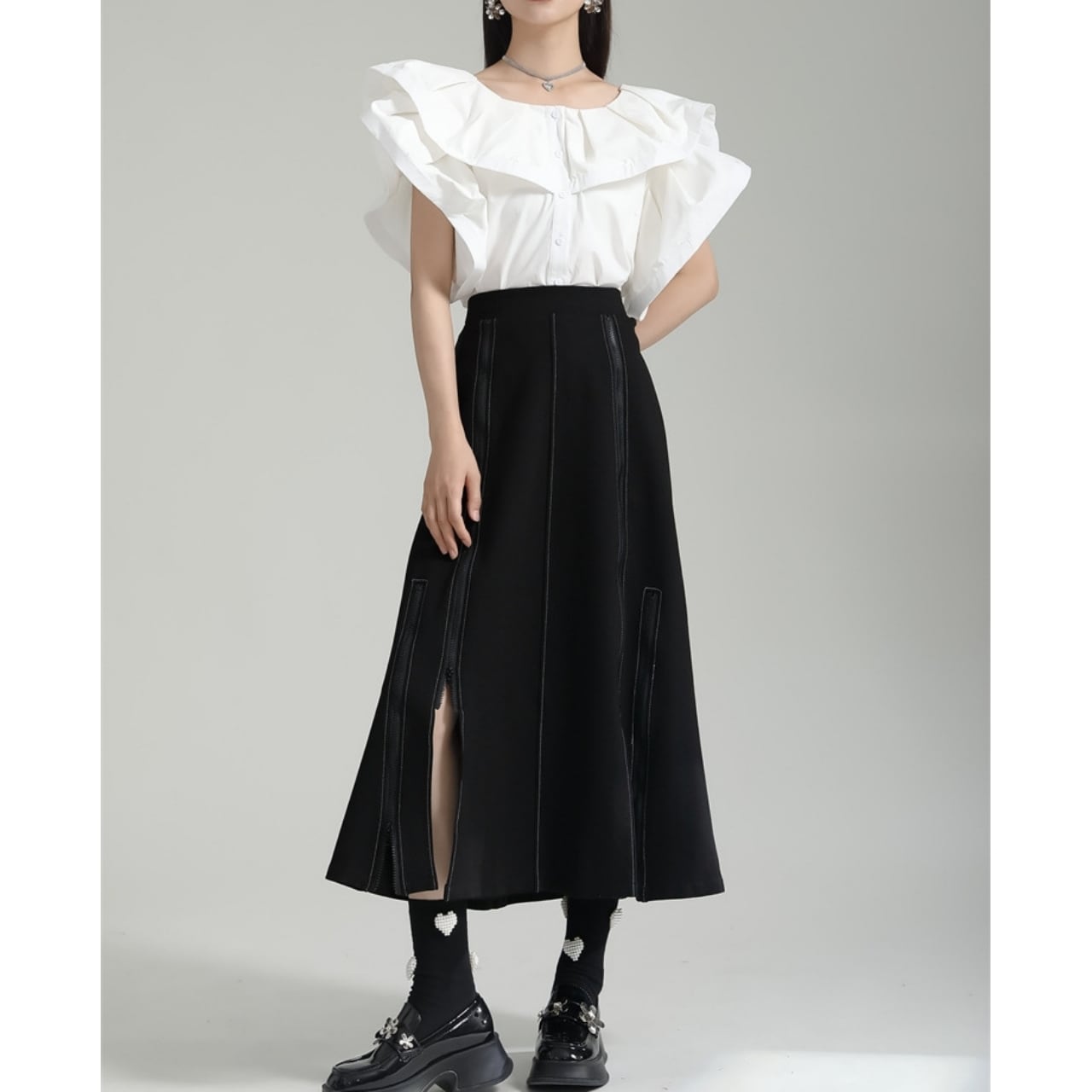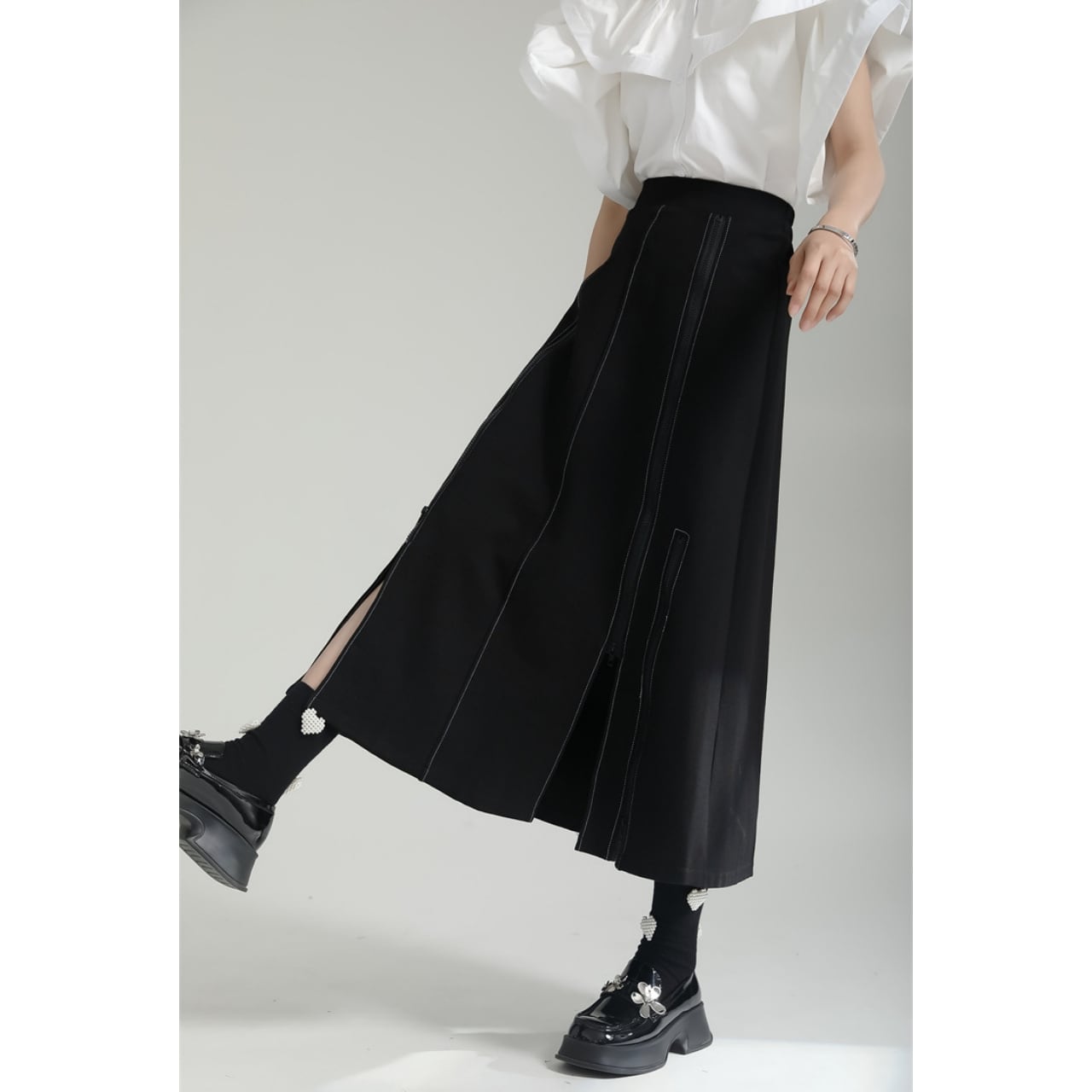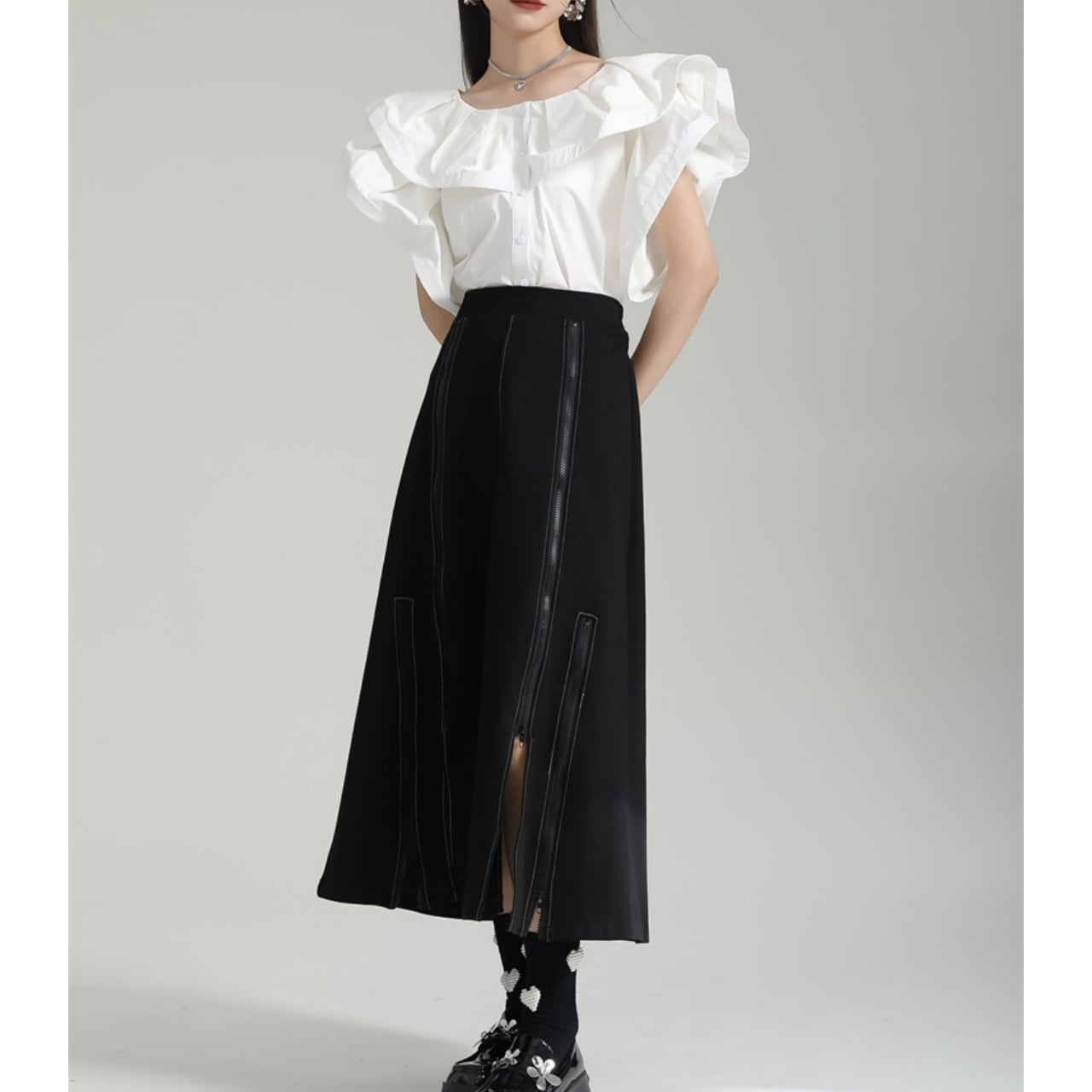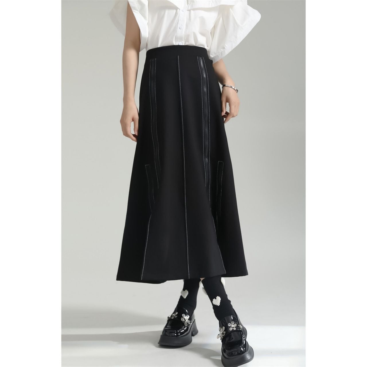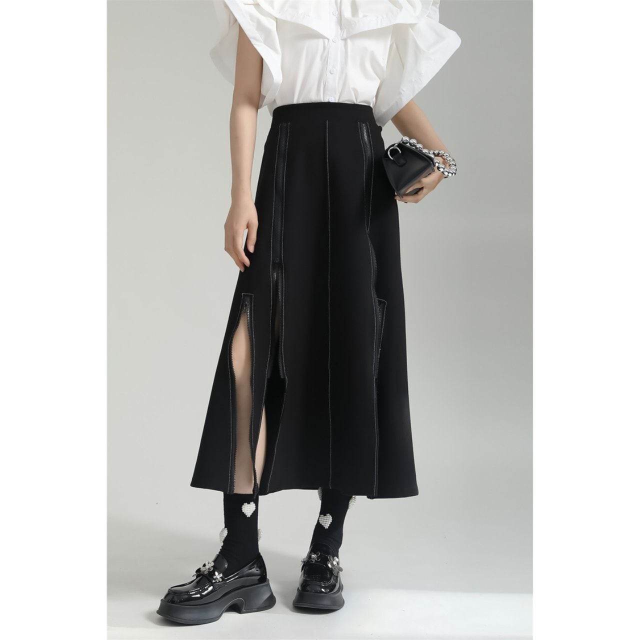 縦のラインがすっきり見えるスリットジッパー付きAラインスカート。