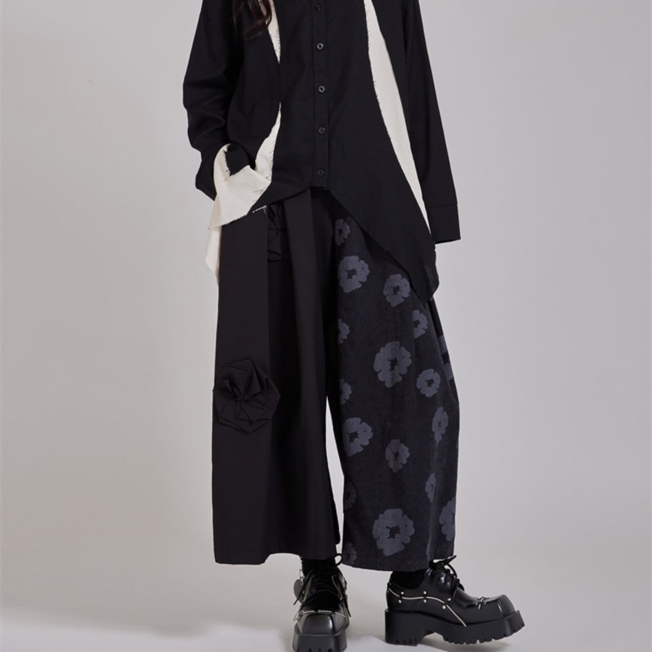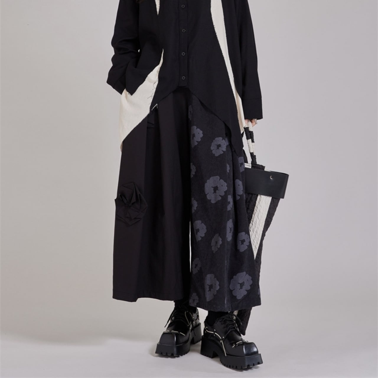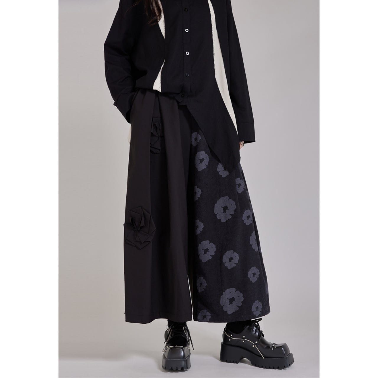 異なる素材を組み合わせた、デザイン性の高いワイドレッグパンツ。