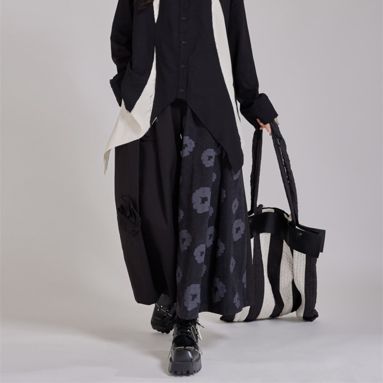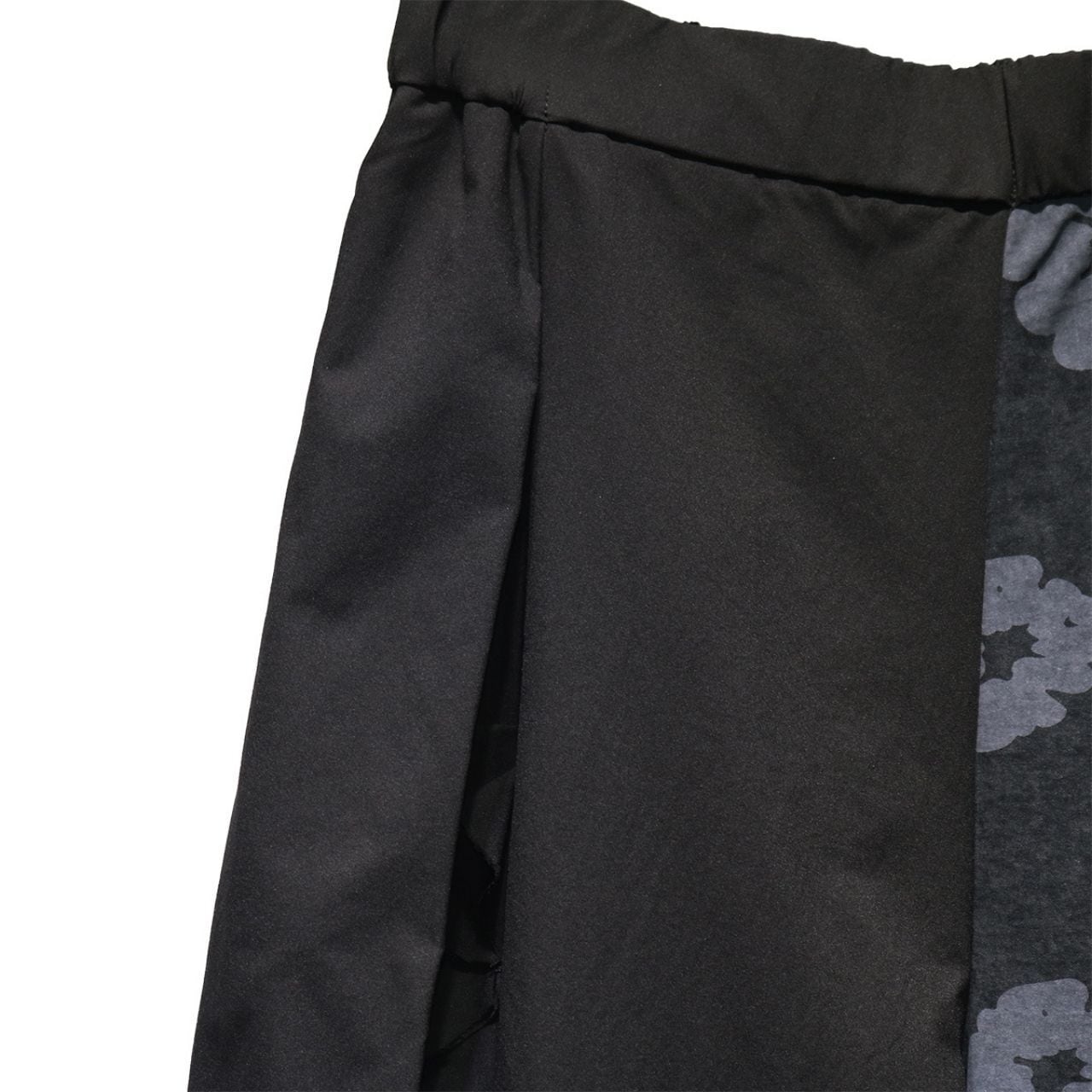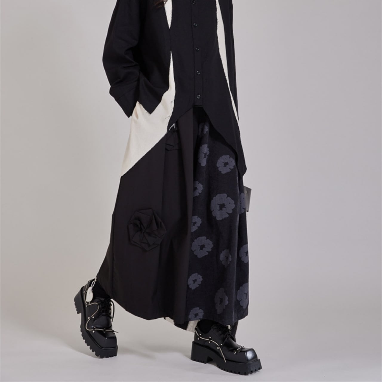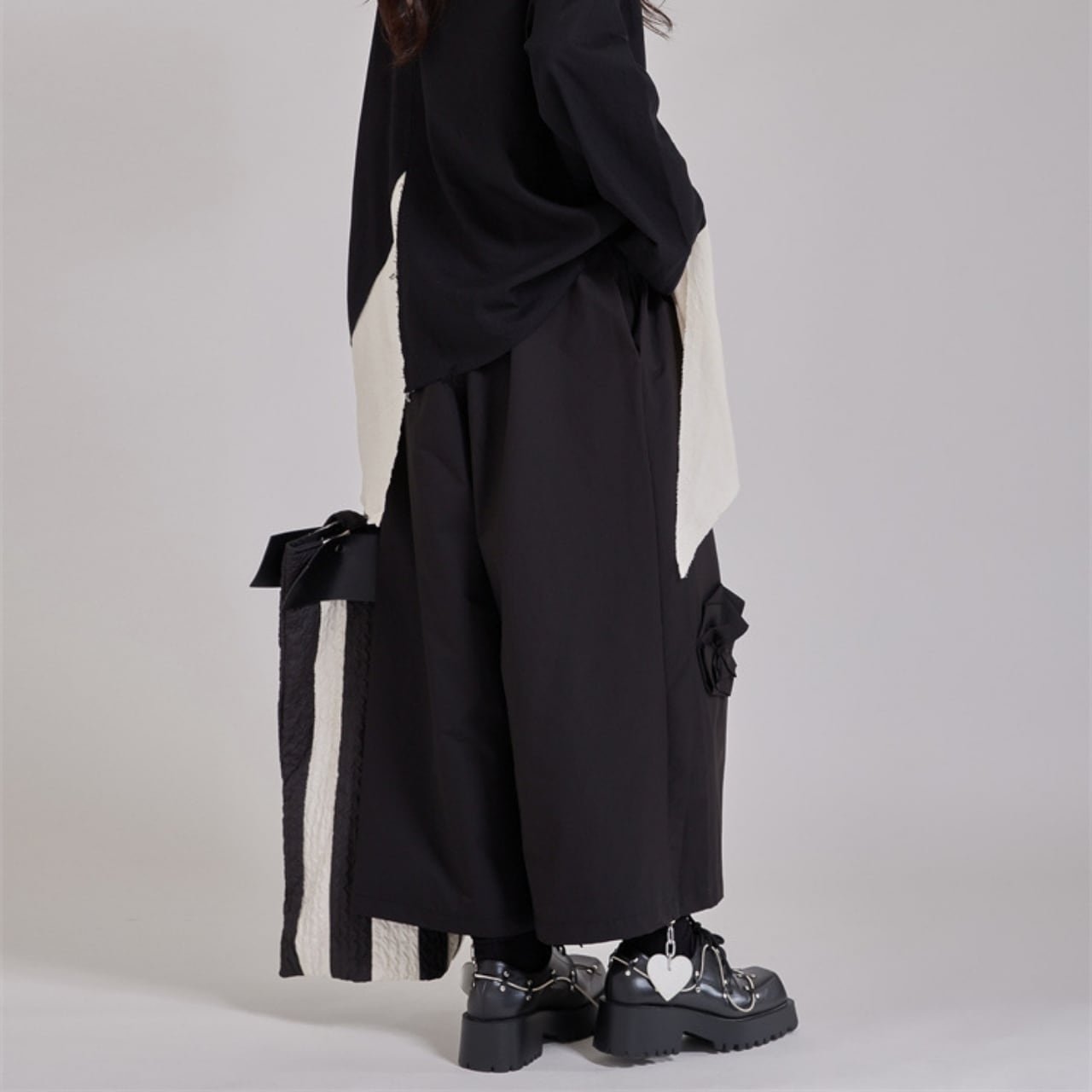 異なる素材を組み合わせた、デザイン性の高いワイドレッグパンツ。