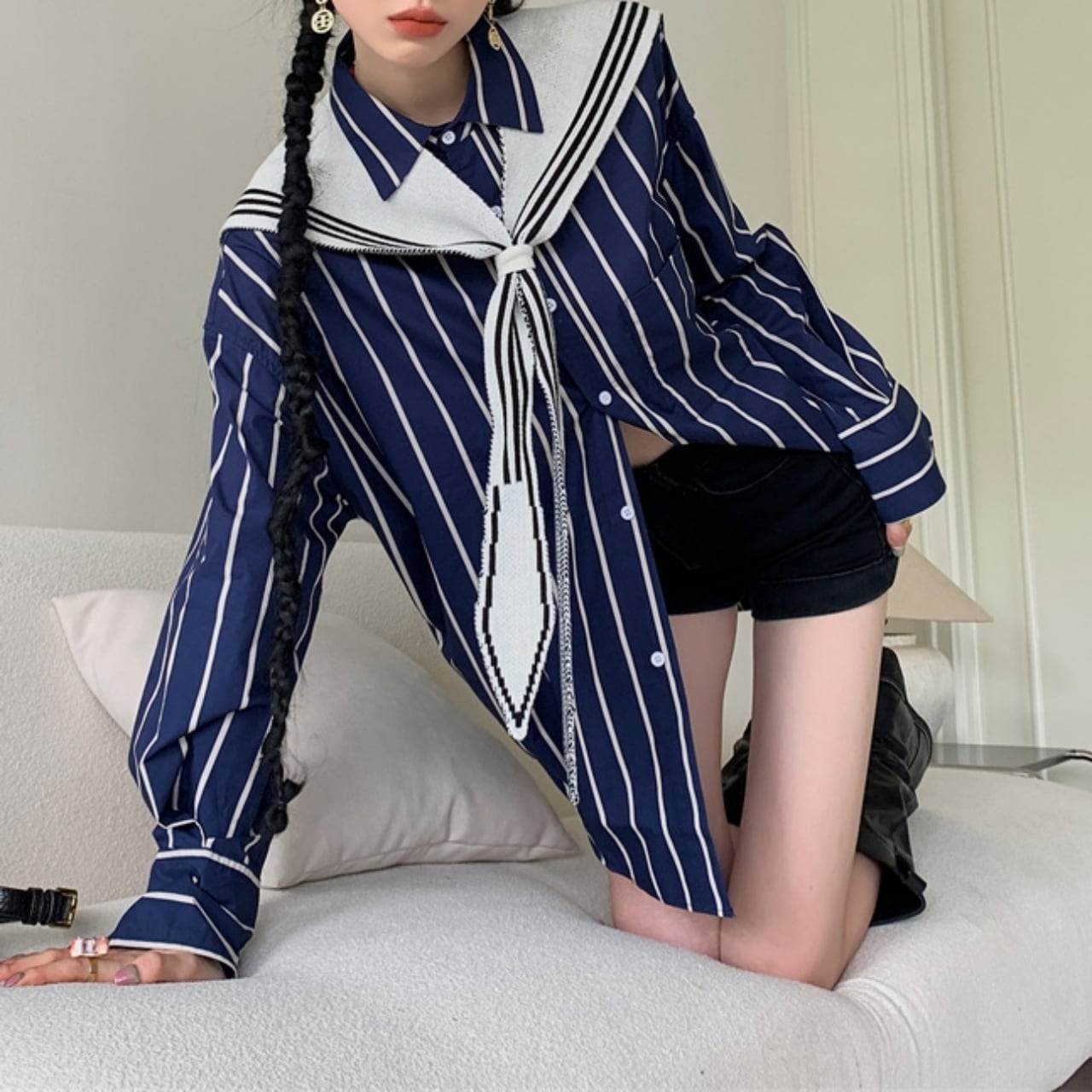 ストライプ柄が目を引く、セーラーカラーの長袖シャツ。