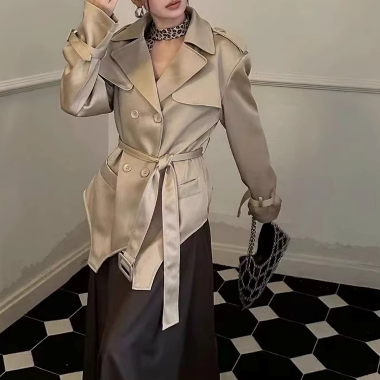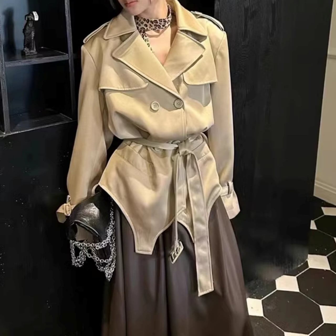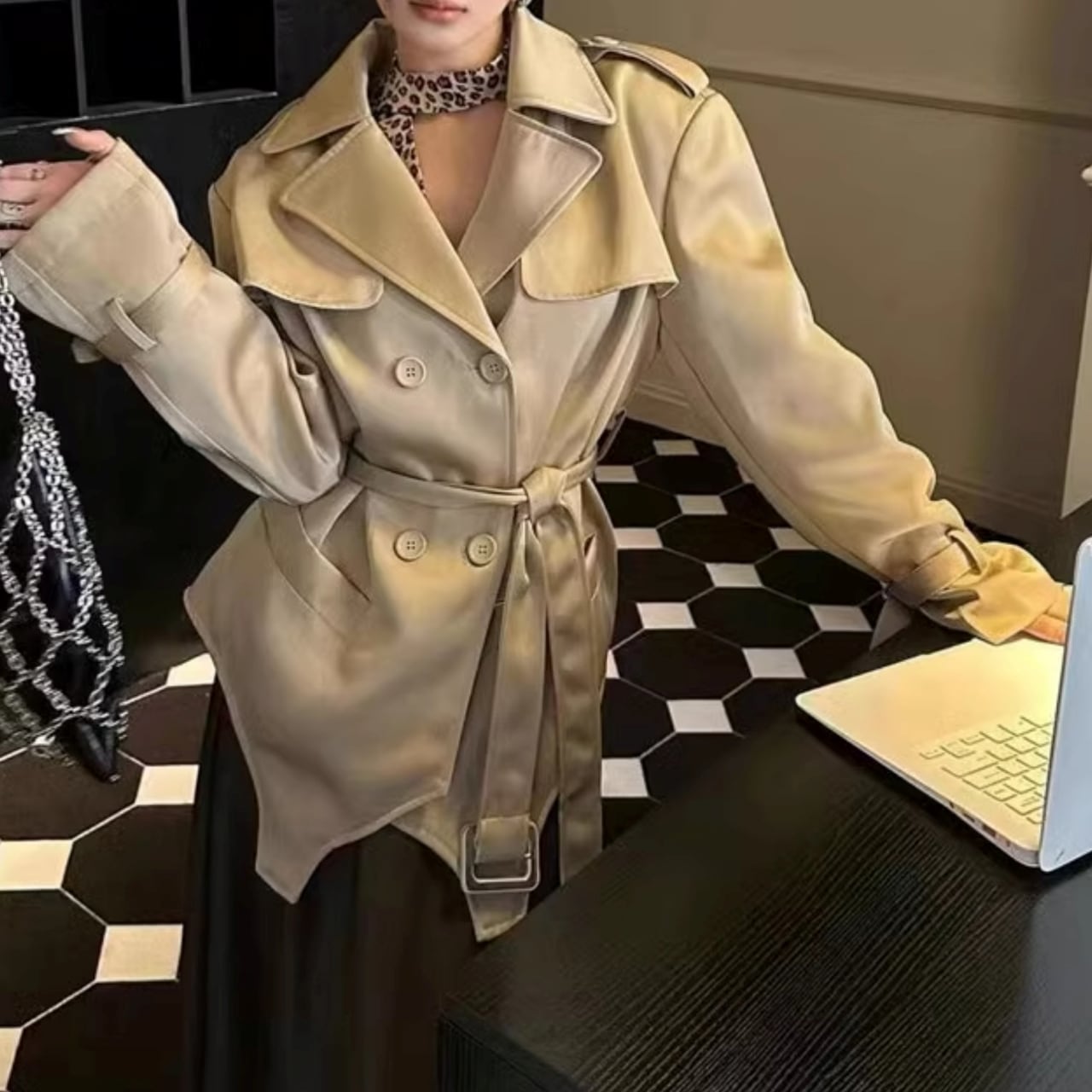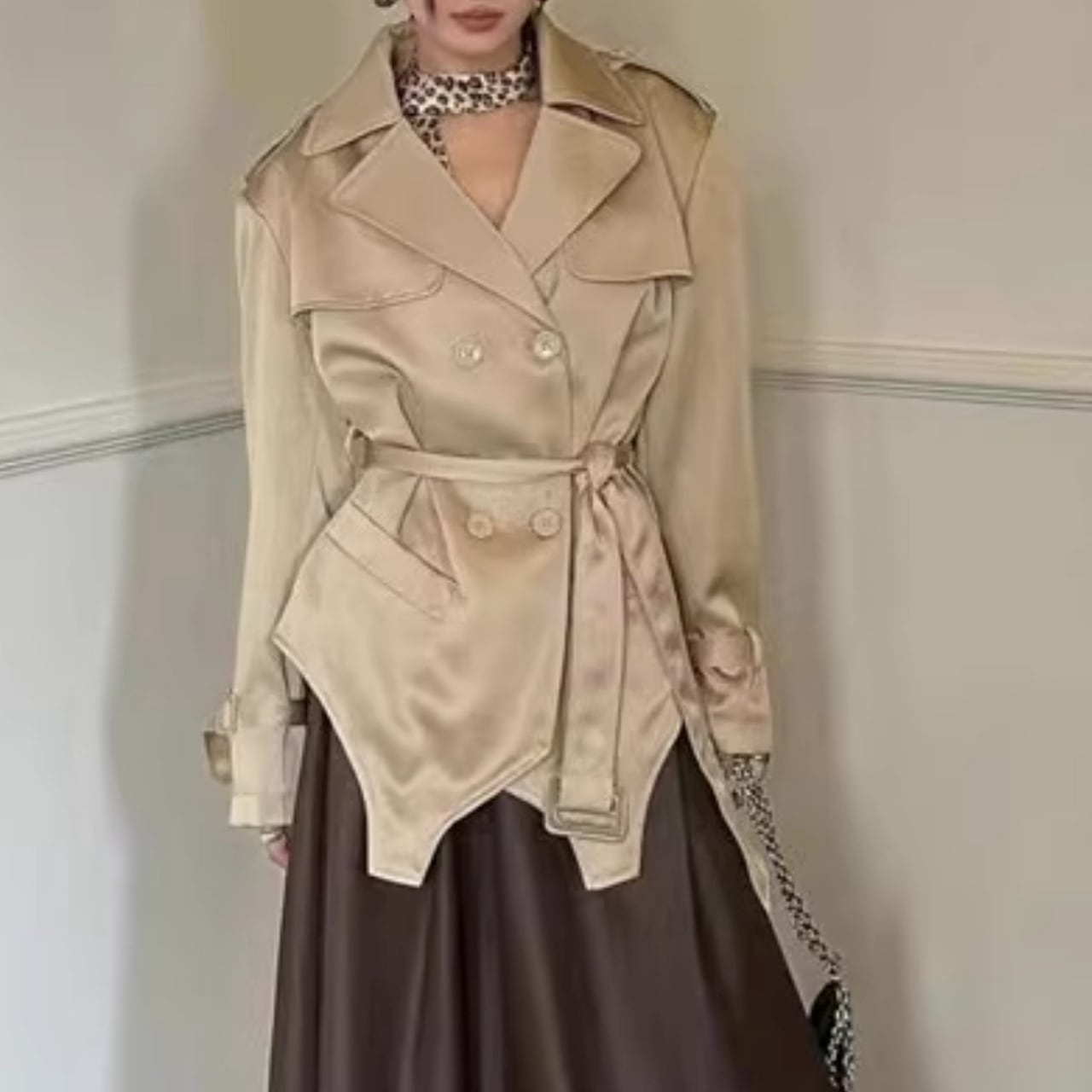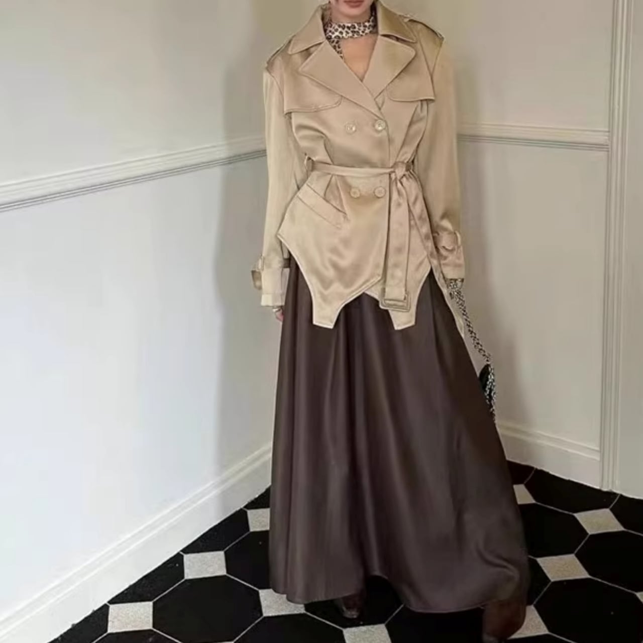 ダブルブレストにウエストベルトで引き締める、ミディ丈ジャケット。