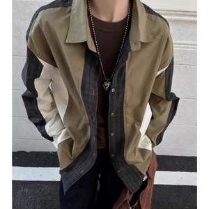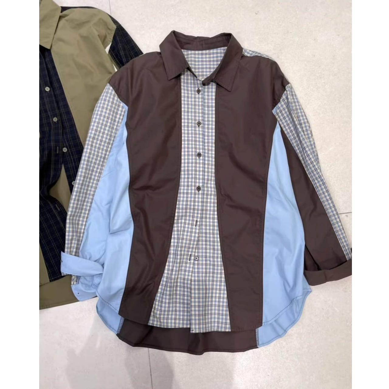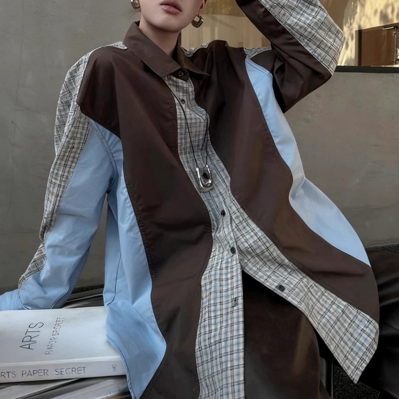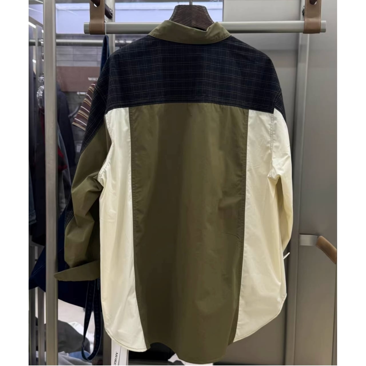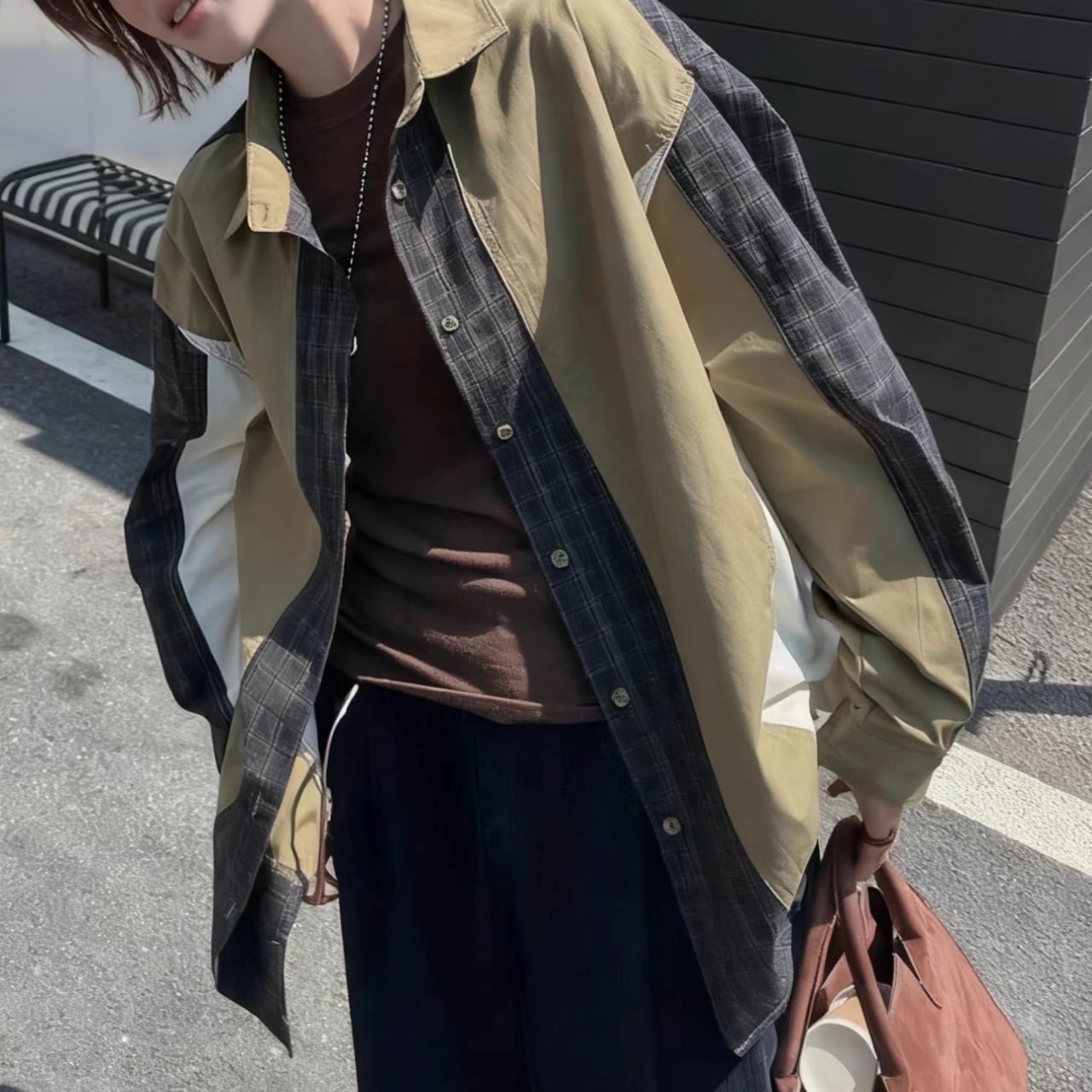 異なるカラーとパターンを組み合わせた、遊び心あふれる長袖シャツ。