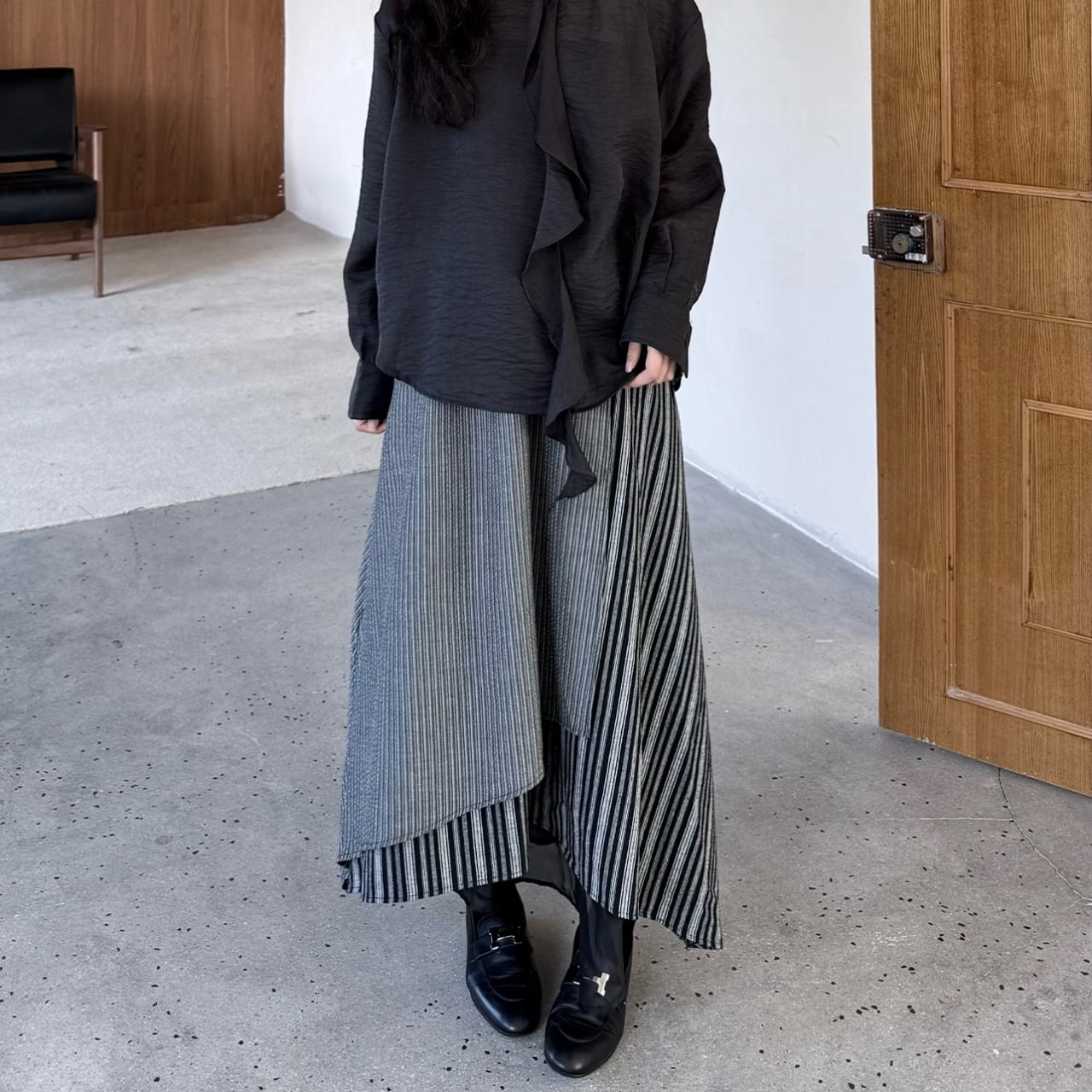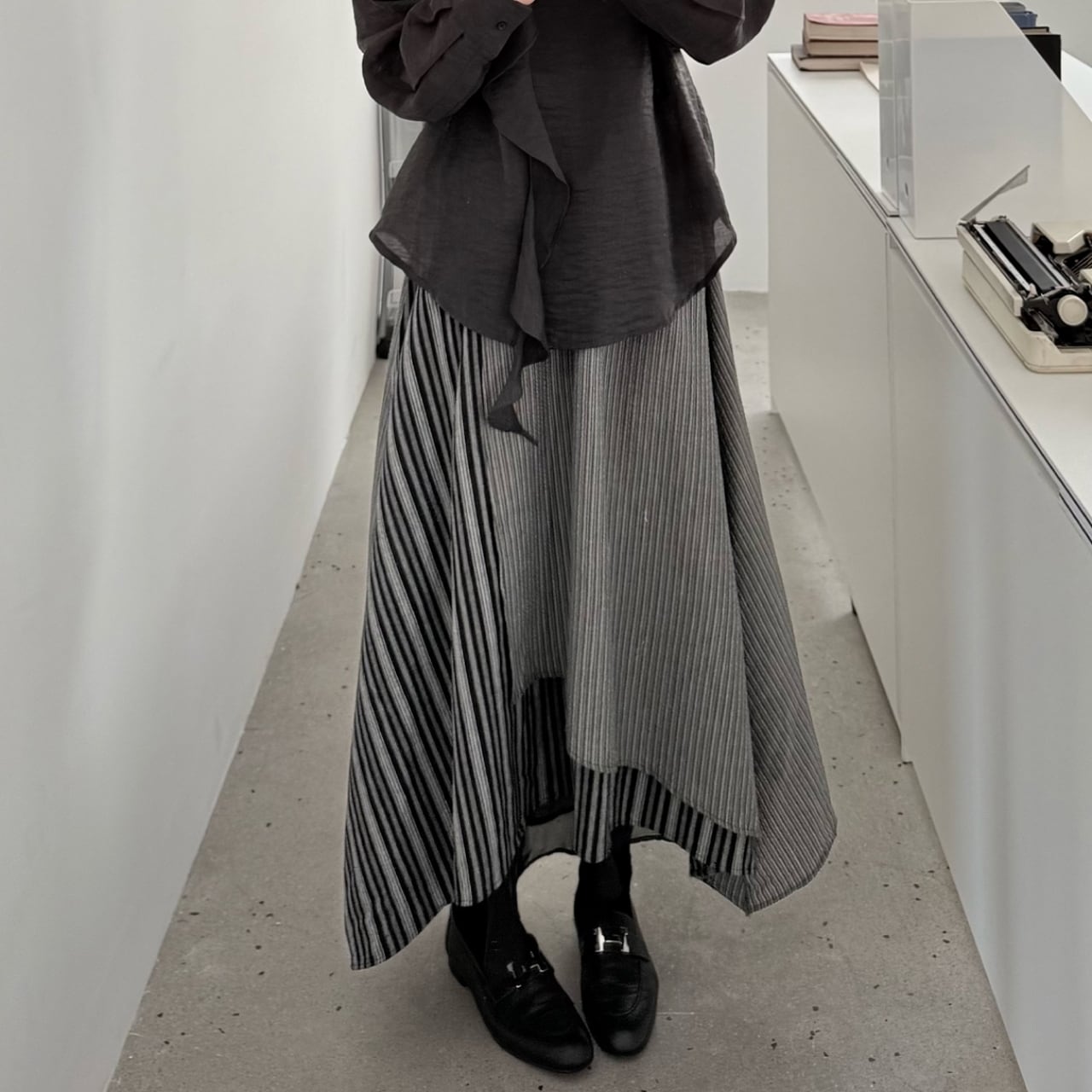 アシンメトリーな丈感で、コーディネートに個性をプラスします。