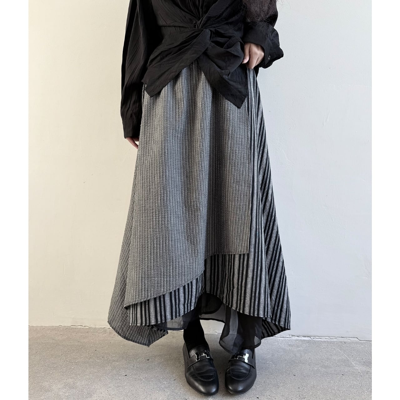 異なるストライプ生地を組み合わせた、デザイン性の高いスカート。