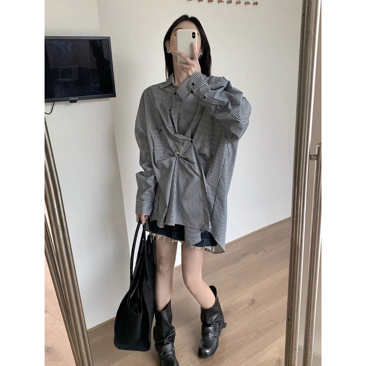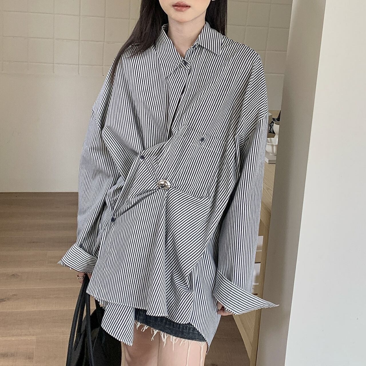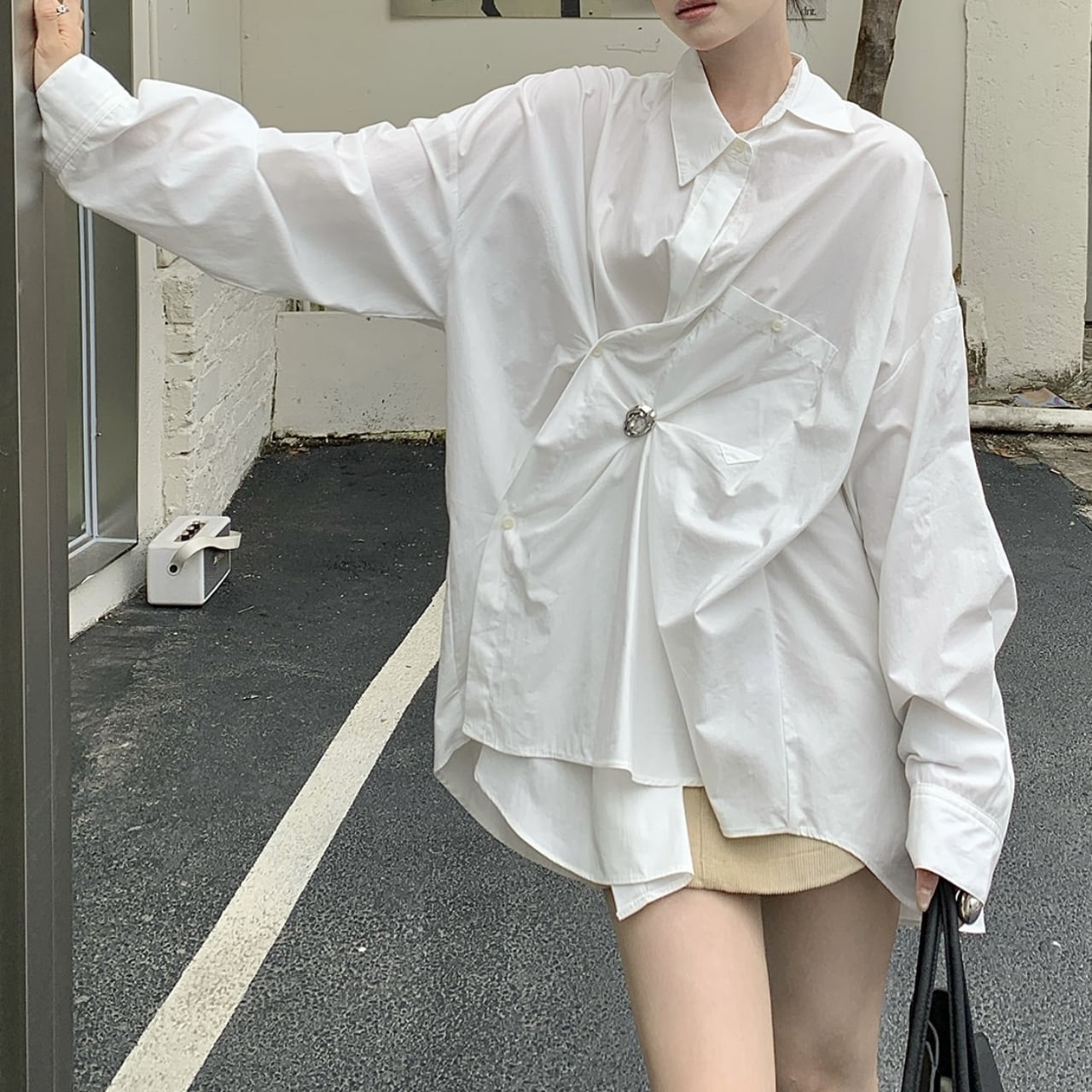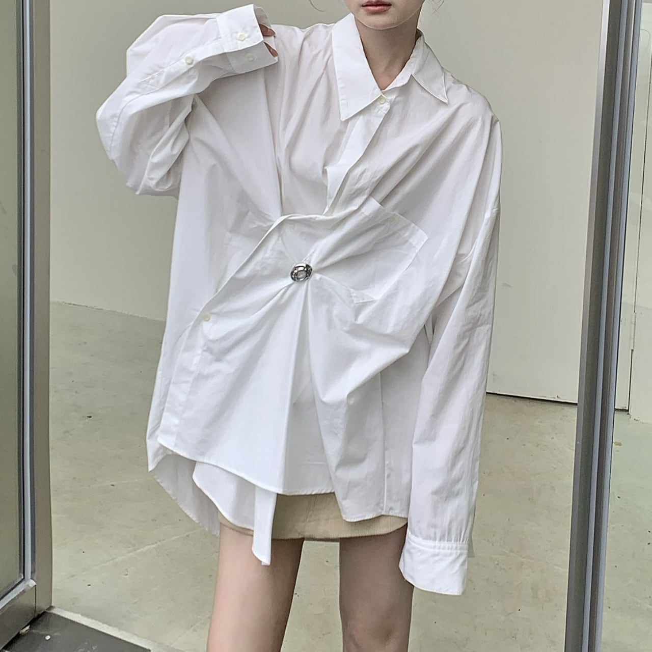 アシンメトリーなデザインが目を引くオーバーサイズシャツ。