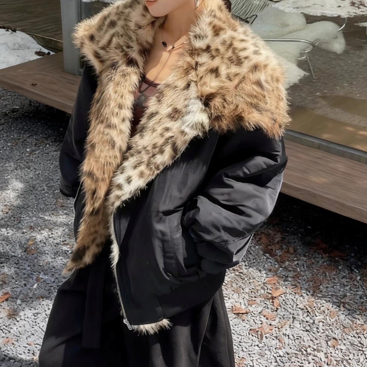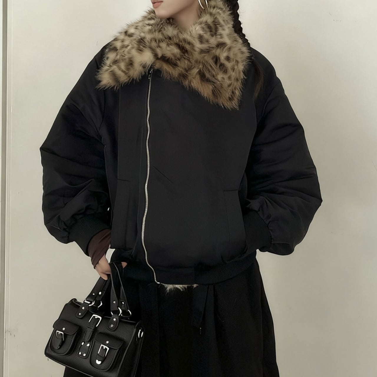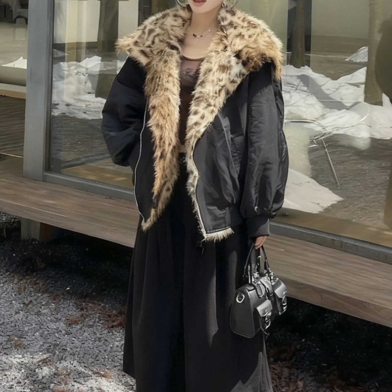 ファーカラーが顔まわりを明るく見せ、上品な印象を与えます。