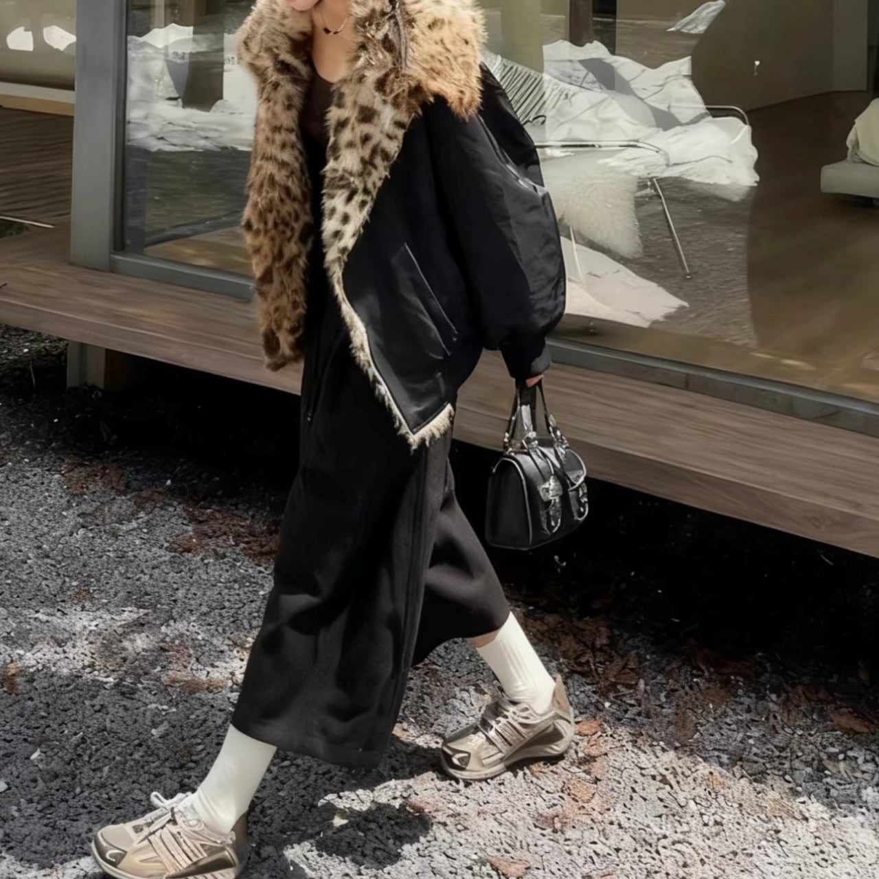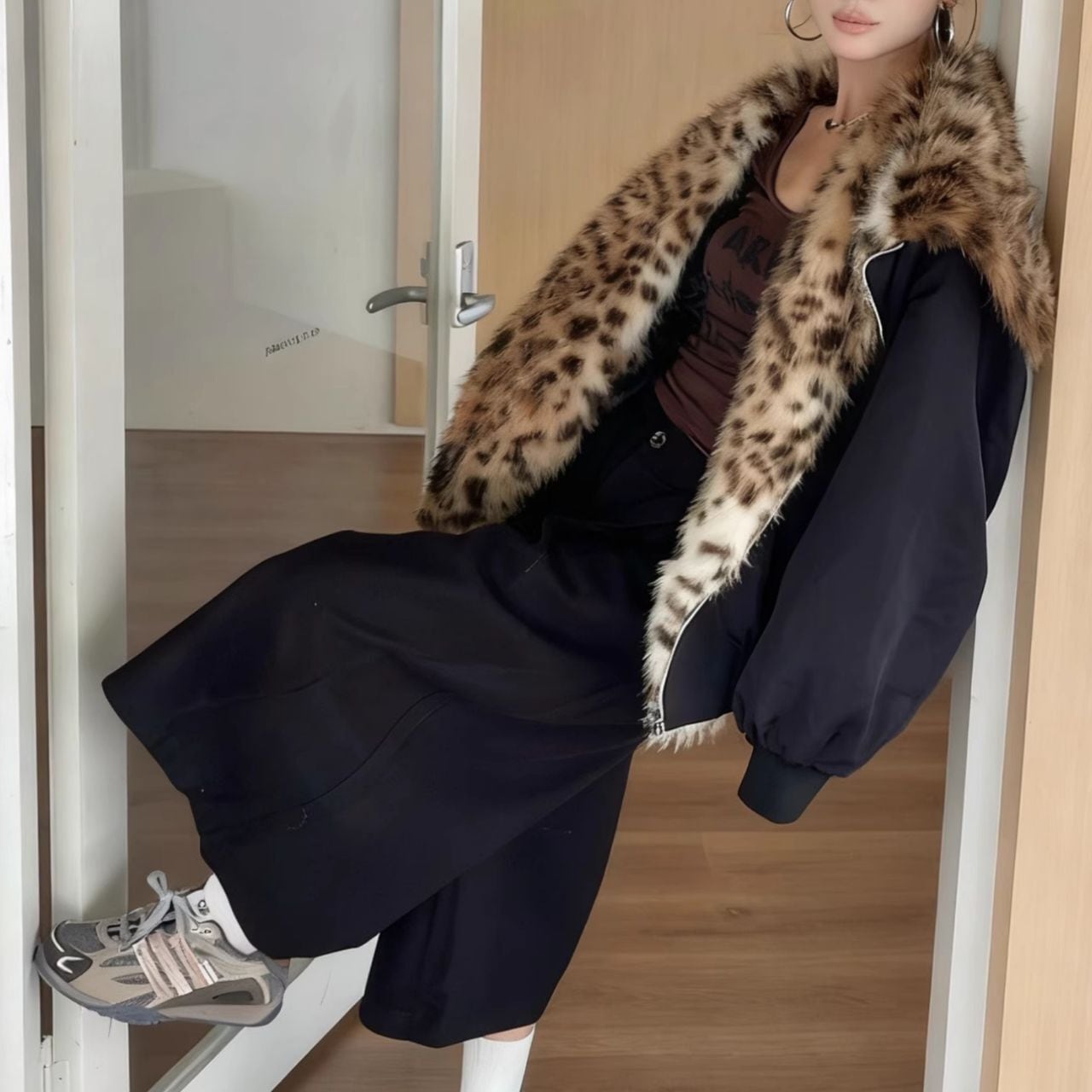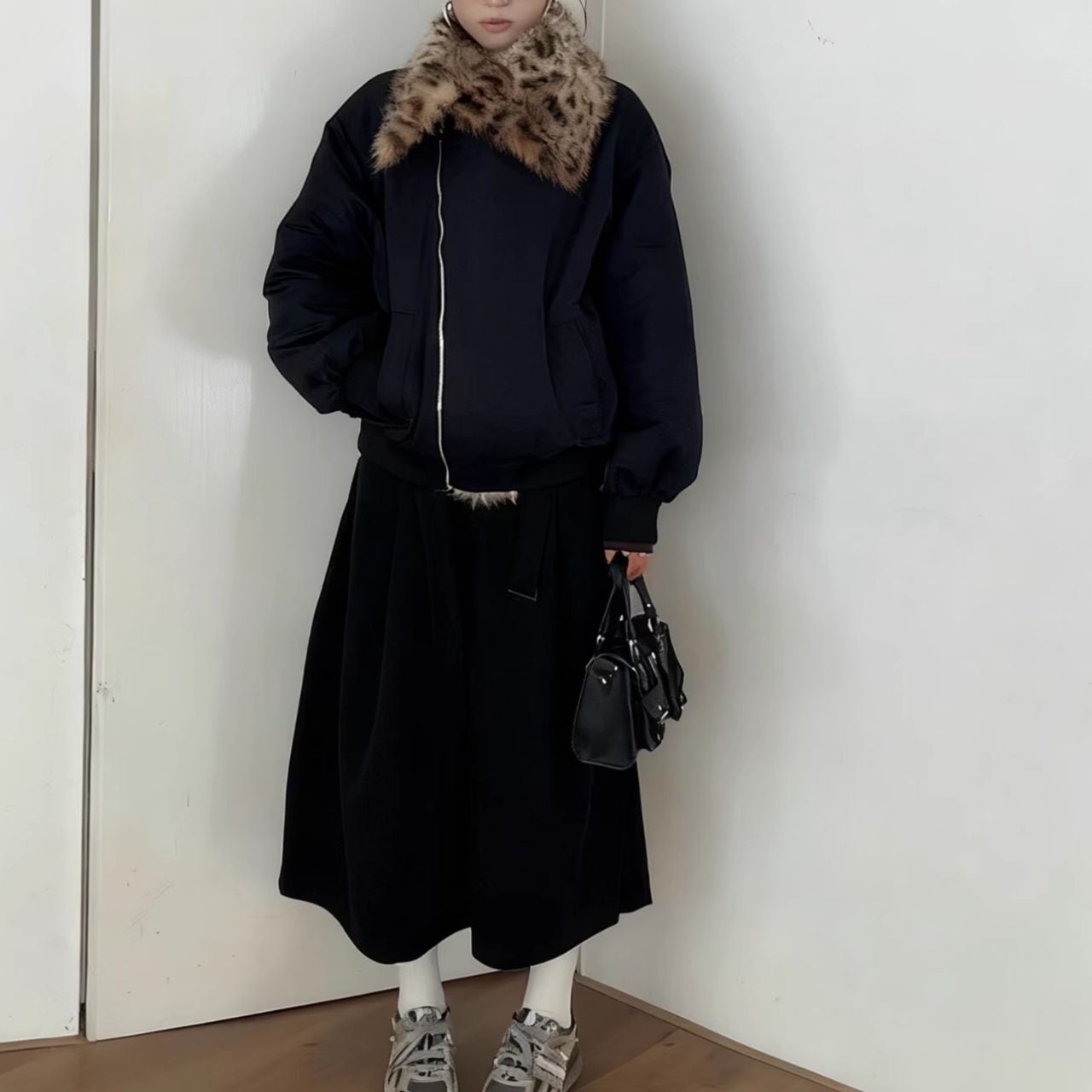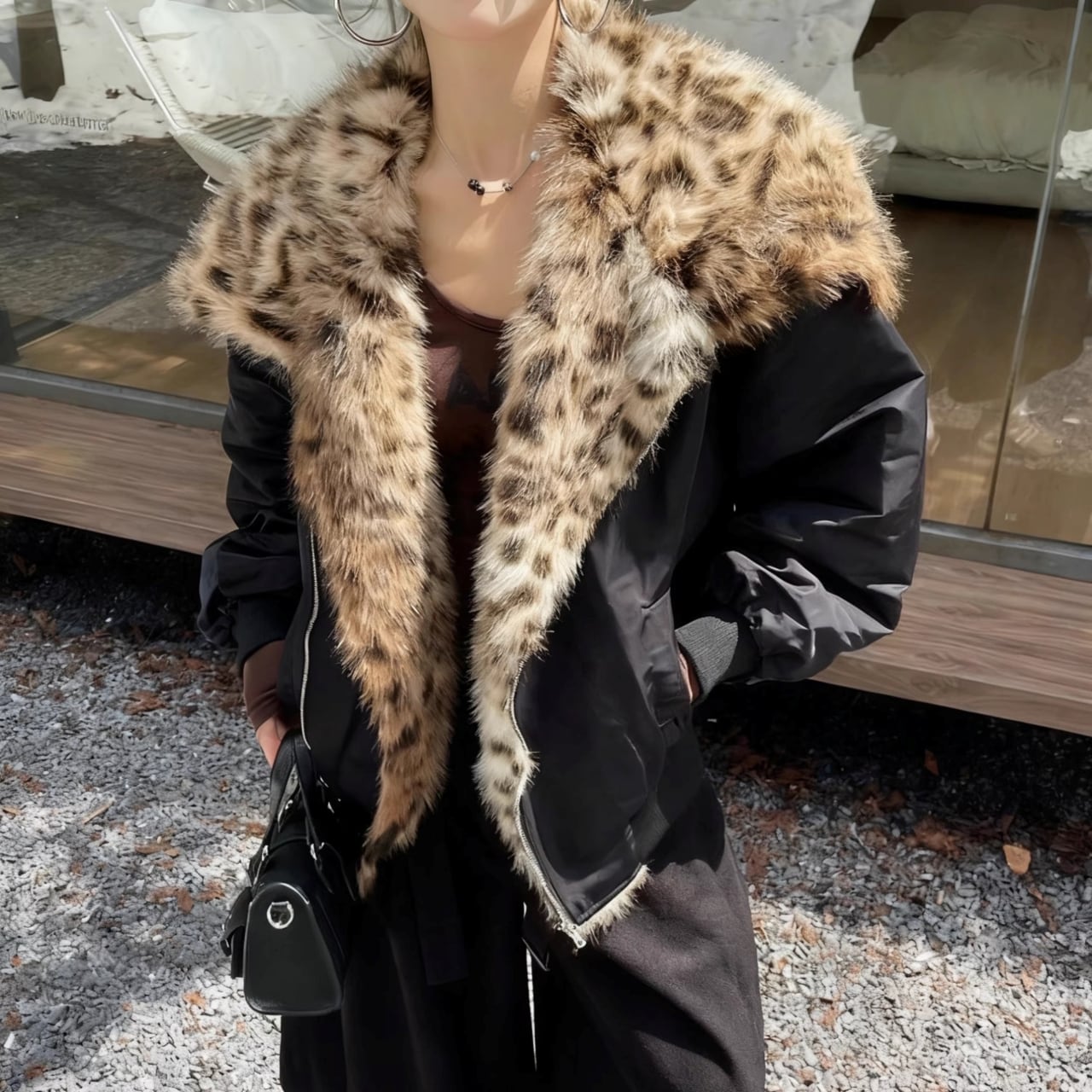 ファーカラーが顔まわりを明るく見せ、上品な印象を与えます。