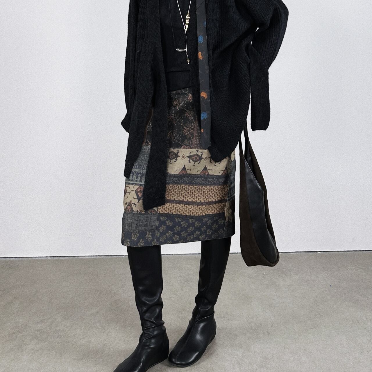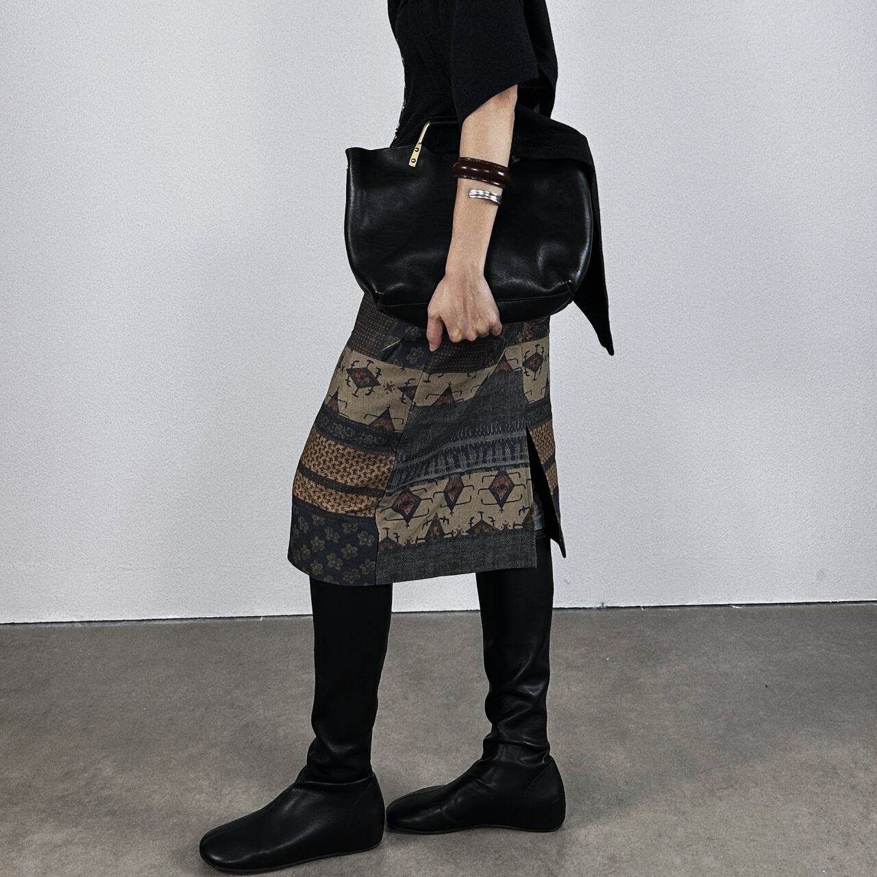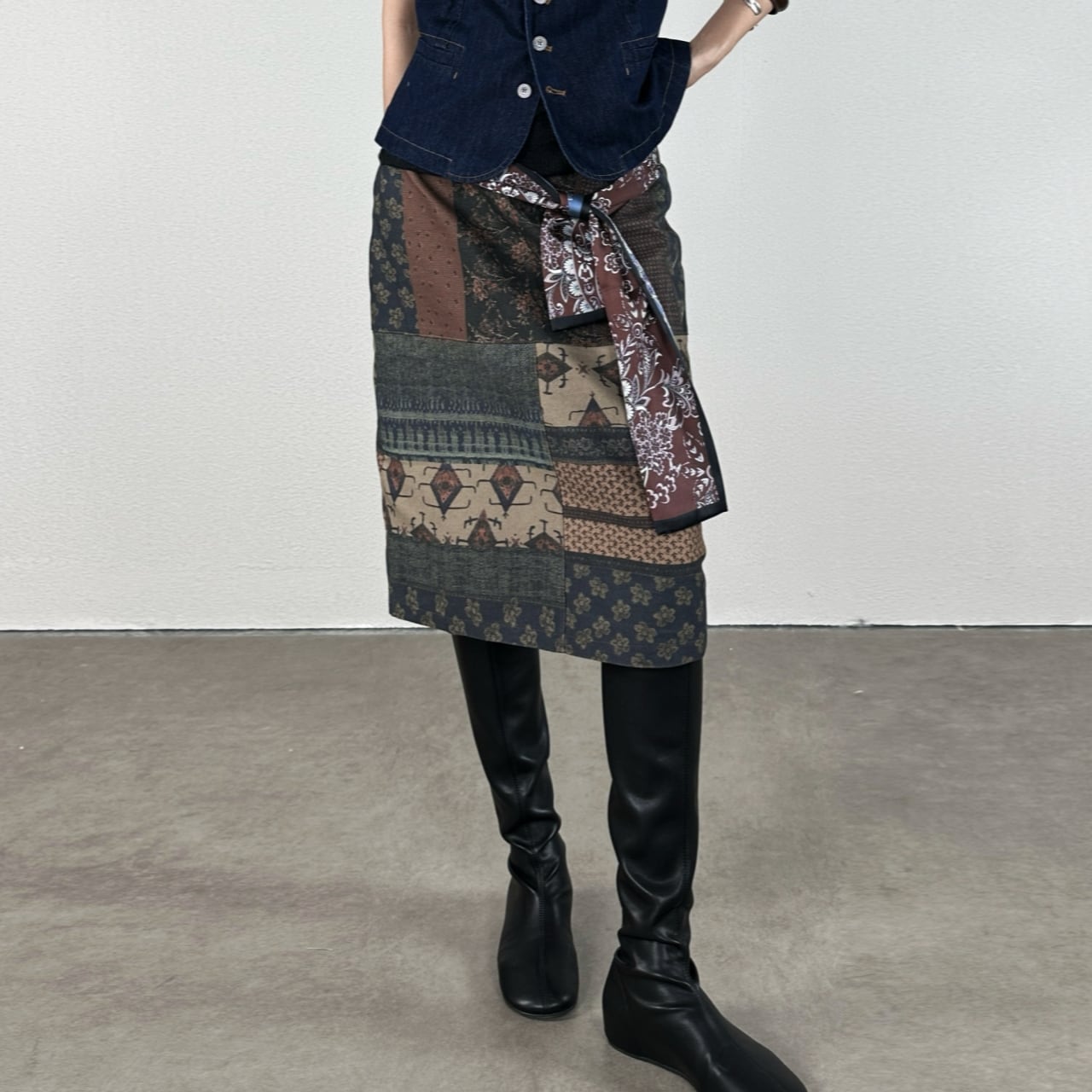 スタイリッシュなパッチワークデザインが特徴のミディ丈スカート。