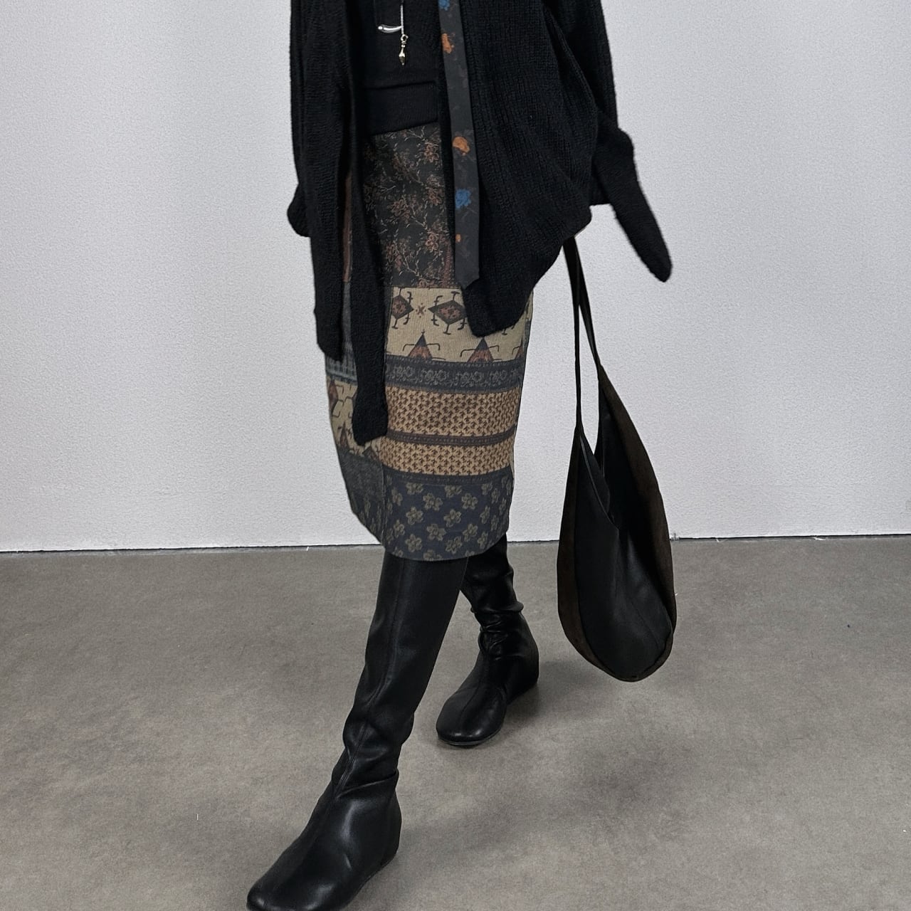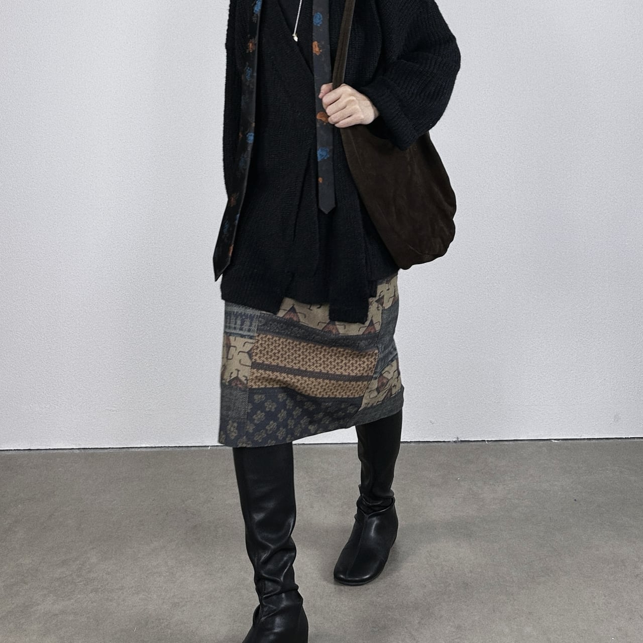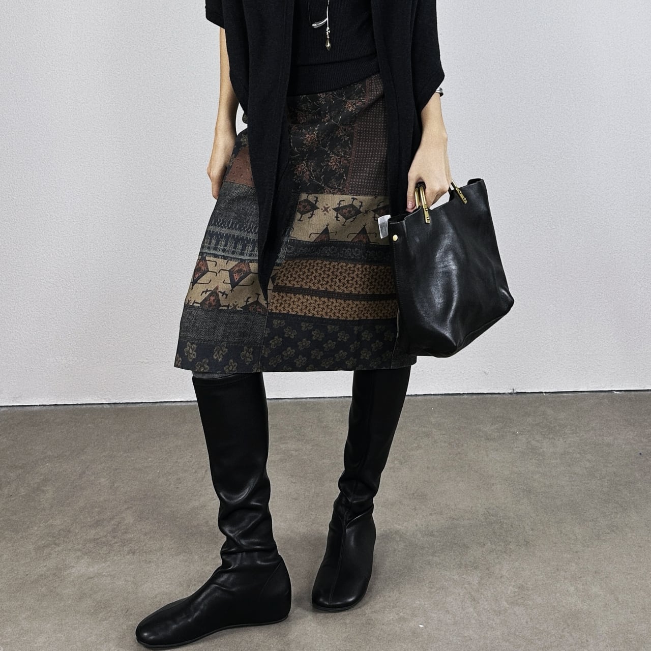 スタイリッシュなパッチワークデザインが特徴のミディ丈スカート。
