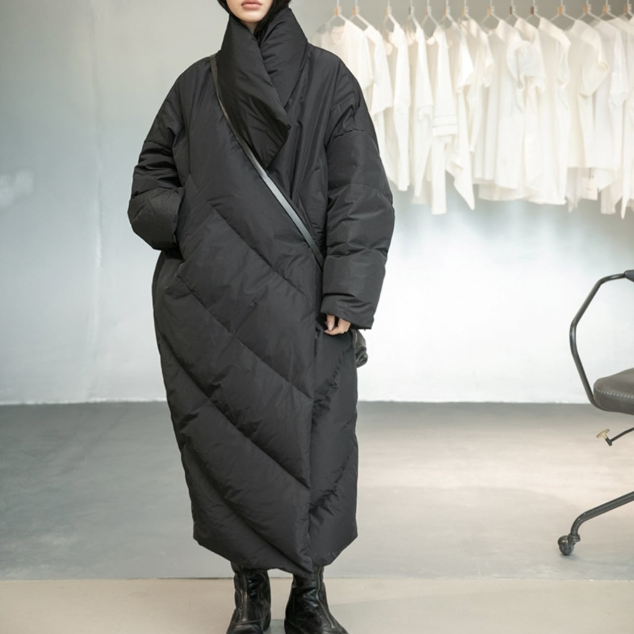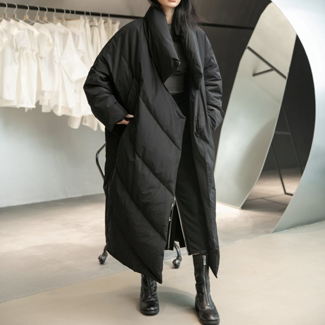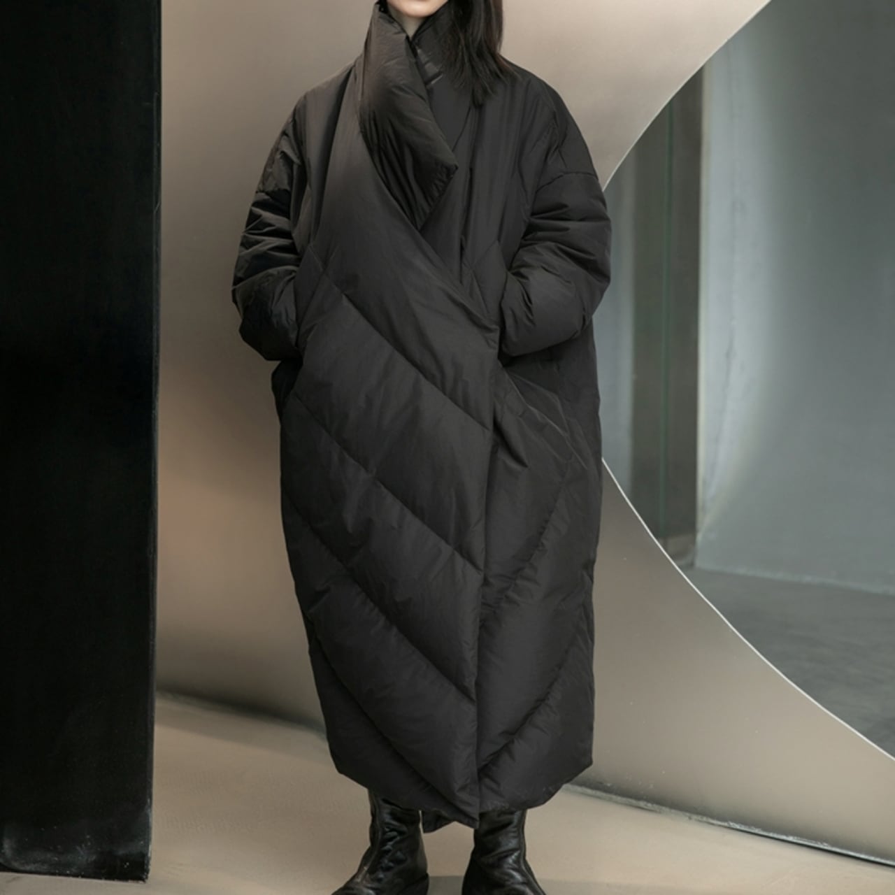 大胆なビッグシルエットが目を引くロングダウンコート。