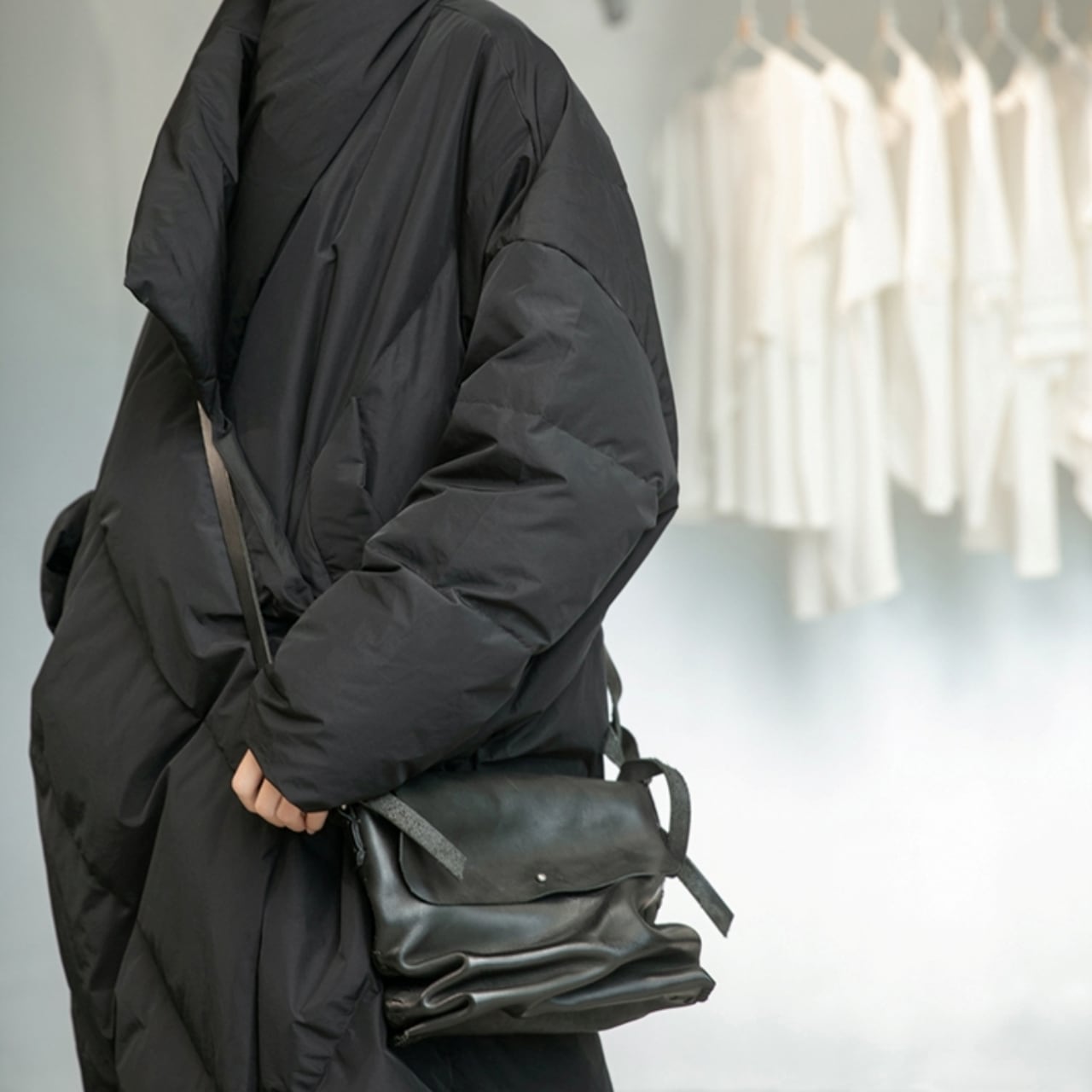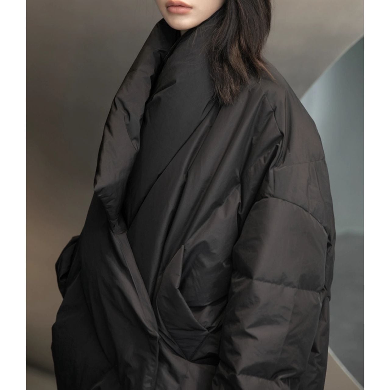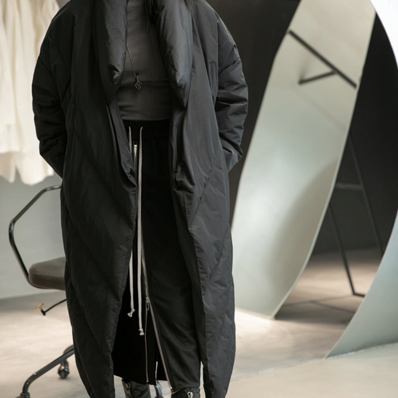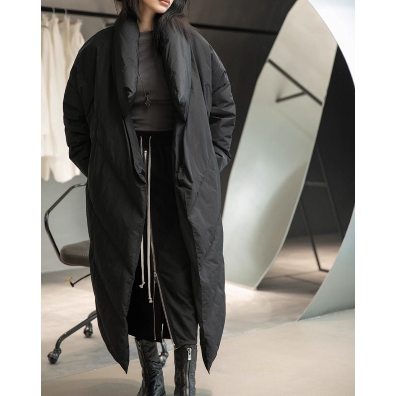 大胆なビッグシルエットが目を引くロングダウンコート。