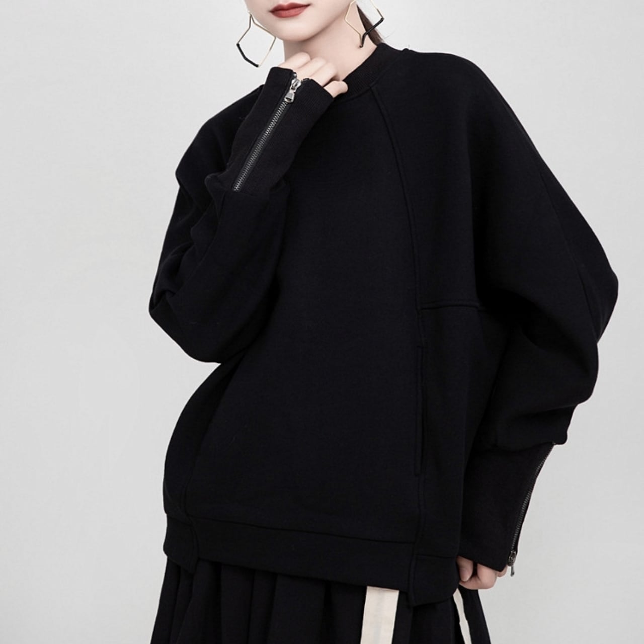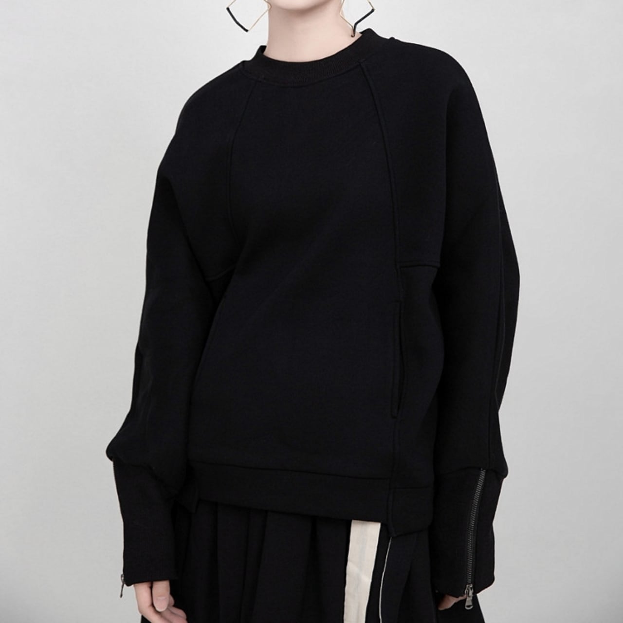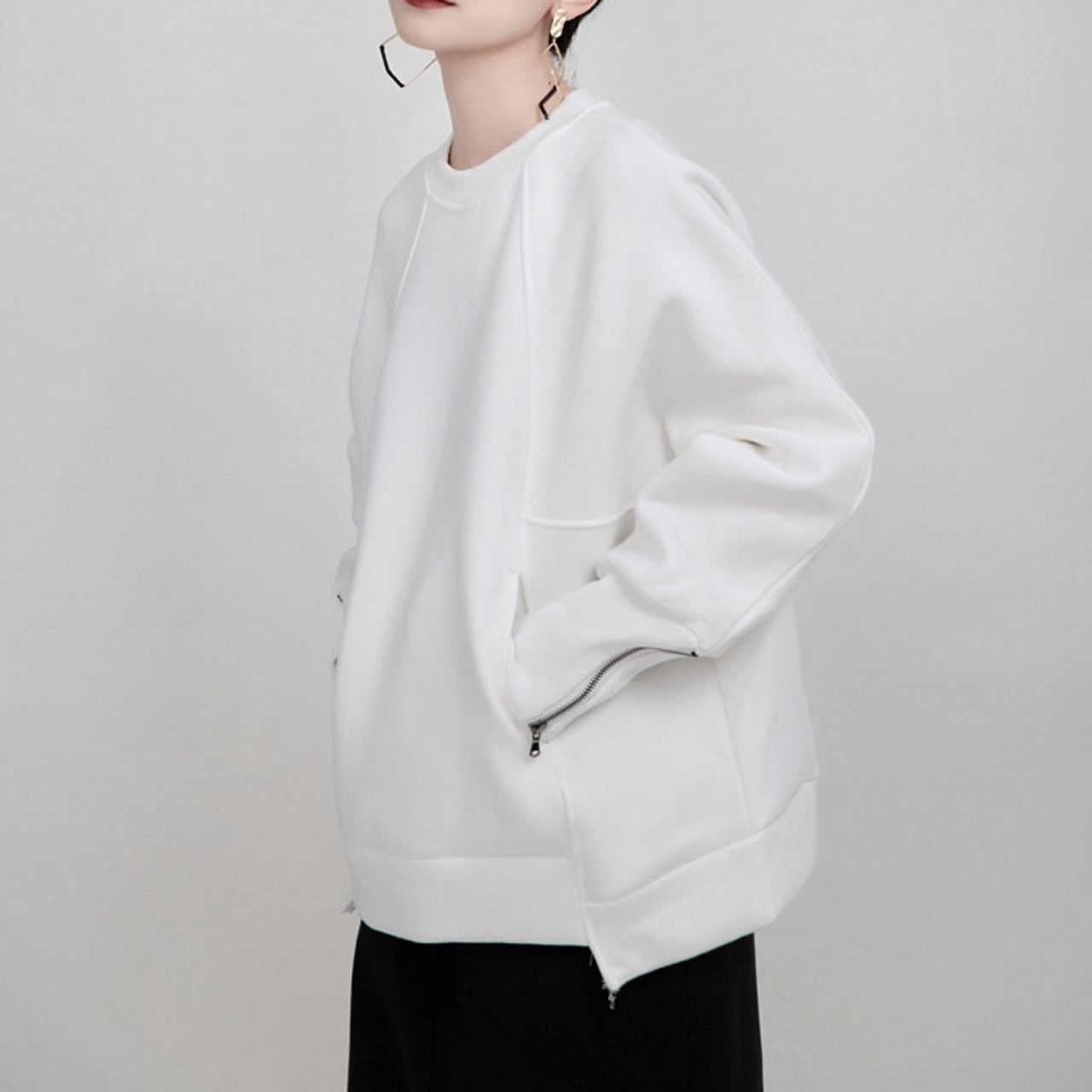 サイドジッパーが目を引く長袖スウェットシャツ。