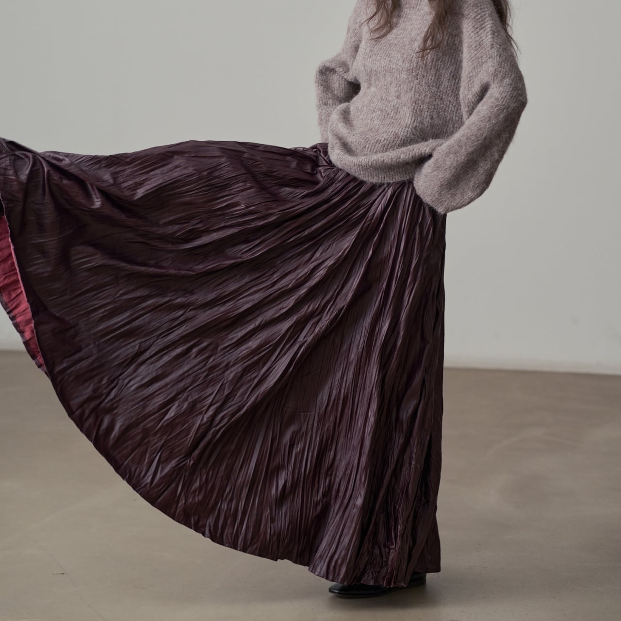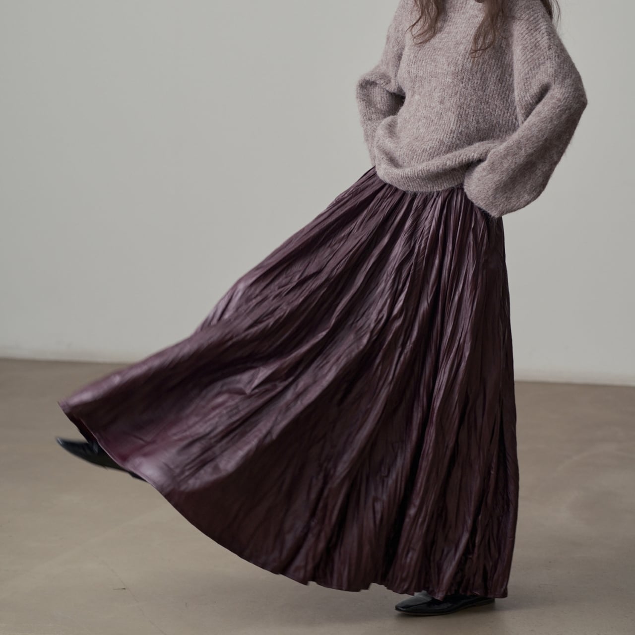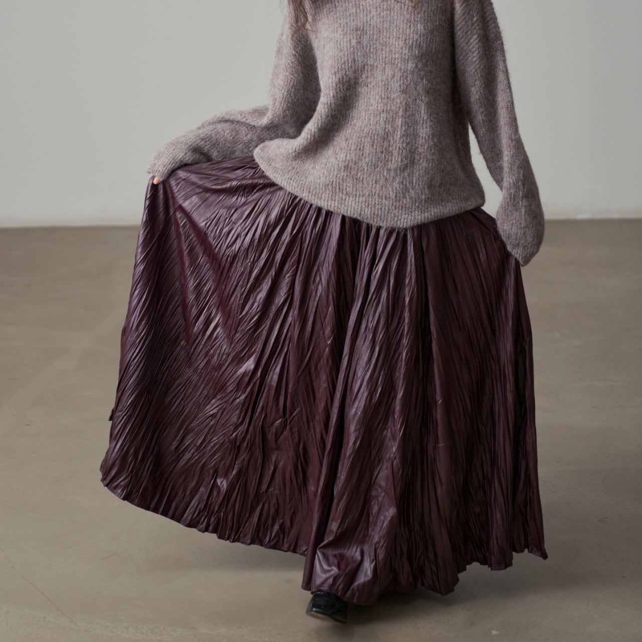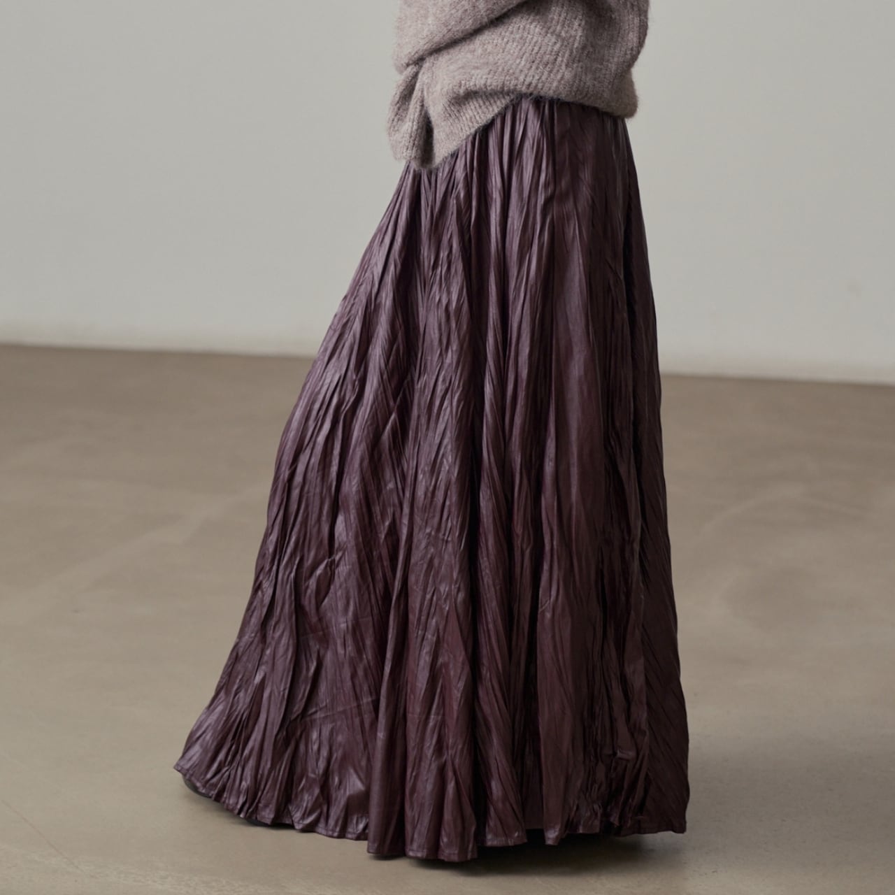 独特の加工が目を惹くマキシスカート。