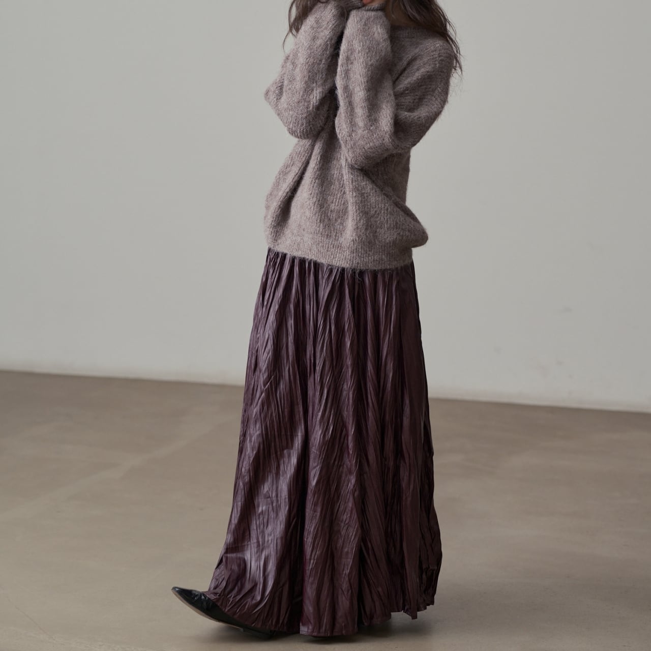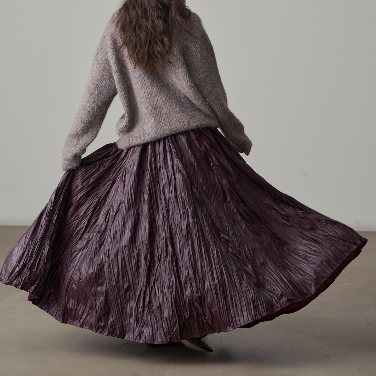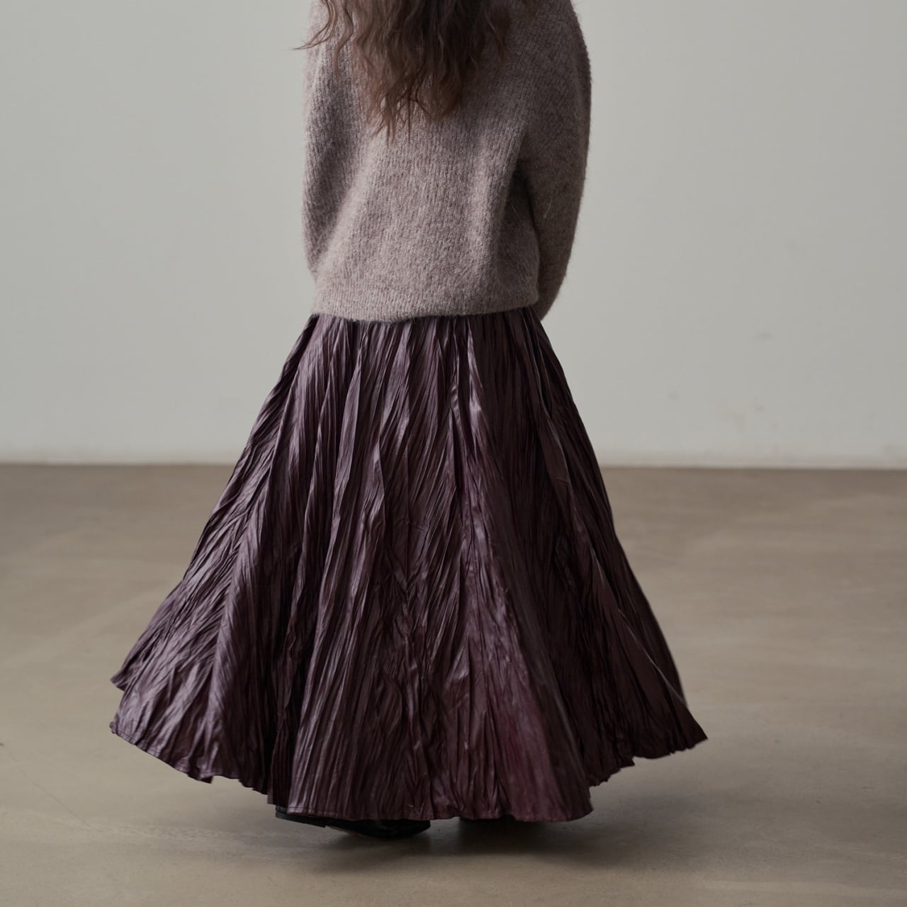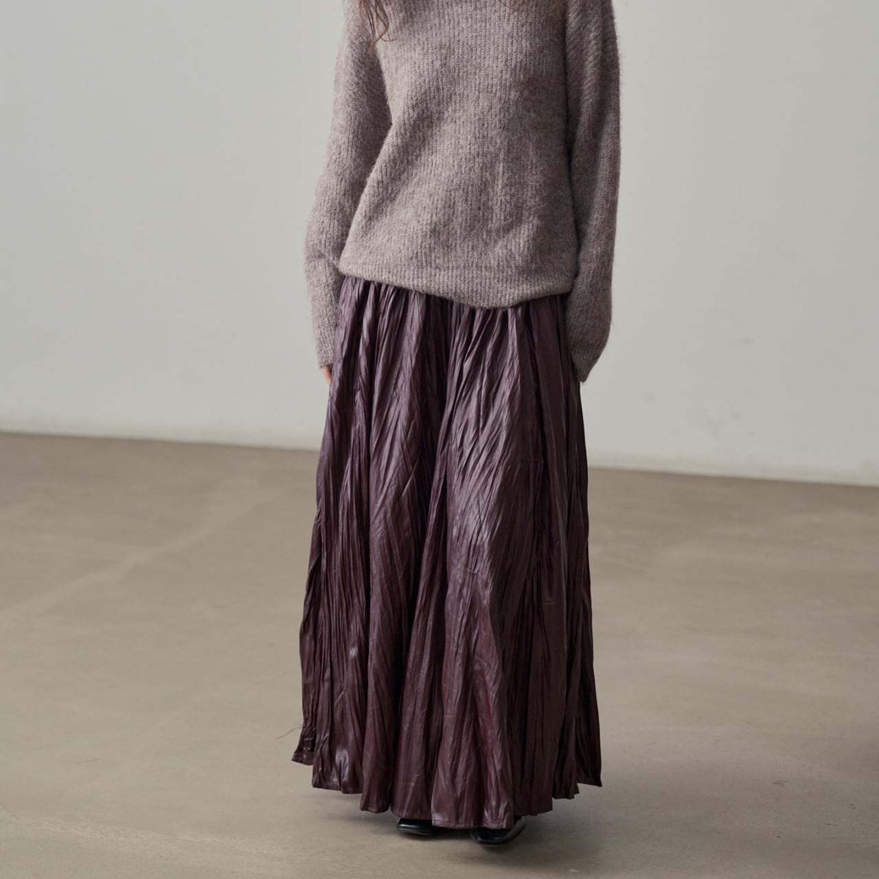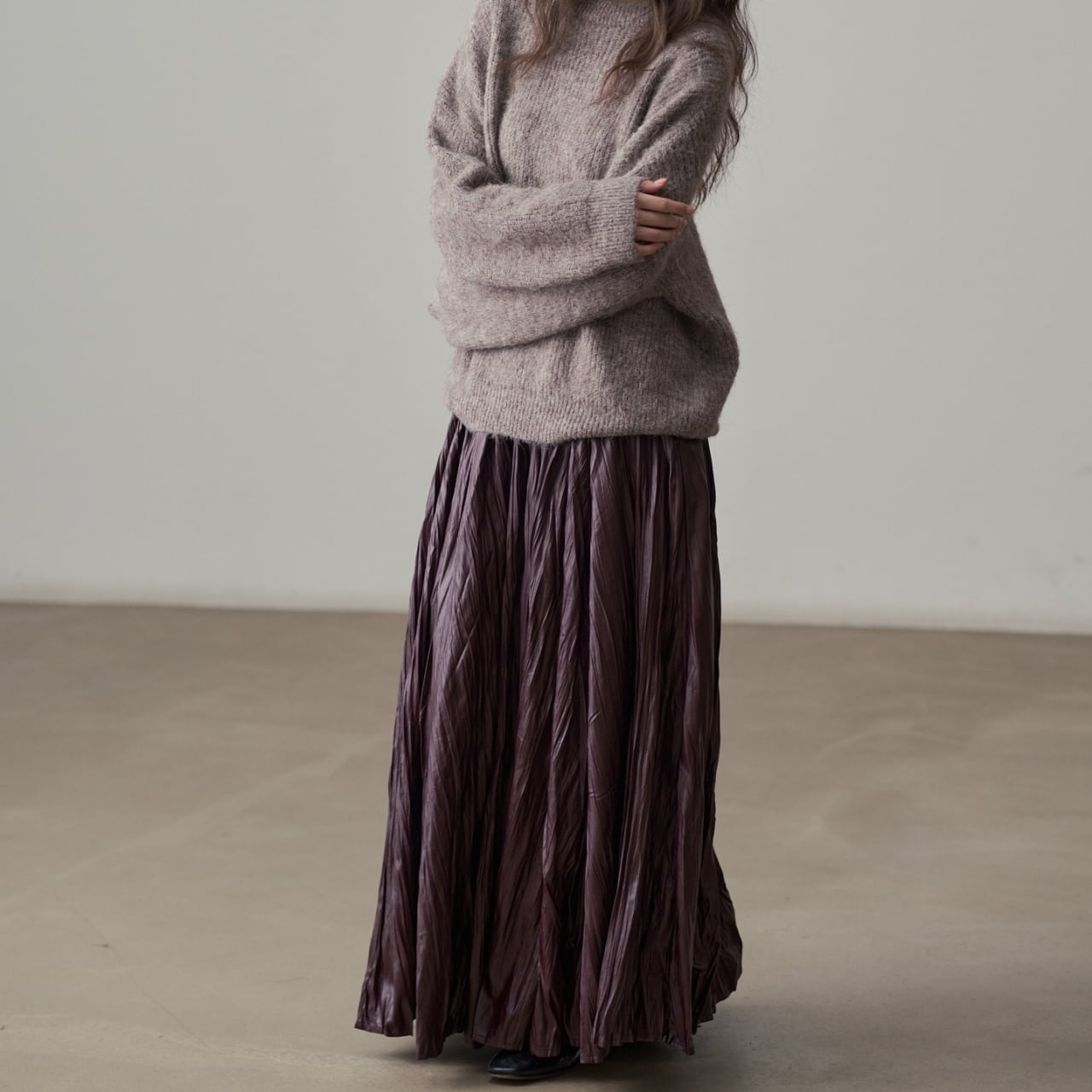 独特の加工が目を惹くマキシスカート。