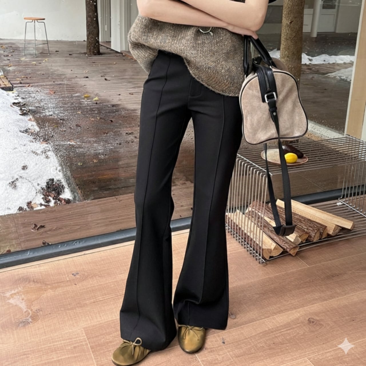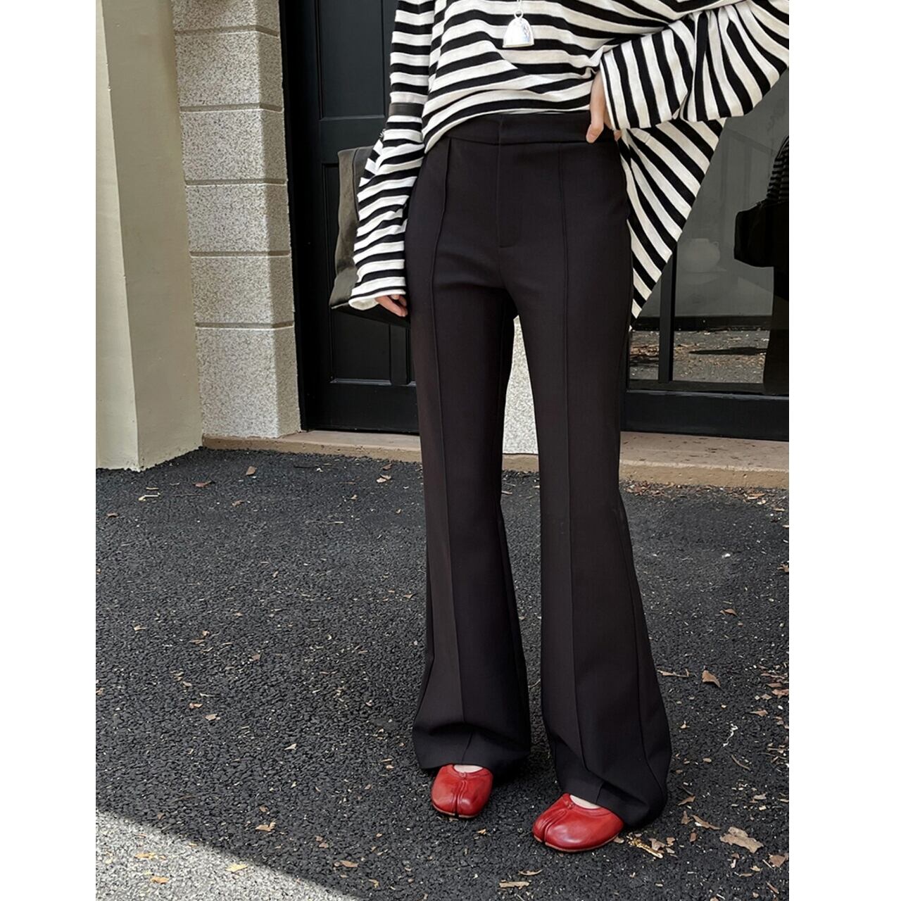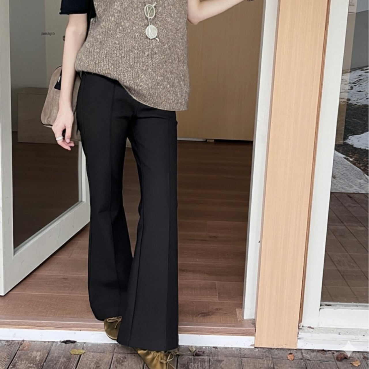 センタープレスが縦のラインを強調し、脚長効果をもたらすフレアロングパンツ。