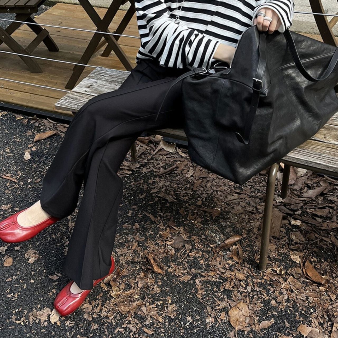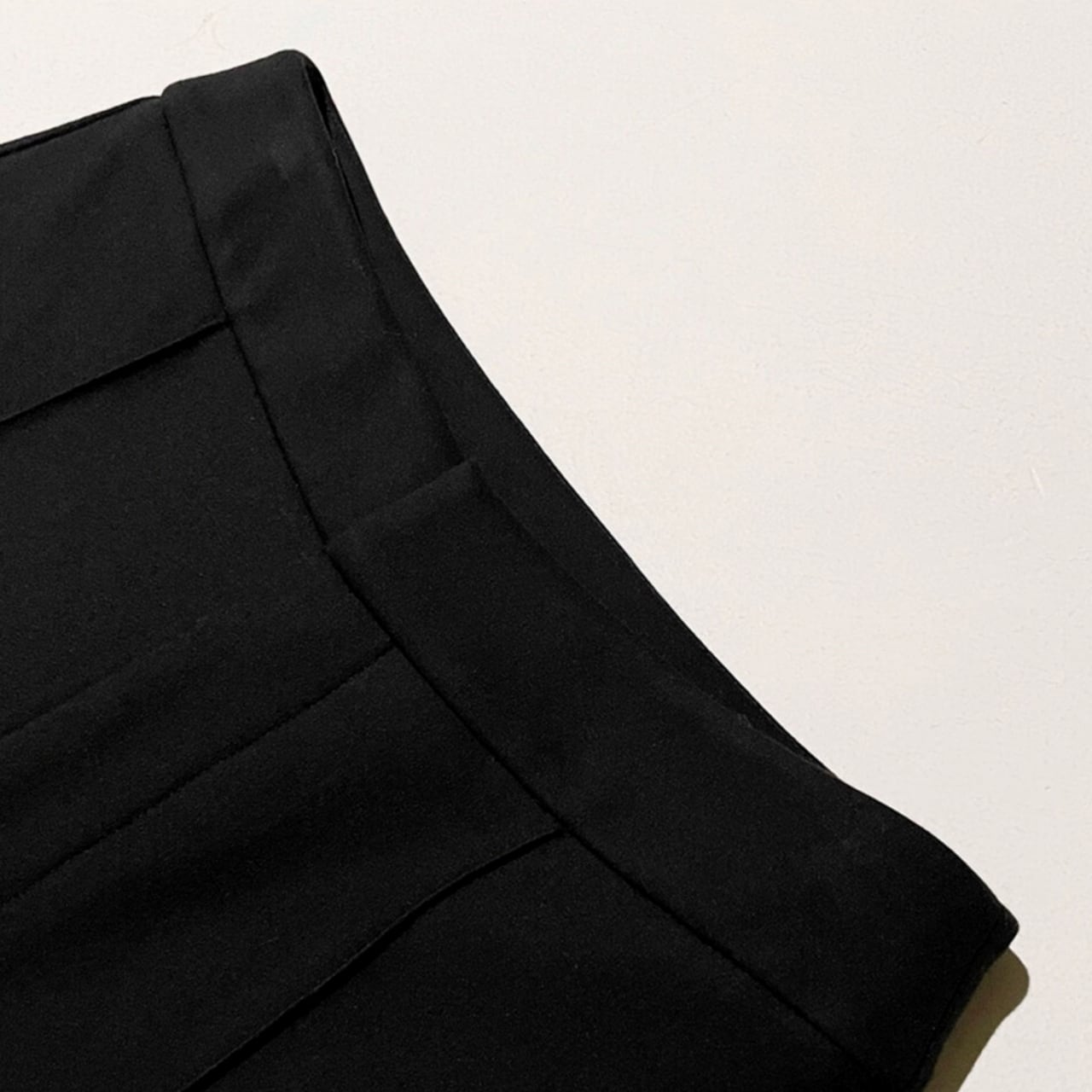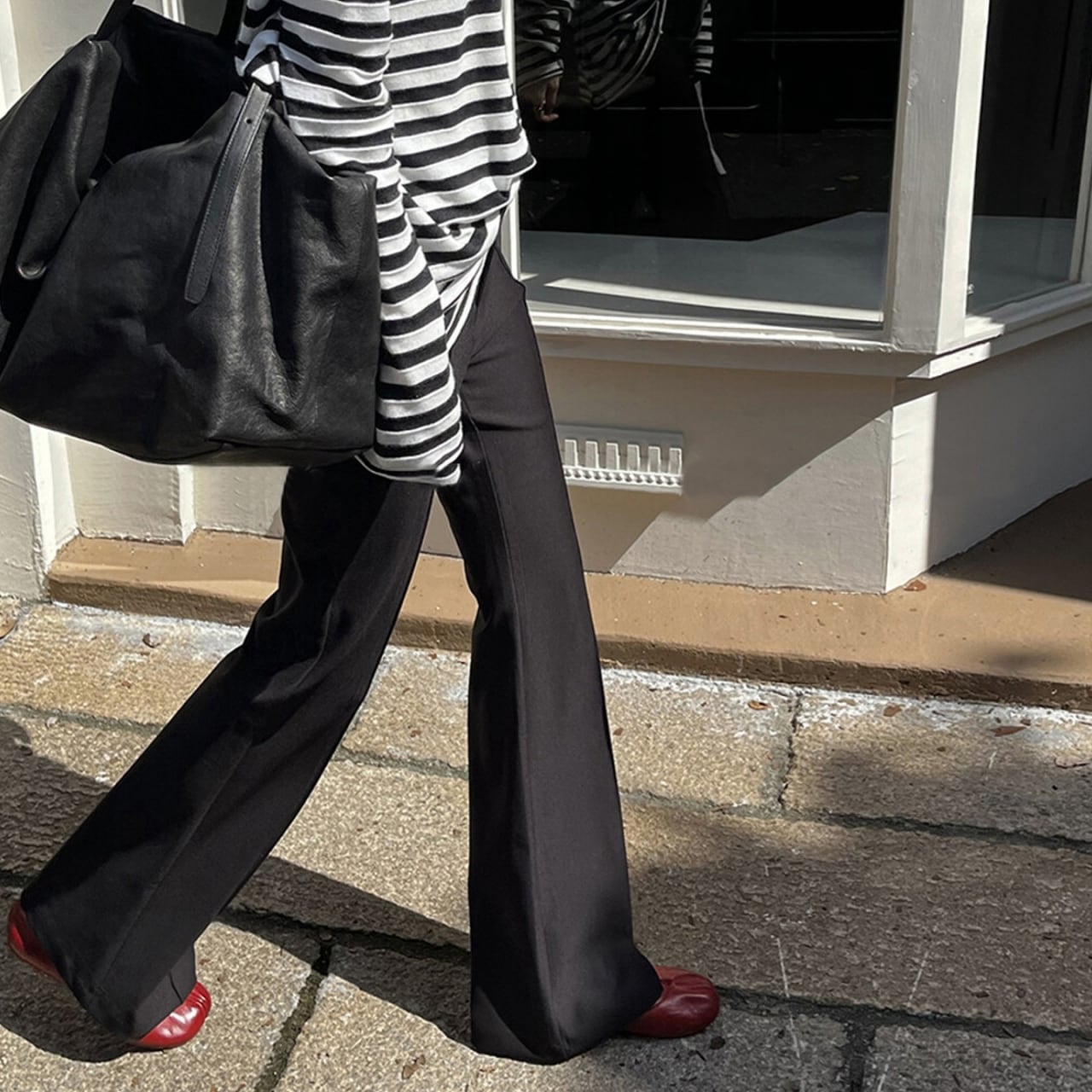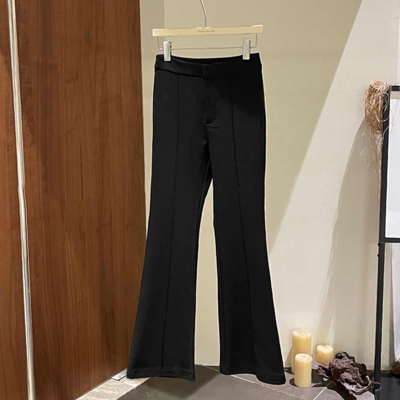 センタープレスが縦のラインを強調し、脚長効果をもたらすフレアロングパンツ。
