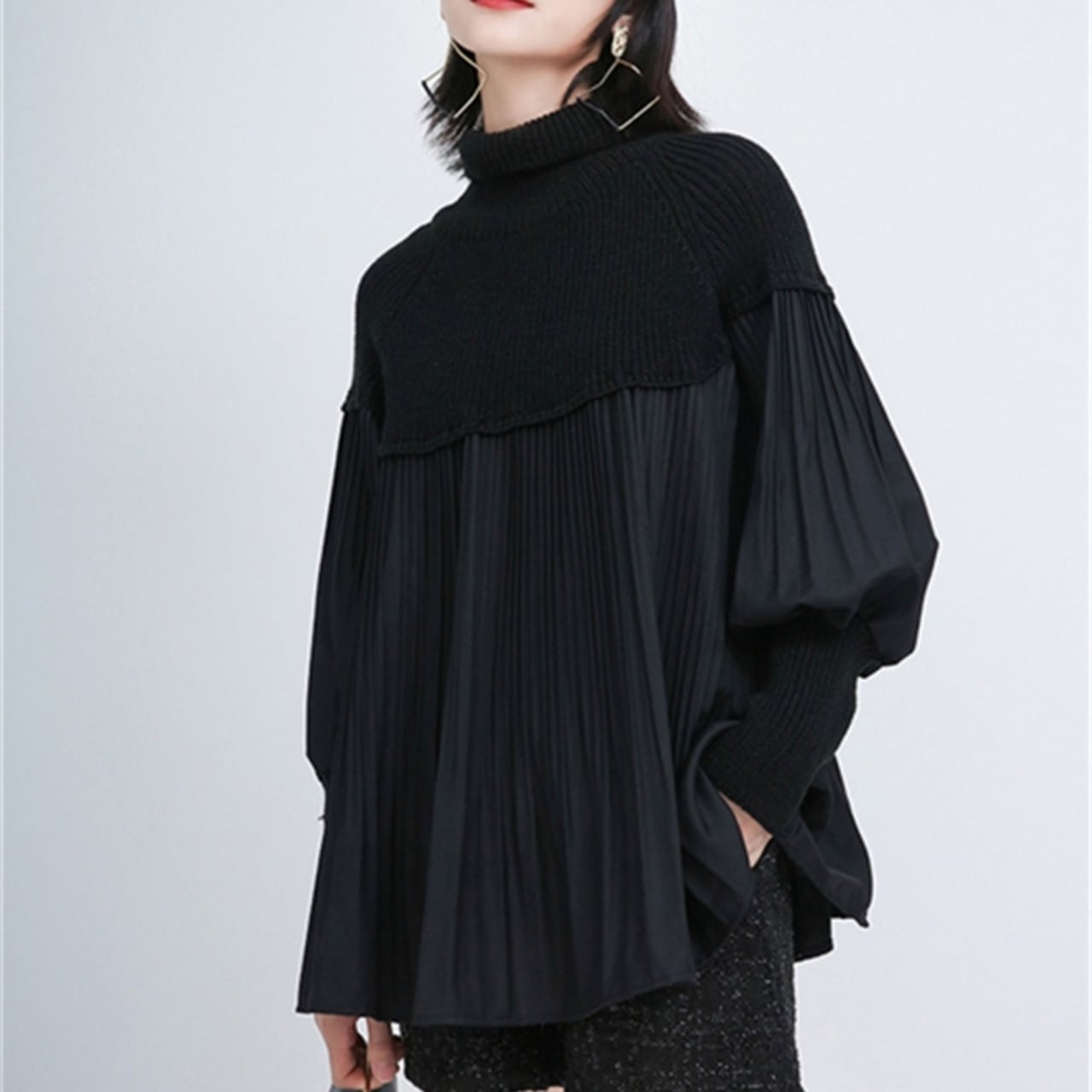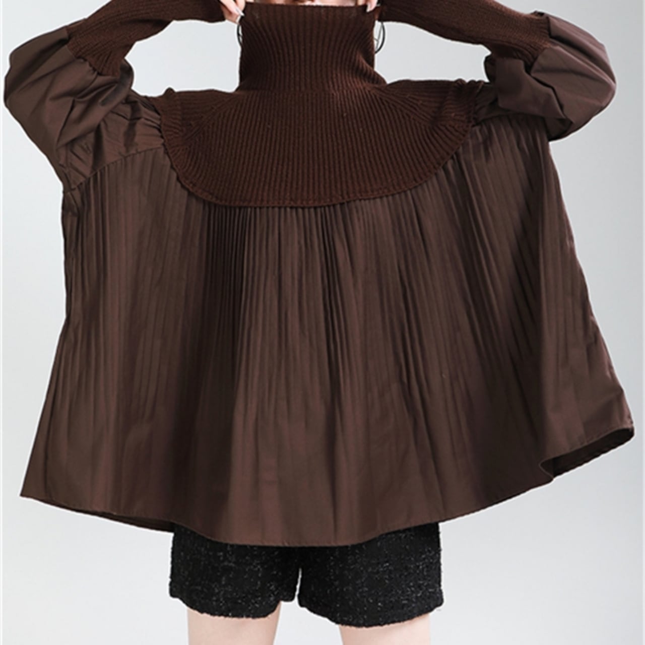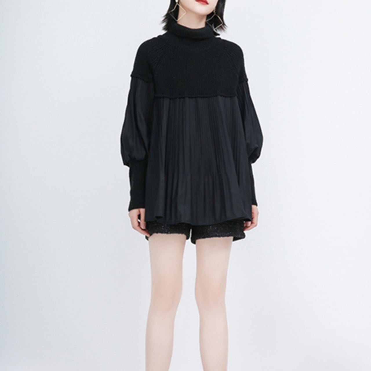 ニットと異素材を組み合わせた、ハイネックのチュニック丈プルオーバー。