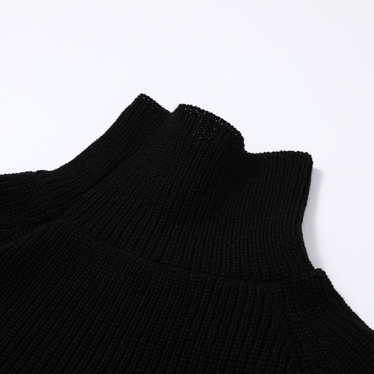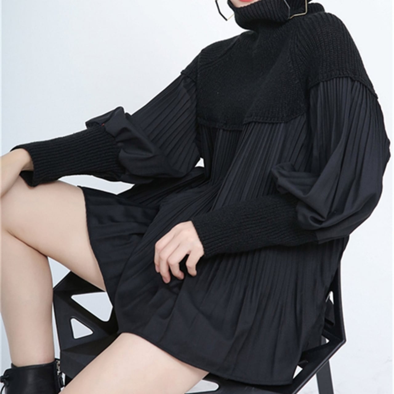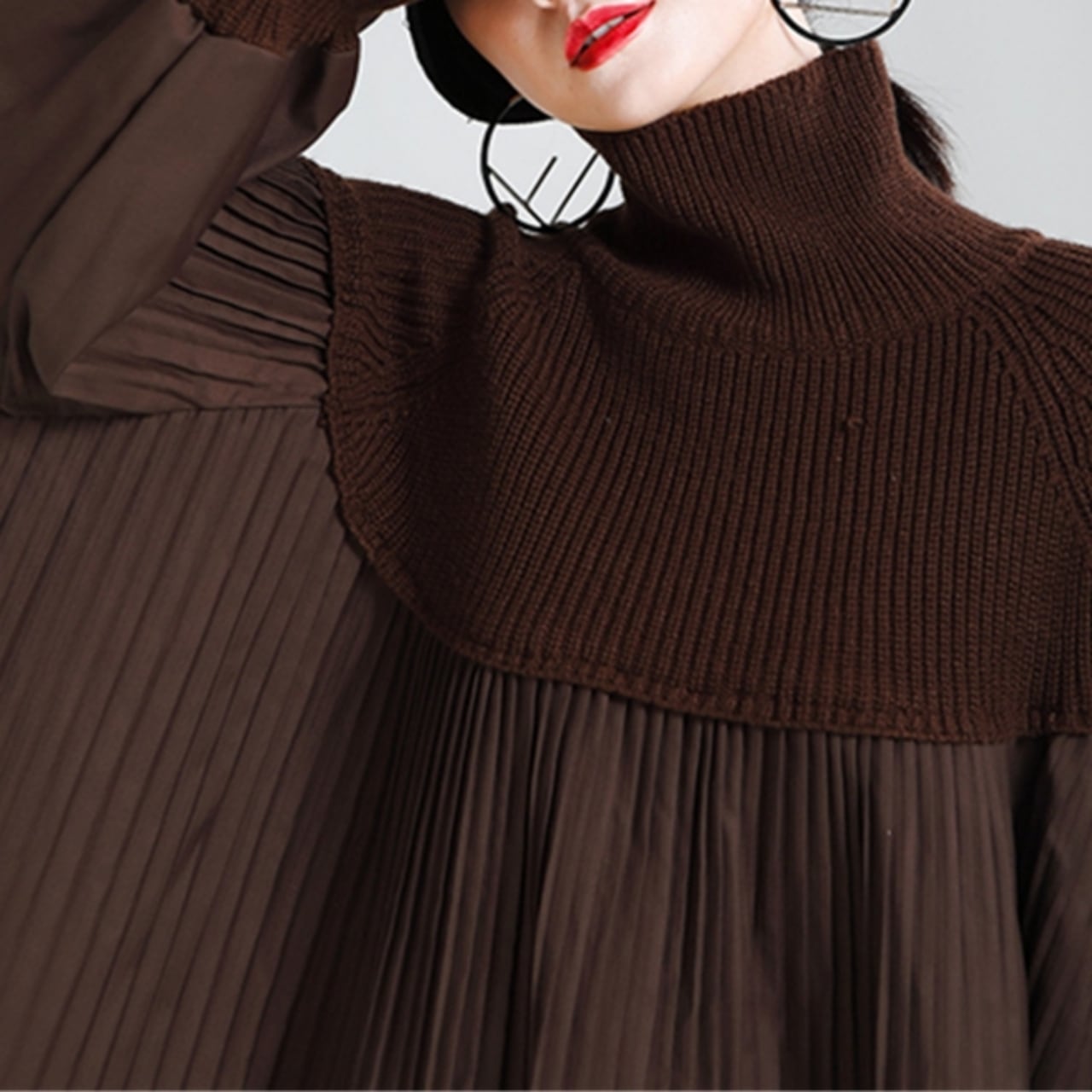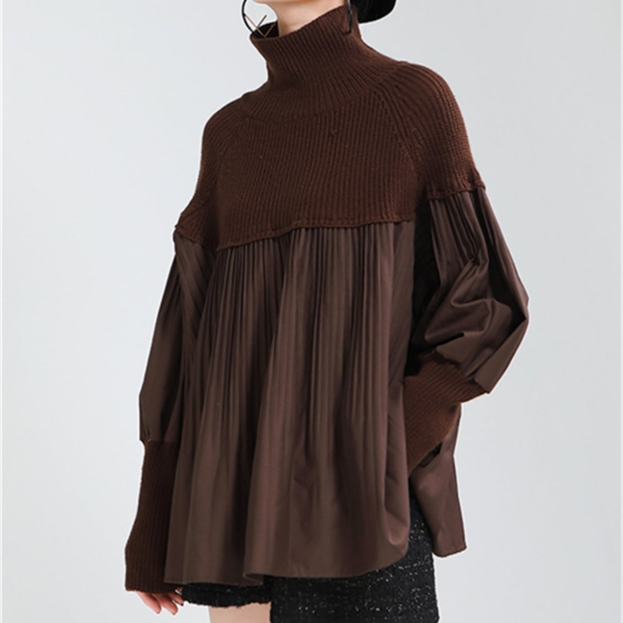 ニットと異素材を組み合わせた、ハイネックのチュニック丈プルオーバー。